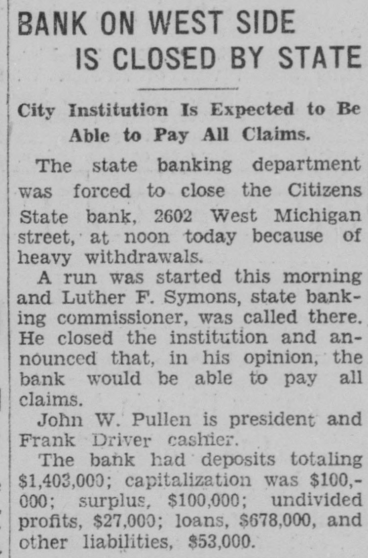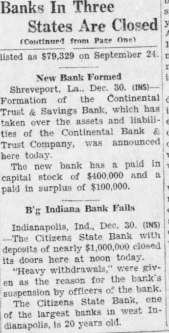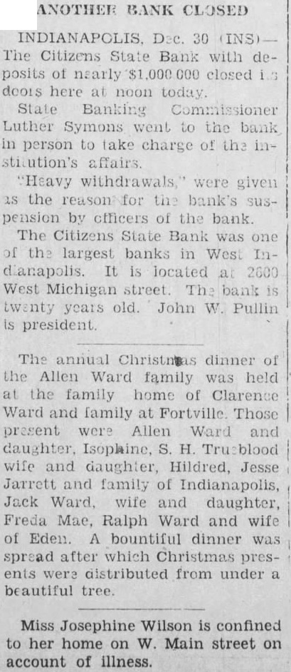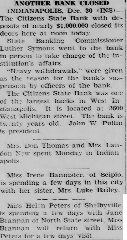 ANOTHER BANK CLOSED INDIANAPOLIS, Dec. 30 (INS)The Citizens State Bank with deposits of nearly $1,000.000 closed its doors here at noon today State Banking Commissioner Luther Symons went to the bank in person to take charge of the institution's affairs. "Heavy withdrawals." were given as the reason for the bank's suspension by officers of the bank. The Citizens State Bank was one of the largest banks in West Indianapolis. It is located a: 2600 West Michigan street. The bank is twenty years old. John W. Pullin is president. Mrs. Don Thomas and Mrs. Landon New spent Monday in Indianapolis. Miss Irene Bannister. of Scipio, is spending a few days in this city with her sister. Mrs. Luke Bailey. Miss Helen Peters of Shelbyville is spending a few days with Jane Brannan of North State street. Miss Brannan will return with Miss Peters for a few days visit