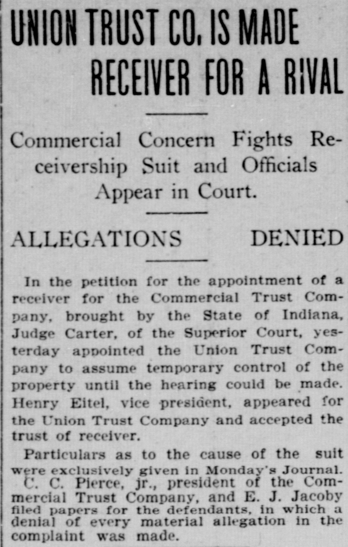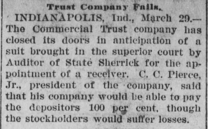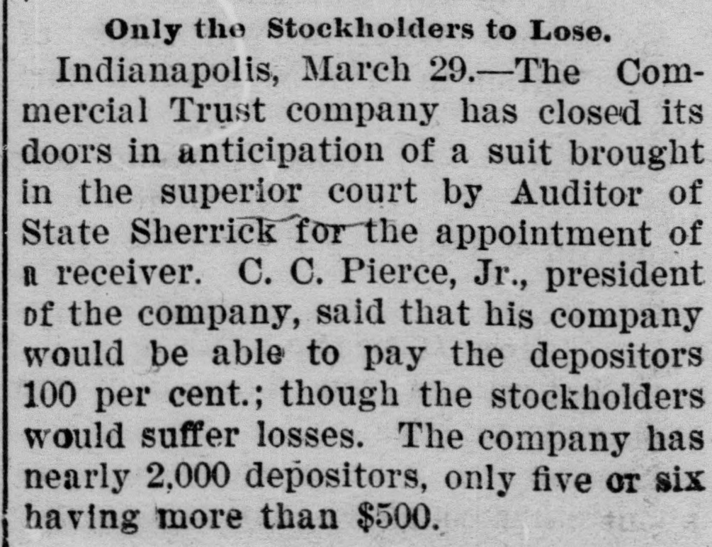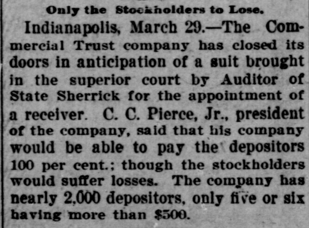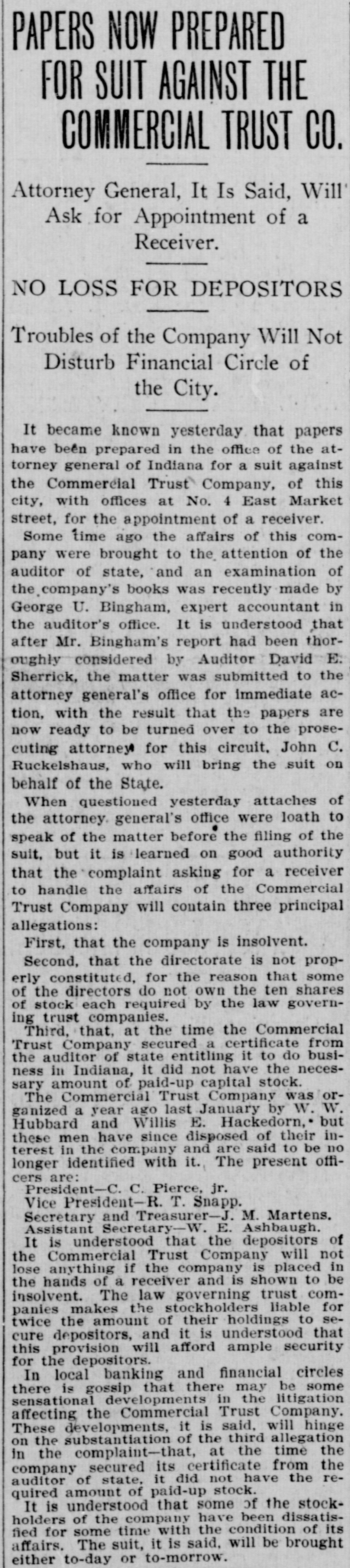PAPERS NOW PREPARED FOR SUIT AGAINST THE COMMERCIAL TRUST CO. Attorney General, It Is Said, Will Ask for Appointment of a Receiver. NO LOSS FOR DEPOSITORS Troubles of the Company Will Not Disturb Financial Circle of the City. It became known yesterday that papers have been prepared in the office of the attorney general of Indiana for a suit against the Commercial Trust Company, of this city, with offices at No. 4 East Market street, for the appointment of a receiver. Some time ago the affairs of this company were brought to the attention of the auditor of state, and an examination of the company's books was recently made by George U. Bingham, expert accountant in the auditor's office. It is understood that after Mr. Bingham's report had been thoroughly considered by Auditor David E. Sherrick, the matter was submitted to the attorney general's office for immediate action, with the result that the papers are now ready to be turned over to the prosecuting attorney for this circuit. John C. Ruckelshaus, who will bring the suit on behalf of the State. When questioned yesterday attaches of the attorney. general's office were loath to speak of the matter before the filing of the suit, but it is learned on good authority that the complaint asking for a receiver to handle the affairs of the Commercial Trust Company will contain three principal allegations: First, that the company is insolvent. Second, that the directorate is not properly constituted, for the reason that some of the directors do not own the ten shares of stock each required by the law governing trust companies. Third, that, at the time the Commercial Trust Company secured a certificate from the auditor of state entitling it to do business in Indiana, it did not have the necessary amount of paid-up capital stock. The Commercial Trust Company was organized a year ago last January by W. W. Hubbard and Willis E. Hackedorn, but these men have since disposed of their interest in the company and are said to be no longer identified with it. The present officers are: President-C. C. Pierce, jr. Vice President-R. T. Snapp. Secretary and Treasurer-J. M. Martens. Assistant Secretary-W. E. Ashbaugh. It is understood that the depositors of the Commercial Trust Company will not lose anything if the company is placed in the hands of a receiver and is shown to be insolvent. The law governing trust companies makes the stockholders liable for twice the amount of their holdings to secure depositors, and it is understood that this provision will afford ample security for the depositors. In local banking and financial circles there is gossip that there may be some sensational developments in the litigation affecting the Commercial Trust Company. These developments, it is said, will hinge on the substantiation of the third allegation in the complaint-that, at the time the company secured its certificate from the auditor of state, it did not have the required amount of paid-up stock. It is understood that some of the stockholders of the company have been dissatisfied for some time with the condition of its affairs. The suit, it is said, will be brought either to-day or to-morrow.