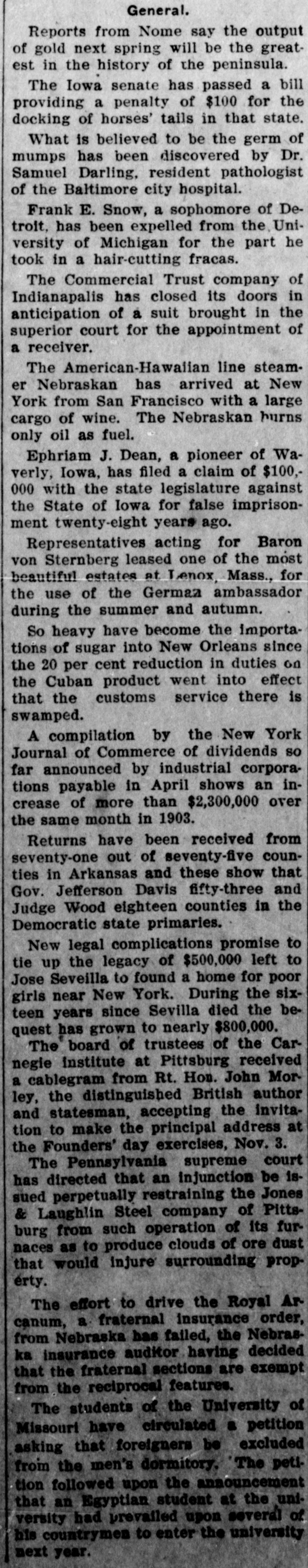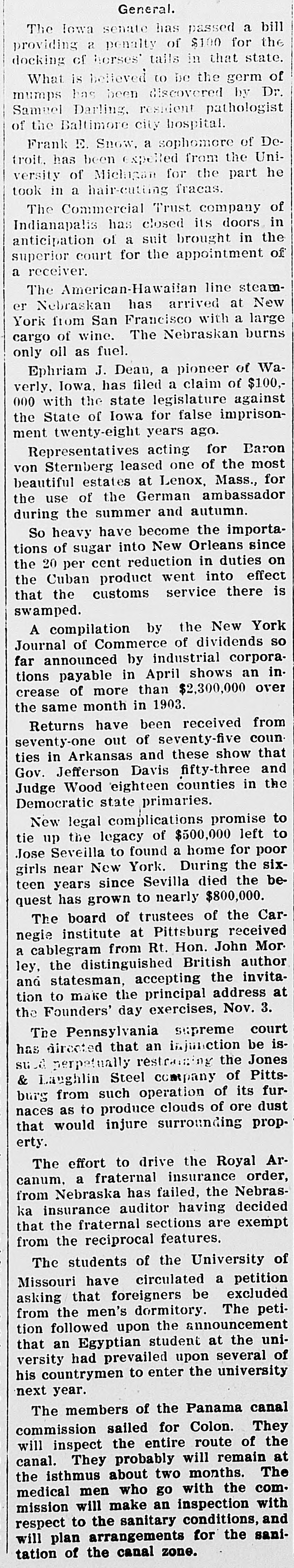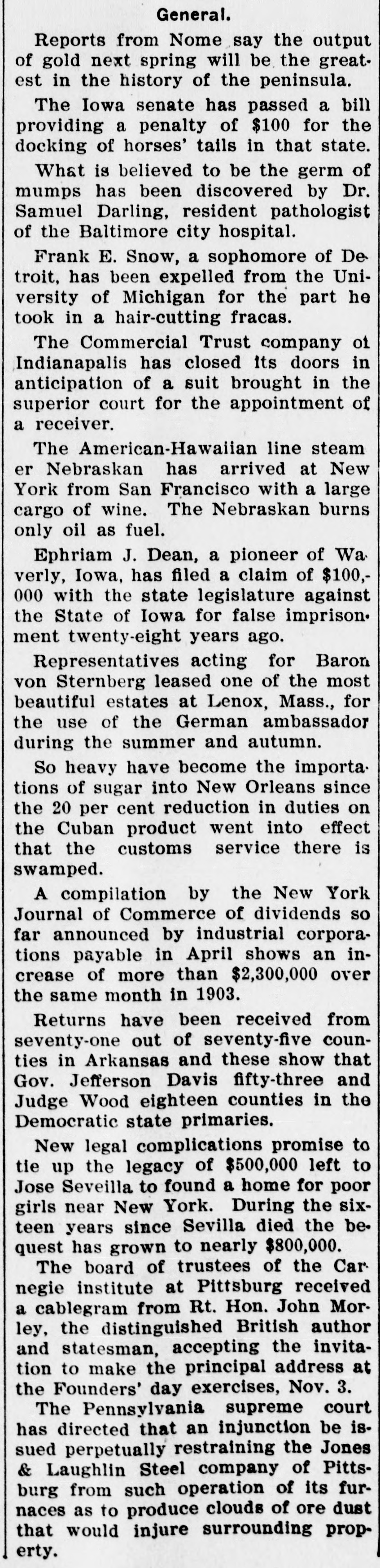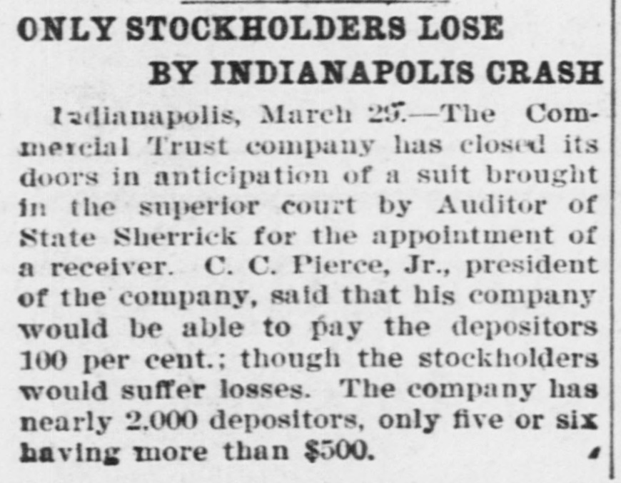PAPERS NOW PREPARED FOR SUIT AGAINST THE COMMERCIAL TRUST CO. Attorney General, It Is Said, Will Ask for Appointment of a Receiver. NO LOSS FOR DEPOSITORS Troubles of the Company Will Not Disturb Financial Circle of the City. It became known yesterday that papers have been prepared in the office of the attorney general of Indiana for a suit against the Commercial Trust Company, of this city, with offices at No. 4 East Market street, for the appointment of a receiver. Some time ago the affairs of this company were brought to the attention of the auditor of state, and an examination of the company's books was recently made by George U. Bingham, expert accountant in the auditor's office. It is understood that after Mr. Bingham's report had been thoroughly considered by Auditor David E. Sherrick, the matter was submitted to the attorney general's office for immediate action, with the result that the papers are now ready to be turned over to the prosecuting attorney for this circuit. John C. Ruckelshaus, who will bring the suit on behalf of the State. When questioned yesterday attaches of the attorney. general's office were loath to speak of the matter before the filing of the suit, but it is learned on good authority that the complaint asking for a receiver to handle the affairs of the Commercial Trust Company will contain three principal allegations: First, that the company is insolvent. Second, that the directorate is not properly constituted, for the reason that some of the directors do not own the ten shares of stock each required by the law governing trust companies. Third, that, at the time the Commercial Trust Company secured a certificate from the auditor of state entitling it to do business in Indiana, it did not have the necessary amount of paid-up capital stock. The Commercial Trust Company was organized a year ago last January by W. W. Hubbard and Willis E. Hackedorn, but these men have since disposed of their interest in the company and are said to be no longer identified with it. The present officers are: President-C. C. Pierce, jr. Vice President-R. T. Snapp. Secretary and Treasurer-J. M. Martens. Assistant Secretary-W. E. Ashbaugh. It is understood that the depositors of the Commercial Trust Company will not lose anything if the company is placed in the hands of a receiver and is shown to be insolvent. The law governing trust companies makes the stockholders liable for twice the amount of their holdings to secure depositors, and it is understood that this provision will afford ample security for the depositors. In local banking and financial circles there is gossip that there may be some sensational developments in the litigation affecting the Commercial Trust Company. These developments, it is said, will hinge on the substantiation of the third allegation in the complaint-that, at the time the company secured its certificate from the auditor of state, it did not have the required amount of paid-up stock. It is understood that some of the stockholders of the company have been dissatisfied for some time with the condition of its affairs. The suit, it is said, will be brought either to-day or to-morrow.
