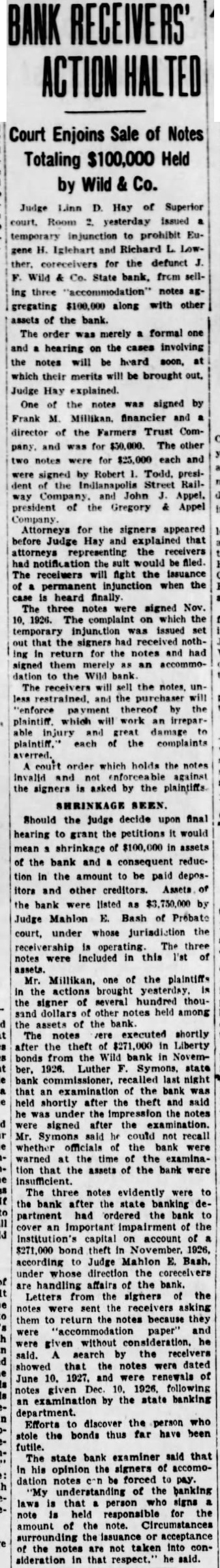 BANK RECEIVERS' Court Enjoins Sale of Notes Totaling $100,000 Held by Wild & Co. Judge Linn D. Hay of Superior issued to Eugene H. Iglehart and Richard L for the defunct Co. State from selling three notes gregating $100,000 along with other the The order formal one hearing the the will heard at brought out, Judge Hay One the signed by Frank M. and of the Farmers Trust Comother pany two notes each and an signed Robert John president of the Gregory Appel Attorneys for the signers appeared before Judge Hay explained attorneys representing the the would The receivers will fight the permanent injunction when the case is heard The notes signed Nov. The the was issued set that the had nothreturn notes and signed them merely an the The the the thereof great damage to the complaints order which holds the notes signers is asked by the plaintiffs SHRINKAGE SEEN. Should the judge decide upon final hearing grant the petitions would shrinkage of $100,000 assets of the bank and reduetion in the to be paid depositors and other Assets of the bank listed as $3,750,000 by Judge Mahlon E. Bash of court, under whose jurisdiction the The three notes this assets. Mr. one of the plaintiffs the the signer several thoudollars held among the assets of the The executed shortly after the theft in Liberty bonds 1926. Luther state night that an examination the was held shortly after the theft and said he was under the notes were signed after the examination. Mr. Symons said could not recall whether officials the bank warned at time of the examination that assets of the bank insufficient. The notes evidently were to the bank after state banking department ordered the bank an Important the Institution's capital on account of bond theft according Judge Bash. direction the are handling the bank. Letters signers the receivers asking them to the because they were "accommodation paper" and were given without consideration. said. search receivers showed that the notes were dated June 10. 1927. and renewals given Dec following by the banking an department. Efforts discover the person who the bonds thus far have futile. The state bank examiner said that in his opinion the signers accomodation notes understanding of the banking laws that who signs note is held responsible the amount the note. Circumstances surrounding acceptance of the are not taken into consideration that respect." he said.
