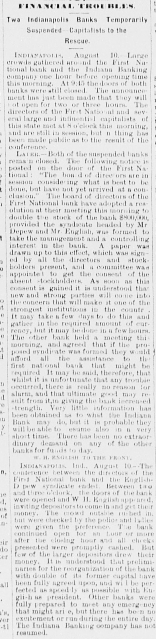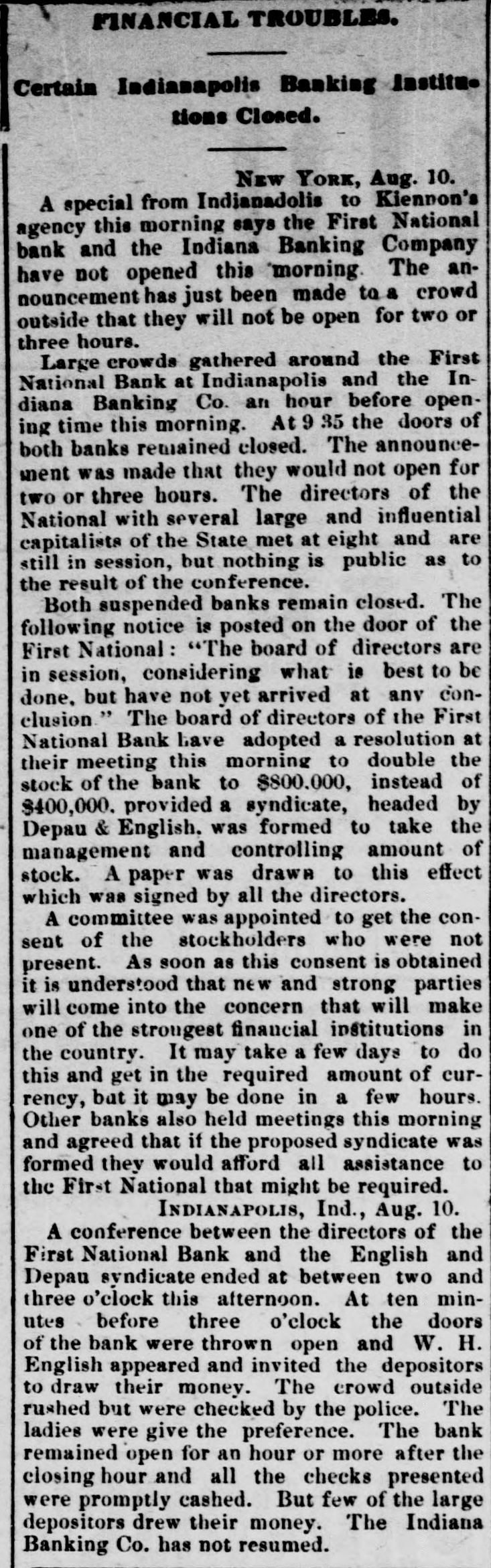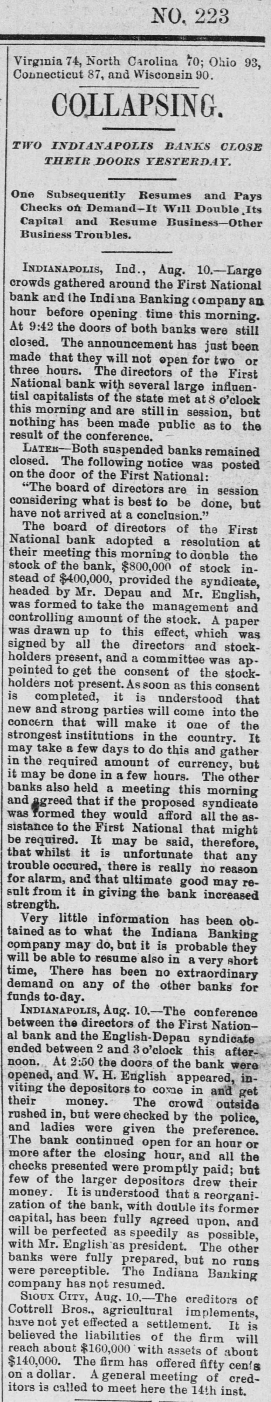 persons are down with the disease, No deaths are reported to-day. The disease 's said to be malignant dysentery, whose attack grow on a person. The Storm in "The West." DODGE CITY (Kas.), August 9th.-The severest storm ever known in this section struck this city after midnight last night, The wind-guage at the Signal office was blown down, but good judges estimated the velocity at nicety miles per hour. The storm was accompanied by the grandest display of lightning ever witnessed here, it being one continuous sheet of angry flame, There was also a very heavy rainfall, and water stood over a foot deep on Front street. The Salvation Army Again. SYRACUSE (N. Y.), August 9th.-Several weeks ago the Common Council passed resolutions prohibiting the Salvation Army from parading the streets. To-night the entire army determised to defy the Board of Aldermen, and marched through the streets shouting "Hallelujah" and singing hymns adapt ed to popular airs. The police arreated the whole body and escorted them to the stationhouse. When about to be placed in cells the Alderman who opposed the resolution signed their bail bond, and the parties will appear before a Justice to-morrow. Destruction by Fire. DANVILLE, August 9th.-The cotton factory of E. L. & A. Gerst, the tobacco warehouse of S. Holland & Co., the tobacco factory of Soll, Pickery & Oyer; the tobacco factory of W. F. Lowe and several outhouses were burned to-day. The estimated loss is $150,000; insurance, $116,000. VICKSBURG, August 9th.-A fire at Meridian to-day burned three blocks of residences and tenements, causing S loss of $50,000, distributed among a number of perLODS. Insurance, $10,000. A Cave in Lookout Mountain. CHATTANOOGA (Tenn.), August 9th.-Explorers recently discovered a cave at the base of Lookout Mountain, the opening being at low water mark in the Tennesses river, three miles from the city, Explorationa developed a wonderful cave of unknown depth. At the extreme point a very large lake was encountered, into which a fall 150 feet high poured its water with a noise of thunder. Other waterfalls and other interesting phenomens were discovered. Carey's Slayer. MILWAUKEE, August 9th.-It is discovered that Edward O'Donnell, who killed informer Carey in South Africa, lived with his parents, brothers and sisters in Milwaukee for many years. Two or three of the family died insane, and it is said O'Donnell at times showed an unbalanced mind. Indian Hanged for Murder. GALQUAT (Indian Territory), August 9.h.Running Bird" was hanged here to-day for the murder of Running Water." Run on Banks. INDIANAPOLIS, August 9th -This afternoon there has been & larga demand by depositors on the First National Bank, and that of the Indiana Banking Company, and large amounts have been withdrawn from both these institutions. Thermometrical. NEW York, August 9th.-Highest tempera ture to-day, 85° ; lowest, 65°.
