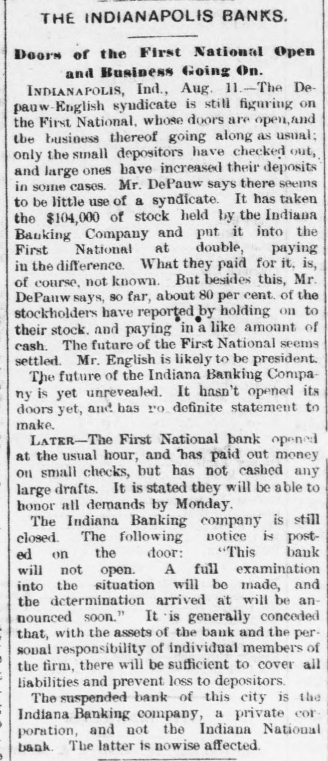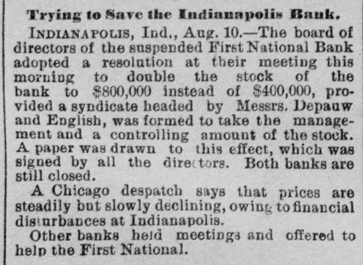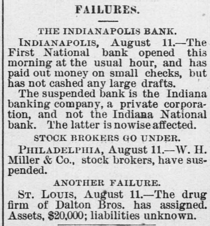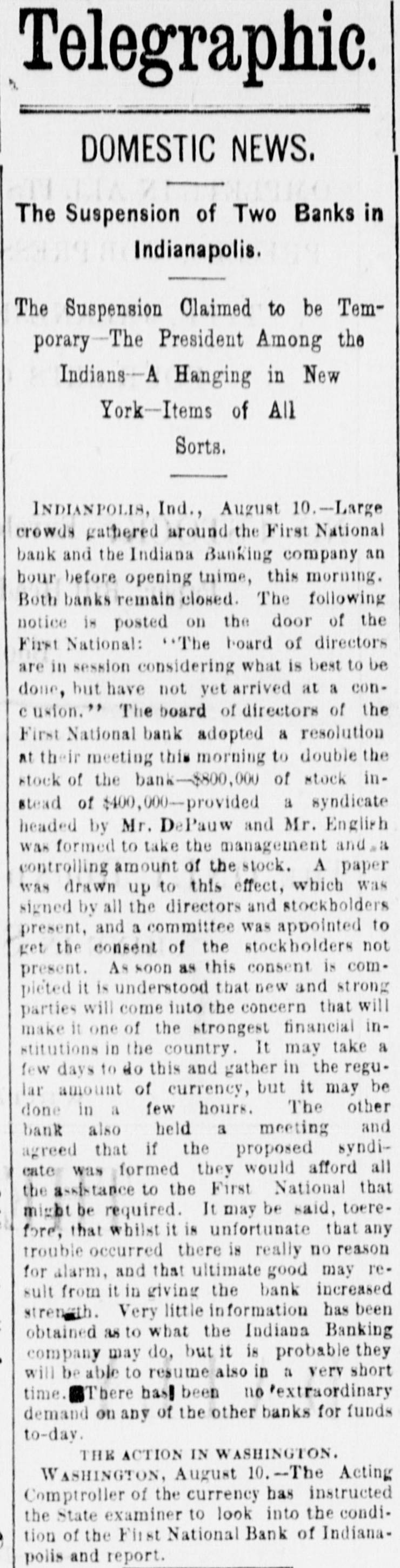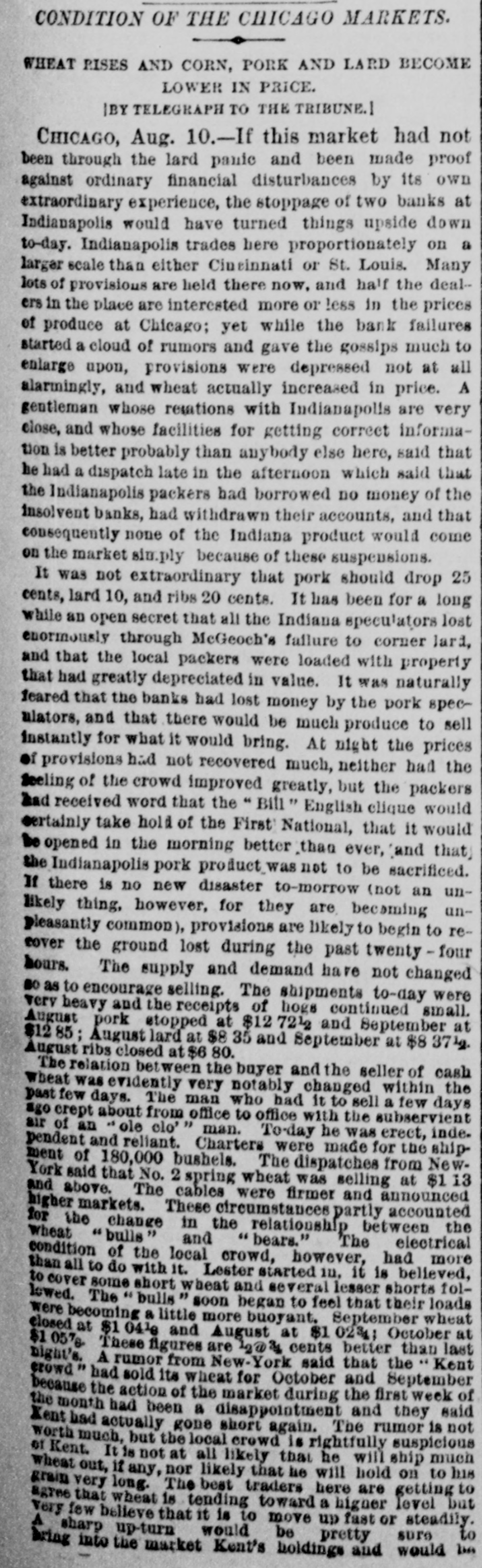 persons are down with the disease, No deaths are reported to-day. The disease 's said to be malignant dysentery, whose attack grow on a person. The Storm in "The West." DODGE CITY (Kas.), August 9th.-The severest storm ever known in this section struck this city after midnight last night, The wind-guage at the Signal office was blown down, but good judges estimated the velocity at nicety miles per hour. The storm was accompanied by the grandest display of lightning ever witnessed here, it being one continuous sheet of angry flame, There was also a very heavy rainfall, and water stood over a foot deep on Front street. The Salvation Army Again. SYRACUSE (N. Y.), August 9th.-Several weeks ago the Common Council passed resolutions prohibiting the Salvation Army from parading the streets. To-night the entire army determised to defy the Board of Aldermen, and marched through the streets shouting "Hallelujah" and singing hymns adapt ed to popular airs. The police arreated the whole body and escorted them to the stationhouse. When about to be placed in cells the Alderman who opposed the resolution signed their bail bond, and the parties will appear before a Justice to-morrow. Destruction by Fire. DANVILLE, August 9th.-The cotton factory of E. L. & A. Gerst, the tobacco warehouse of S. Holland & Co., the tobacco factory of Soll, Pickery & Oyer; the tobacco factory of W. F. Lowe and several outhouses were burned to-day. The estimated loss is $150,000; insurance, $116,000. VICKSBURG, August 9th.-A fire at Meridian to-day burned three blocks of residences and tenements, causing S loss of $50,000, distributed among a number of perLODS. Insurance, $10,000. A Cave in Lookout Mountain. CHATTANOOGA (Tenn.), August 9th.-Explorers recently discovered a cave at the base of Lookout Mountain, the opening being at low water mark in the Tennesses river, three miles from the city, Explorationa developed a wonderful cave of unknown depth. At the extreme point a very large lake was encountered, into which a fall 150 feet high poured its water with a noise of thunder. Other waterfalls and other interesting phenomens were discovered. Carey's Slayer. MILWAUKEE, August 9th.-It is discovered that Edward O'Donnell, who killed informer Carey in South Africa, lived with his parents, brothers and sisters in Milwaukee for many years. Two or three of the family died insane, and it is said O'Donnell at times showed an unbalanced mind. Indian Hanged for Murder. GALQUAT (Indian Territory), August 9.h.Running Bird" was hanged here to-day for the murder of Running Water." Run on Banks. INDIANAPOLIS, August 9th -This afternoon there has been & larga demand by depositors on the First National Bank, and that of the Indiana Banking Company, and large amounts have been withdrawn from both these institutions. Thermometrical. NEW York, August 9th.-Highest tempera ture to-day, 85° ; lowest, 65°.