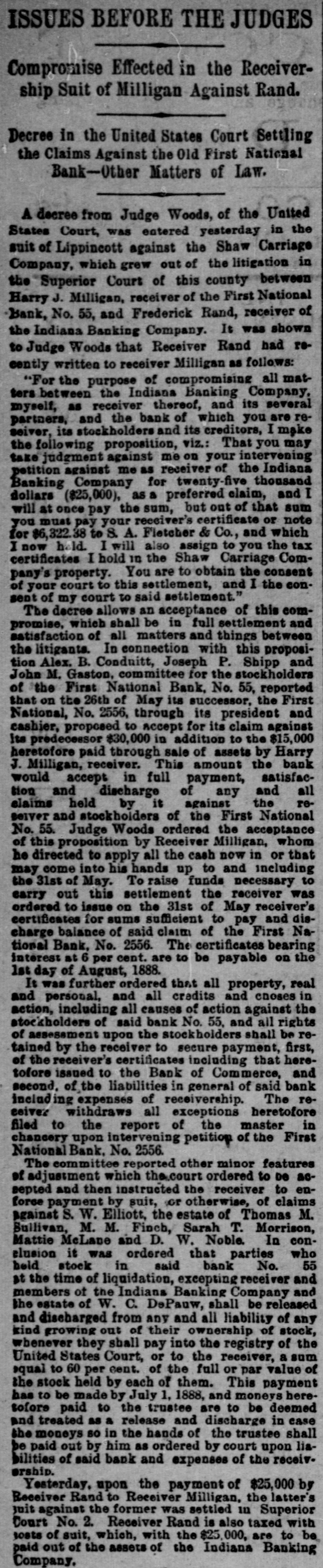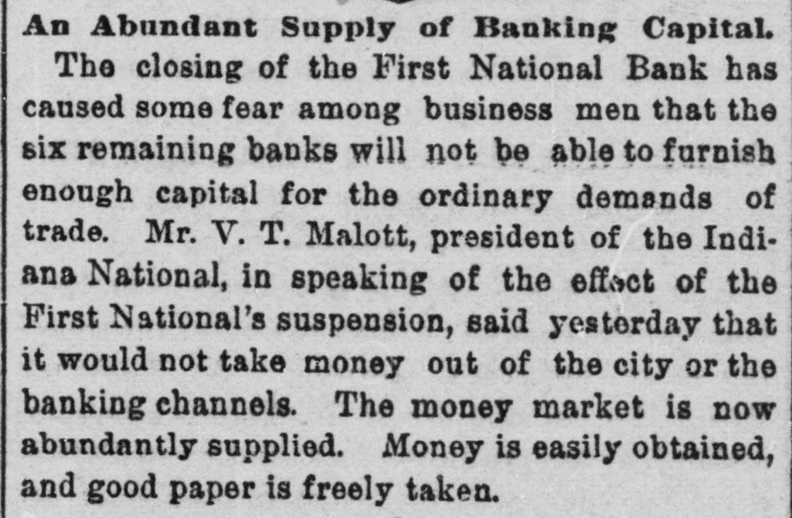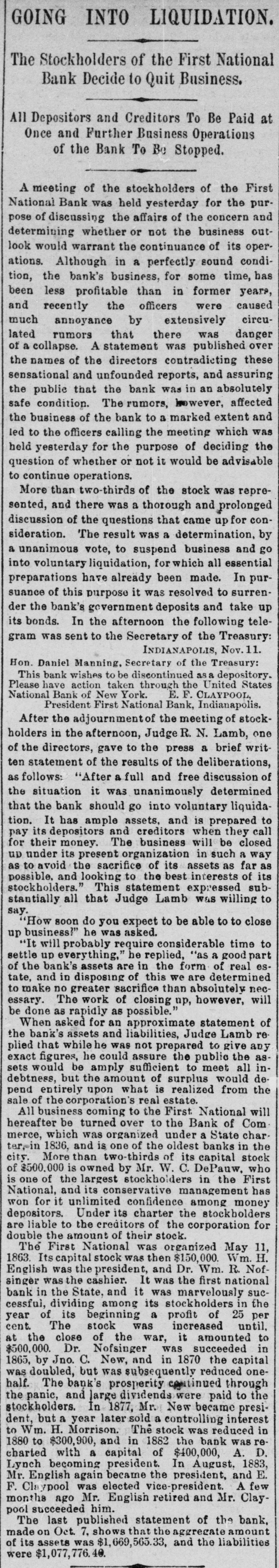 GOING INTO LIQUIDATION. The Stockholders of the First National Bank Decide to Quit Business. All Depositors and Creditors To Be Paid at Once and Further Business Operations of the Bank To Be Stopped. A meeting of the stockholders of the First National Bank was held yesterday for the purpose of discussing the affairs of the concern and determining whether or not the business outlook would warrant the continuance of its operations. Although in a perfectly sound condition, the bank's business, for some time, has been less profitable than in former years, and recently the officers were caused much annoyance by extensively circulated rumors that there was danger of a collapse. A statement was published over the names of the directors contradicting these sensational and unfounded reports, and assuring the public that the bank was in an absolutely safe condition. The rumors, however, affected the business of the bank to a marked extent and led to the officers calling the meeting which was held yesterday for the purpose of deciding the question of whether or not it would be advisable to continue operations. More than two-thirds of the stock was represented, and there was a thorough and prolonged discussion of the questions that came up for consideration. The result was a determination, by a unanimous vote, to suspend business and go into voluntary liquidation, for which all essential preparations have already been made. In pursuance of this purpose it was resolved to surrender the bank's government deposits and take up its bonds. In the afternoon the following telegram was sent to the Secretary of the Treasury: INDIANAPOLIS, Nov. 11. Hon. Daniel Manning, Secretary of the Treasury: This bank wishes to be discontinued asa depository. Please have action taken through the United States National Bank of New York. E. F. CLAYPOOL, President First National Bank, Indianapolis. After the adjournmentof the meeting of stockholders in the afternoon, Judge R. N. Lamb, one of the directors, gave to the press a brief written statement of the results of the deliberations, as follows: "After a full and free discussion of the situation it was unanimously determined that the bank should go into voluntary liquidation. It has ample assets, and is prepared to pay its depositors and creditors when they call for their money. The business will be closed up under its present organization in such a way as to avoid the sacrifice of its assets as far as possible, and looking to the best interests of its stockholders." This statement expressed substantially all that Judge Lamb was willing to say. "How soon do you expect to be able to to close up business!" he was asked. "It will probably require considerable time to settle up everything," he replied, "as a good part of the bank's assets are in the form of real estate, and in disposing of this we are determined to make no greater sacrifice than absolutely necessary. The work of closing up, however, will be done as rapidly as possible." When asked for an approximate statement of the bank's assets and liabilities, Judge Lamb replied that while he was not prepared to give any exact figures, he could assure the public the assets would be amply sufficient to meet all indebtness, but the amount of surplus would depend entirely upon what is realized from the sale of the corporation's real estate. All business coming to the First National will hereafter be turned over to the Bank of Com merce, which was organized under a State charter,-in 1836, and is one of the oldest banks in the city. More than two-thirds of its capital stock of $500,000 is owned by Mr. W. C. DePauw, who is one of the largest stockholders in the First National, and its conservative management has won for it unlimited confidence among money depositors. Under its charter the stockbolders are liable to the creditors of the corporation for double the amount of their stock. The First National was organized May 11, 1863. Its capital stock was then $150,000. Wm. H. English was the president, and Dr. Wm. R. Nofsinger was the cashier. It was the first national bank in the State, and it was marvelously successful, dividing among its stockholders in the year of its beginning a profit of 25 per cent. The stock was increased until, at the close of the war, it amounted to $500,000. Dr. Nofsinger was succeeded in 1865, by Jno. C. New, and in 1870 the capital was doubled, but was subsequently reduced onehalf. The bank's prosperity continued through the panic, and large dividends were paid to the stockholders. In 1877, Mr. New became president, but a year later sold a controlling interest to Wm. H. Morrison. The stock was reduced in 1880 to $300,900, and in 1882 the bank was recharted with a capital of $400,000, A. D. Lynch becoming president. In August, 1883, Mr. English again became the president, and E. F. Claypool was elected vice-president. A few months ago Mr. English retired and Mr. Claypool succeeded him. The last published statement of the bank. made on Oct. 7. shows that the aggregate amount of its assets was $1,669,565.33, and the liabilities were $1,077,776.40.