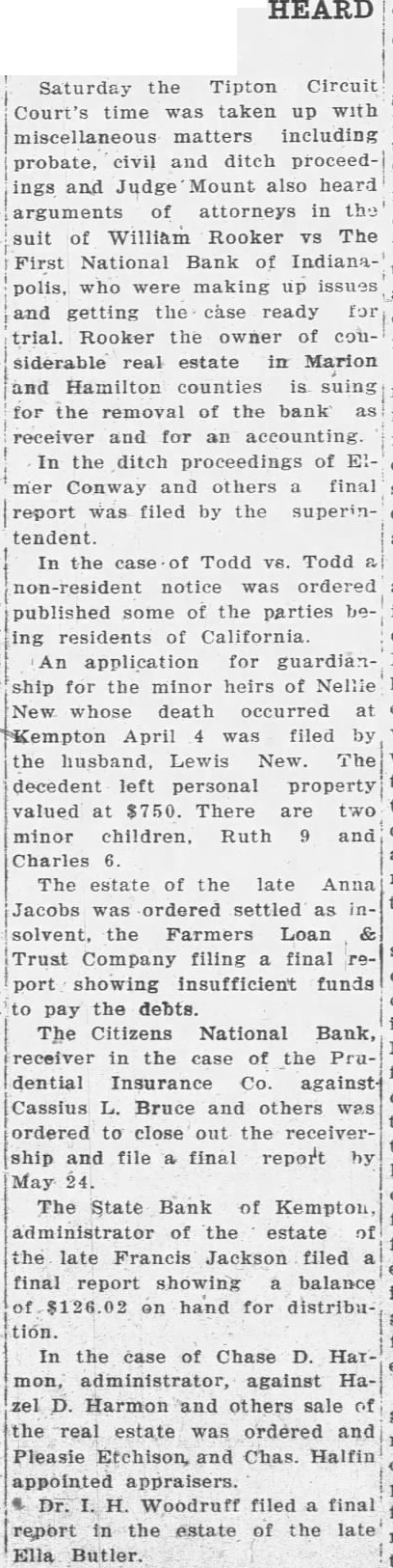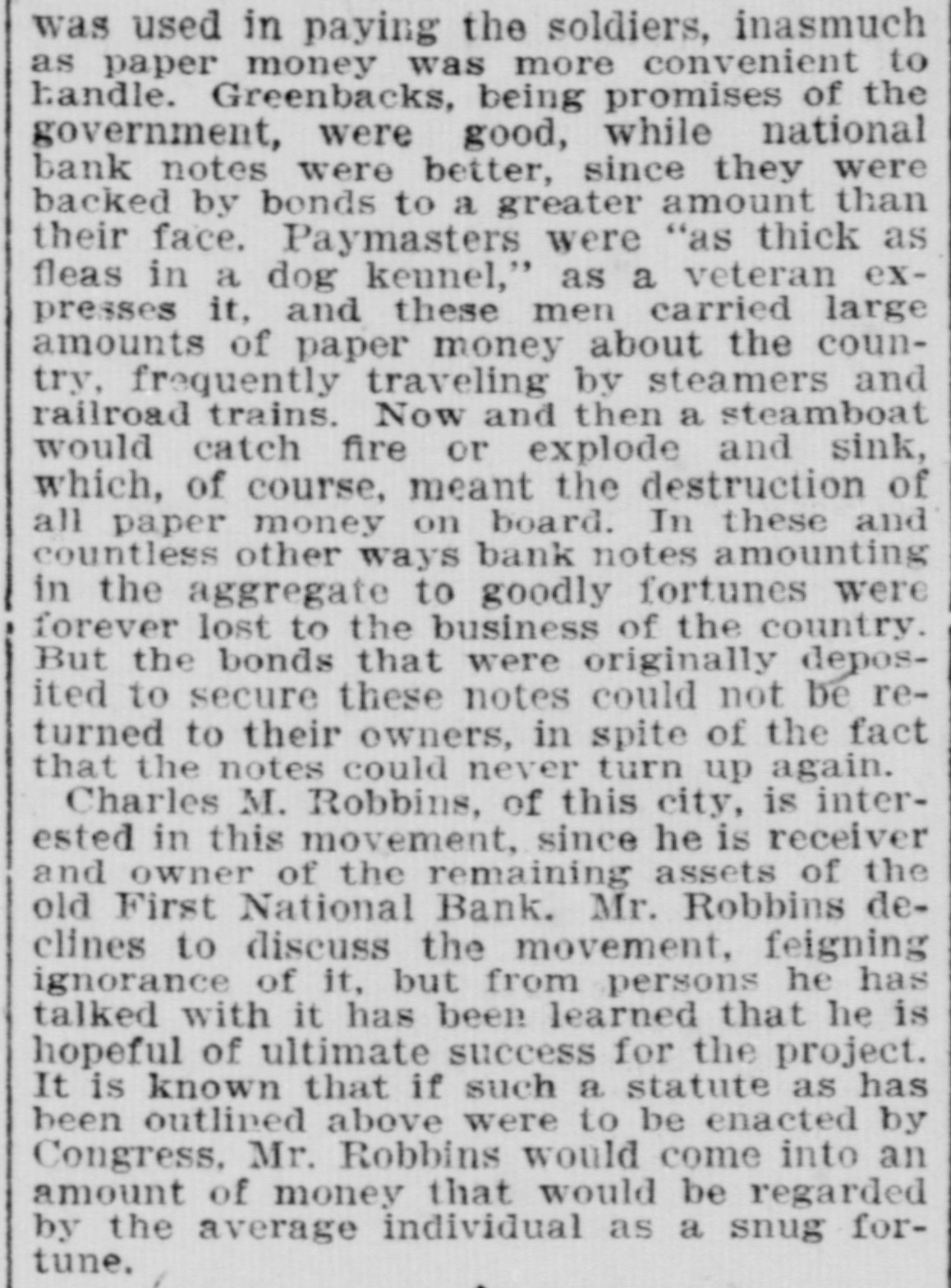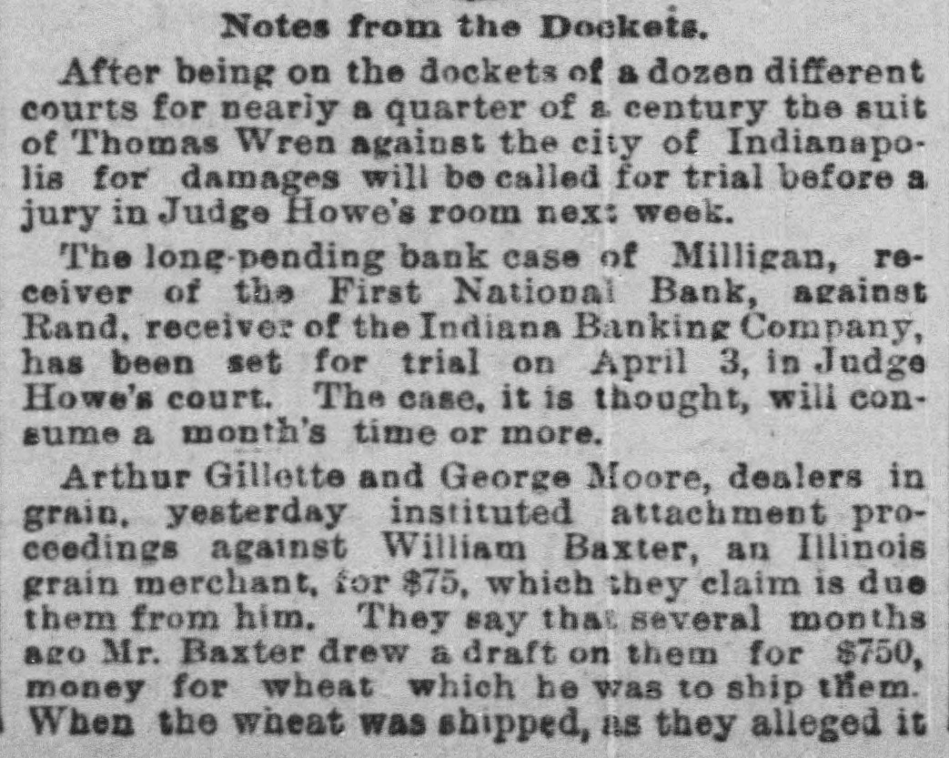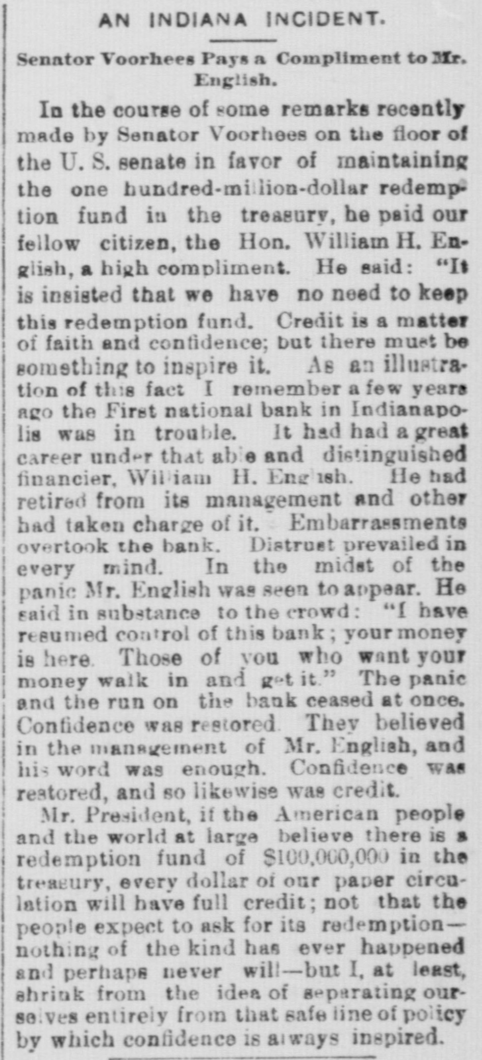 GOING INTO LIQUIDATION. The Stockholders of the First National Bank Decide to Quit Business. All Depositors and Creditors To Be Paid at Once and Further Business Operations of the Bank To Be Stopped. A meeting of the stockholders of the First National Bank was held yesterday for the purpose of discussing the affairs of the concern and determining whether or not the business outlook would warrant the continuance of its operations. Although in a perfectly sound condition, the bank's business, for some time, has been less profitable than in former years, and recently the officers were caused much annoyance by extensively circulated rumors that there was danger of a collapse. A statement was published over the names of the directors contradicting these sensational and unfounded reports, and assuring the public that the bank was in an absolutely safe condition. The rumors, however, affected the business of the bank to a marked extent and led to the officers calling the meeting which was held yesterday for the purpose of deciding the question of whether or not it would be advisable to continue operations. More than two-thirds of the stock was represented, and there was a thorough and prolonged discussion of the questions that came up for consideration. The result was a determination, by a unanimous vote, to suspend business and go into voluntary liquidation, for which all essential preparations have already been made. In pursuance of this purpose it was resolved to surrender the bank's government deposits and take up its bonds. In the afternoon the following telegram was sent to the Secretary of the Treasury: INDIANAPOLIS, Nov. 11. Hon. Daniel Manning, Secretary of the Treasury: This bank wishes to be discontinued asa depository. Please have action taken through the United States National Bank of New York. E. F. CLAYPOOL, President First National Bank, Indianapolis. After the adjournmentof the meeting of stockholders in the afternoon, Judge R. N. Lamb, one of the directors, gave to the press a brief written statement of the results of the deliberations, as follows: "After a full and free discussion of the situation it was unanimously determined that the bank should go into voluntary liquidation. It has ample assets, and is prepared to pay its depositors and creditors when they call for their money. The business will be closed up under its present organization in such a way as to avoid the sacrifice of its assets as far as possible, and looking to the best interests of its stockholders." This statement expressed substantially all that Judge Lamb was willing to say. "How soon do you expect to be able to to close up business!" he was asked. "It will probably require considerable time to settle up everything," he replied, "as a good part of the bank's assets are in the form of real estate, and in disposing of this we are determined to make no greater sacrifice than absolutely necessary. The work of closing up, however, will be done as rapidly as possible." When asked for an approximate statement of the bank's assets and liabilities, Judge Lamb replied that while he was not prepared to give any exact figures, he could assure the public the assets would be amply sufficient to meet all indebtness, but the amount of surplus would depend entirely upon what is realized from the sale of the corporation's real estate. All business coming to the First National will hereafter be turned over to the Bank of Com merce, which was organized under a State charter,-in 1836, and is one of the oldest banks in the city. More than two-thirds of its capital stock of $500,000 is owned by Mr. W. C. DePauw, who is one of the largest stockholders in the First National, and its conservative management has won for it unlimited confidence among money depositors. Under its charter the stockbolders are liable to the creditors of the corporation for double the amount of their stock. The First National was organized May 11, 1863. Its capital stock was then $150,000. Wm. H. English was the president, and Dr. Wm. R. Nofsinger was the cashier. It was the first national bank in the State, and it was marvelously successful, dividing among its stockholders in the year of its beginning a profit of 25 per cent. The stock was increased until, at the close of the war, it amounted to $500,000. Dr. Nofsinger was succeeded in 1865, by Jno. C. New, and in 1870 the capital was doubled, but was subsequently reduced onehalf. The bank's prosperity continued through the panic, and large dividends were paid to the stockholders. In 1877, Mr. New became president, but a year later sold a controlling interest to Wm. H. Morrison. The stock was reduced in 1880 to $300,900, and in 1882 the bank was recharted with a capital of $400,000, A. D. Lynch becoming president. In August, 1883, Mr. English again became the president, and E. F. Claypool was elected vice-president. A few months ago Mr. English retired and Mr. Claypool succeeded him. The last published statement of the bank. made on Oct. 7. shows that the aggregate amount of its assets was $1,669,565.33, and the liabilities were $1,077,776.40.