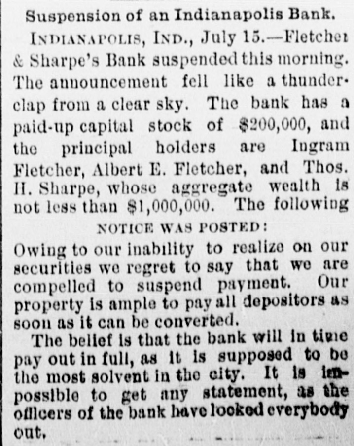 Suspension of an Indianapolis Bank. INDIANAPOLIS, IND., July 15.-Fletcher & Sharpe's Bank suspended this morning. The announcement fell like a thunderclap from a clear sky. The bank has a paid-up capital stock of $200,000, and the principal holders are Ingram Fletcher, Albert E. Fletcher, and Thos. H. Sharpe, whose aggregate wealth is not less than $1,000,000. The following NOTICE WAS POSTED: Owing to our inability to realize on our securities we regret to say that we are compelled to suspend payment. Our property is ample to pay all depositors as soon as it can be converted. The belief is that the bank will in time pay out in full, as it is supposed to be the most solvent in the city. It is lenpossible to get any statement, as the officers of the bank have looked everybody out.