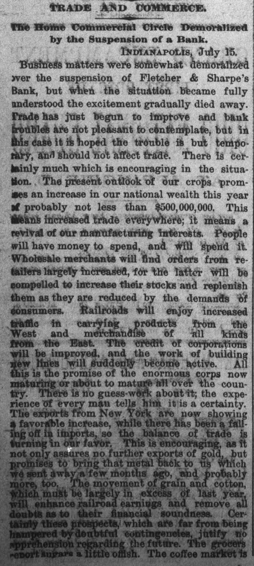 TRADE AND COMMERCE. The Home Commercial Circle Demoralized by the Suspension of a Bank. INDIANAPOLIS, July 15. Business matters were somewhat demoralized over the suspension of Fletcher & Sharpe's Bank, but when the situation became fully understood the excitement gradually died away. Trade has just begun to improve and bank troubles are not pleasant to contemplate, but in this case it is hoped the trouble is but temporary, and should not affect trade. There is cerminly much which is encouraging in the situation. The present outlook of our crops promses an increase in our national wealth this year of probably not less than $500,000,000. This means increased trade everywhere; it means a revival of our manufacturing interests. People will have money to spend, and will spend it. Wholesale merchants will find orders from retailers largely increased, for the latter will be compelled to increase their stocks and replenish them as they are reduced by the demands of consumers. Railroads will enjoy increased traffic in carrying products from the West and merchandise of all kinds from the East. The credit of corporations will be improved, and the work of building new lines will suddenly become active. All this is the promise of the enormous corps now maturing or about to mature all over the country. There is no guess-wörk about it; the experience of every man tells him it is a certainty. The exports from New York are now showing a favorable increase, while there has been a falling off in imports, so the balance of trade is turning in our favor. This is encouraging, as it not only assures no further exports of gold, but promises to bring that metal back to us which we sent away a few months ago, and probably more, too. The movement of grain and cotton, which must be largely in excess of last year, will enhance railroad earnings and remove all doubts as to their financial soundness. Certainly these prospects, which are far from being hampered by doubtful contingencies, jutify no apprehension regarding the future. The grocers report sugars a little offish. The coffee market is