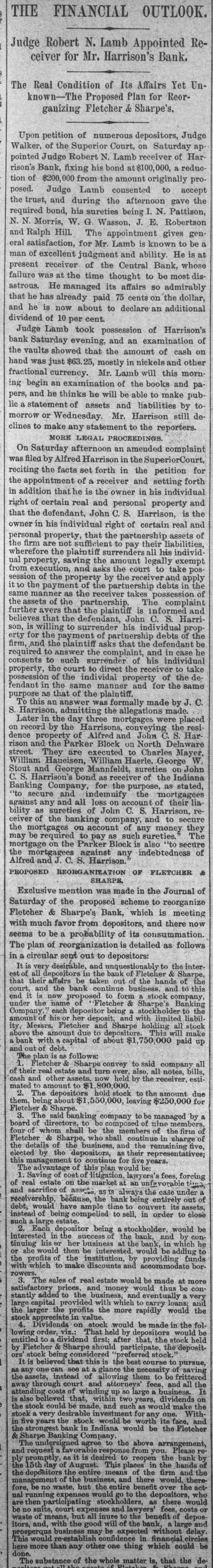 THE FINANCIAL OUTLOOK. Judge Robert N. Lamb Appointed Receiver for Mr. Harrison's Bank. The Real Condition of Its Affairs Yet Unknown-The Proposed Plan for Reorganizing Fletcher & Sharpe's. Upon petition of numerous depositors, Judge Walker, of the Superior Court, on Saturday ap pointed Judge Robert N. Lamb receiver of Harrison's Bank, fixing his bond at $100,000, a reduction of $200,000 from the amount originally proposed. Judge Lamb consented to accept the trust, and during the afternoon gave the required bond, his sureties being I. N. Pattison, N. N. Morris, W. G. Wasson, J. E. Robertson and Ralph Hill. The appointment gives general satisfaction, for Mr. Lamb is known to be a man of excellent judgment and ability. He is at present receiver of the Central Bank, whose failure was at the time thought to be most disastrous. He managed its affairs so admirably that he has already paid 75 cents on the dollar, and he is now about to declare an additional dividend of 10 per cent. Judge Lamb took possession of Harrison's bank Saturday evening, and an examination of the vaults showed that the amount of cash on hand was just $63.25, mostly in nickels and other fractional currency. Mr. Lamb will this morning begin an examination of the books and papers, and he thinks he will be able to make public a statement of assets and liabilities by to morrow or Wednesday. Mr. Harrison still declines to make any statement to the reporters. MORE LEGAL PROCEEDINGS. On Saturday afternoon an amended complaint was filed by Alfred Harrison in the SuperiorCourt, reciting the facts set forth in the petition for the appointment of a receiver and setting forth in addition that he is the owner in his individual right of certain real and personal property and that the defendant, John C.S. Harrison, is the owner in his individual right of certain real and personal property, that the partnership assets of the firm are not sufficient to pay their liabilities, wherefore the plaintiff surrenders all his individual property, saving the amount legally exempt from execution, and asks the court to take possession of the property by the receiver and apply it to the payment of the partnership debts in the same manner as the receiver takes possession of the assets of the partnership. The complaint further avers that the plaintiff is informed and believes that the defendant, John C. S. Harrison, is willing to surrender his individual property for the payment of partnership debts of the firm, and the plaintiff asks that the defendant be required to answer the complaint, and in case he consents to such surrender of his individual property, the court to direct the receiver to take possession of the individal property of the defendant in the same manner and for the same purpose as that of the plaintiff. To this an answer was formally made by J. C. S. Harrison, admitting the allegations made. Later in the day three mortgages were placed on record by the Harrisons, conveying the residence property of Alfred and John C. S. Har rison and the Parker Block on North Delaware street. They are executed to Charles Mayer, William Haueisen, William Haerle. George W Stout and George Mannfeldt, sureties on John C.S. Harrison's bond as receiver of the Indiana Banking Company, for the purpose, as stated, 'to secure and indemnify the mortgagees against any and all loss on account of their liability as sureties of John C. S. Harrison, re ceiver of the banking company, and to secure the mortgages on account of any money they may be required to pay as such sureties. The mortgage on the Parker Block is also "to secure the mortgagees against any indebtedness of Alfred and J. C. S. Harrison. PROPOSED REORGANIZATION OF FLETCHER & SHARPE, Exclusive mention was made in the Journal of Saturday of the proposed scheme to reorganize Fletcher & Sharpe's Bank, which is meeting with much favor from depositors, and there now seems to be a probability of its consummation. The plan of reorganization is detailed as follows in a circular sent out to depositors: It is very desirable, and unquestionably to the interest of all depositors in the bank of Fletcher & Sharpe, that their affairs be taken out of the hands of the court, and the bank continue business. and to this end it is now proposed to form stock company, under the name of Fletcher & Sharpe's Banking Company. each depositor being stockholder to the amount of his or her deposit, and with limited liabil ity, Messrs. Fletcher and Sharpe holding all stock above the amount due to depositors This will make a bank with capital of about $1,750,000 paid up and out of debt. The plan is as follows: 1. Fletcher & Sharpe convey to said company all of their real estate and turn over, also, all notes, bills, cash and other assets. now held by the receiver, estimated to amount to $1 800,000. 2. The depositors hold stock to the amount due them, being about 1,550,000, leaving $250,000 for Fletcher & Sharpe. 3. The said banking company to be managed by a board of directors, to be composed of nine members, four of whom shall be the members of the firm of Fletcher & Sharpe, who shall continue in charge of the details of the business, and the remaining five, elected by the depositors, as their representatives; this management to continue for five years. The advantage of this plan would be: 1. Saving of cost of litigation, lawyers's fees, forcing of real estate on the market at an unfavorable time, and sacrifice of assets as IS always the case under receivership, because, the bank being entirely out of debt, would have ample time to convert its assets, instead of being compelled to sell, in order to close such large estate. 2. Each depositor being a stockholder. would be interested in the success of the bank, and by continuing his or her business at the bank, in which he or she would then be interested would be adding to the profits of the institution, by providing funds with which to make discounts and accommodate borrowers. 3. The sale