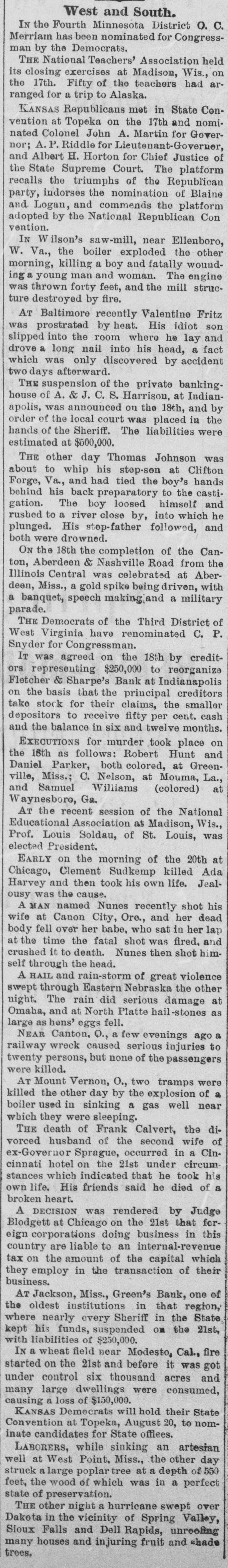 West and South. IN the Fourth Minnesota District O. C. Merriam has been nominated for Congressman by the Democrats. THE National Teachers' Association held its closing exercises at Madison, Wis., on the 17th. Fifty of the teachers had arranged for a trip to Alaska. KANSAS Republicans met in State Convention at Topeka on the 17th and nominated Colonel John A. Martin for Governor; A. P. Riddle for Lieutenant-Goveruer, and Albert H. Horton for Chief Justice of the State Supreme Court. The platform recalls the triumphs of the Republican party, indorses the nomination of Blaine and Logan, and commends the platform adopted by the National Republican Con vention. IN W ilson's saw-mill, near Ellenboro, W. Va., the boiler exploded the other morning, killing a boy and fatally wounding a young man and woman. The engine was thrown forty feet, and the mill structure destroyed by fire. AT Baltimore recently Valentine Fritz was prostrated by heat. His idiot son slipped into the room where he lay and drove a long nail into his head, a fact which was only discovered by accident two days afterward. THE suspension of the private bankinghouse of A. & J. C. S. Harrison, at Indianapolis, was announced on the 18th, and by order of the local court was placed in the hands of the Sheriff. The liabilities were estimated at $500,000. THE other day Thomas Johnson was about to whip his step-son at Clifton Forge, Va., and had tied the boy's hands behind his back preparatory to the castigation. The boy loosed himself and rushed to a river close by, into which he plunged. His step-father followed, and both were drowned. ON the 18th the completion of the Canton, Aberdeen & Nashville Road from the Illinois Central was celebrated at Aberdeen, Miss., a gold spike being driven, with a banquet, speech making;and a military parade. THE Democrats of the Third District of West Virginia have renominated C. P. Snyder for Congressman. IT was agreed on the 18th by creditors representing $250,000 to reorganize Fletcher & Sharpe's Bank at Indianapolis on the basis that the principal creditors take stock for their claims, the smaller depositors to receive fifty per cent. cash and the balance in six and twelve months. EXECUTIONS for murder took place on the 18th as follows: Robert Hunt and Daniel Parker, both colored, at Greenville, Miss.; C. Nelson, at Mouma, La., and Samuel Williams (colored) at Waynesboro, Ga. AT the recent session of the National Educational Association at Madison, Wis., Prof. Louis Soldau, of St. Louis, was elected President. EARLY on the morning of the 20th at Chicago, Clement Sudkemp killed Ada Harvey and then took his own life. Jealousy was the cause. A MAN named Nunes recently shot his wife at Canon City, Ore., and her dead body fell over her babe, who sat in her lap at the time the fatal shot was fired, and crushed it to death. Nunes then shot himself through the head. A HAIL and rain-storm of great violence swept through Eastern Nebraska the other night. The rain did serious damage at Omaha, and at North Platte hail-stones as large as hens' eggs fell. NEAR Canton, O., a few evenings ago a railway wreck caused serious injuries to twenty persons, but none of the passengers were killed. AT Mount Vernon, O., two tramps were killed the other day by the explosion of a boiler used in sinking a gas well near which they were sleeping. THE death of Frank Calvert, the divorced husband of the second wife of ex-Governor Sprague, occurred in a Cincinnati hotel on the 21st under circumstances which indicated that he took his own life. His friends said he died of a broken heart. A DECISION was rendered by Judge Blodgett at Chicago on the 21st that foreign corporations doing business in this country are liable to an internal-revenue tax on the amount of the capital which they employ in the transaction of their business. AT Jackson, Miss., Green's Bank, one of the oldest institutions in that region, where nearly every Sheriff in the State kept his funds, suspended on the 21st, with liabilities of $250,000. IN a wheat field near Modesto, Cal., fire started on the 21st and before it was got under control six thousand acres and many large dwellings were consumed, causing a loss of $150,000. KANSAS Democrats will hold their State Convention at Topeka, August 20, to nominate candidates for State offices. LABORERS, while sinking an artesian well at West Point, Miss., the other day struck a large poplar tree at a depth of 550 feet, the wood of which was in a perfect state of preservation. THE other night a hurricane swept over Dakota in the vicinity of Spring Valley, Sioux Falls and Dell Rapids, unroefing many houses and injuring fruit and shade trees.