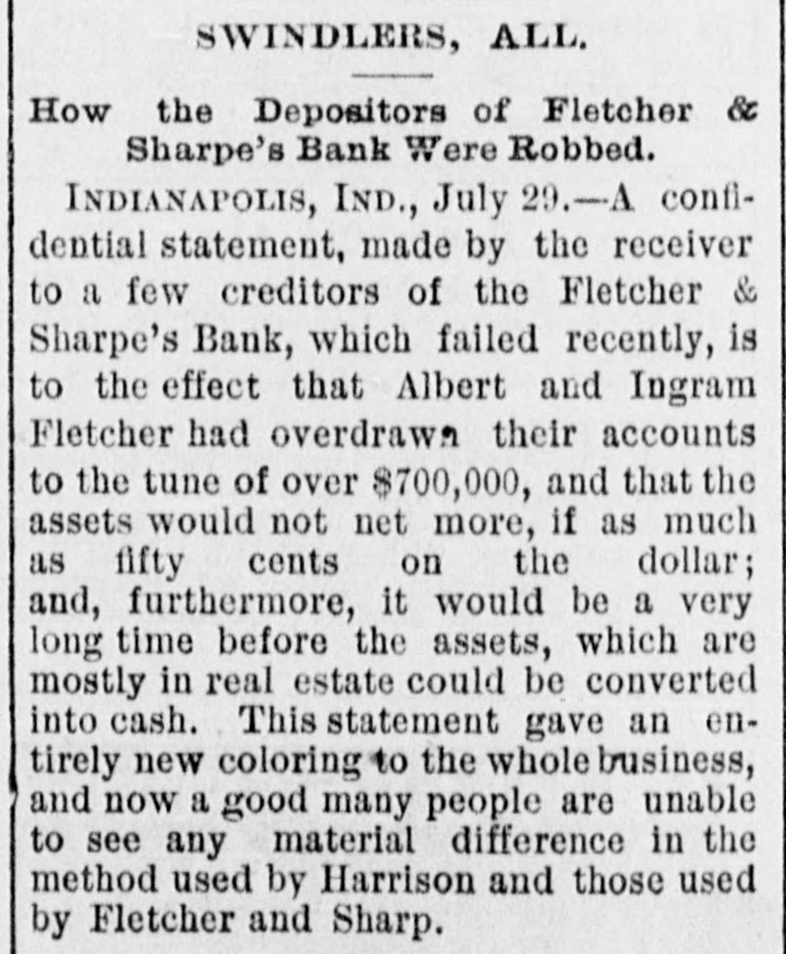 SWINDLERS, ALL. How the Depositors of Fletcher & Sharpe's Bank Were Robbed. INDIANAPOLIS, IND., July 29.-A confidential statement, made by the receiver to a few creditors of the Fletcher & Sharpe's Bank, which failed recently, is to the effect that Albert and Ingram Fletcher had overdrawn their accounts to the tune of over $700,000, and that the assets would not net more, if as much as fifty cents on the dollar; and, furthermore, it would be a very long time before the assets, which are mostly in real estate could be converted into cash. This statement gave an entirely new coloring to the whole business, and now a good many people are unable to see any material difference in the method used by Harrison and those used by Fletcher and Sharp.