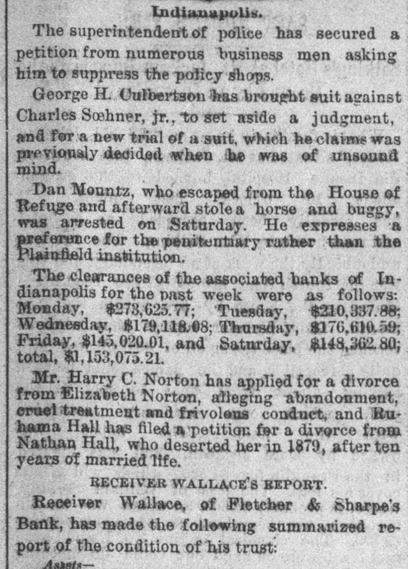 Indianapolis. The superintendent of police has secured a petition from numerous business men asking him to suppress the policy shops. George H. Culbertson has brought suit against Charles Soehner, jr., to set aside a judgment, and for a new trial of a suit, which he claims was previously decided when he was of unsound mind. Dan Mountz, who escaped from the House of Refuge and afterward stole a horse and buggy, was arrested on Saturday. He expresses a preference for the penitentiary rather than the Plainfield institution. The clearances of the associated banks of Indianapolis for the past week were as follows: Monday, $278,625.77; Tuesday, $210,337.88; Wednesday, $179,118.08; Thursday, $176,610.59; Friday, $145,020.01, and Saturday, $148,362.80; total, $1,153,075.21. Mr. Harry C. Norton has applied for a divorce from Elizabeth Norton, alleging abandonment, cruel treatment and frivolous conduct, and Ruhama Hall has filed a petition for a divorce from Nathan Hall, who deserted her in 1879, after ten years of married life. # RECEIVER WALLACE'S REPORT. Receiver Wallace, of Fletcher & Sharpe's Bank, has made the following summarized report of the condition of his trust: Assets-