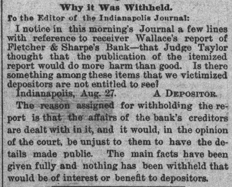 Why it Was Withheld. To the Editor of the Indianapolis Journal: I notice in this morning's Journal a few lines with reference to receiver Wallace's report of Fletcher & Sharpe's Bank-that Judge Taylor thought that the publication of the itemized report would do more harm than good. Is there something among these items that we victimized depositors are not entitled to see? A DEPOSITOR. Indianapolis, Aug. 27. The reason assigned for withholding the re port is that the affairs of the bank's creditors are dealt with in it, and it would, in the opinion of the court, be unjust to them to have the details made public. The main facts have been given fully and nothing has been withheld that would be of interest or benefit to depositors.