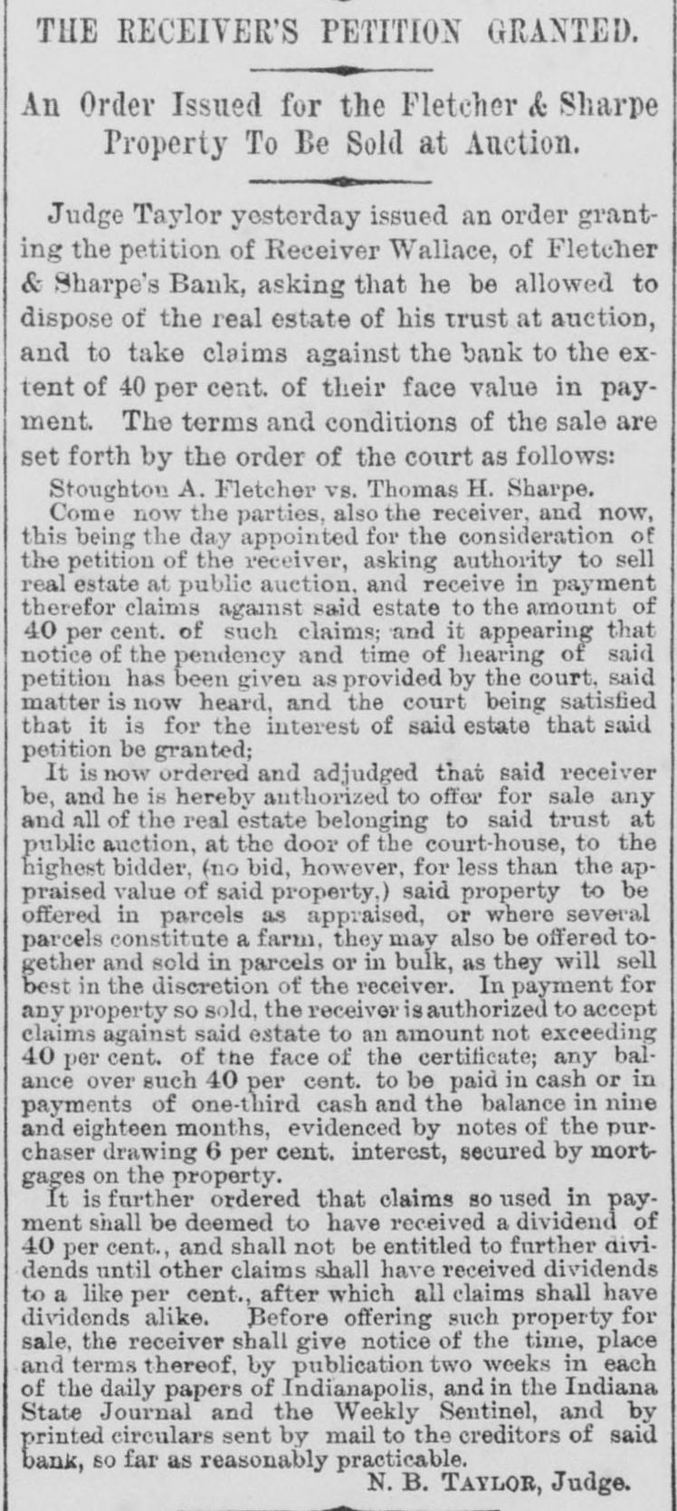 THE RECEIVER'S PETITION GRANTED. An Order Issued for the Fletcher & Sharpe Property To Be Sold at Auction. Judge Taylor yesterday issued an order granting the petition of Receiver Wallace, of Fletcher & Sharpe's Bank, asking that he be allowed to dispose of the real estate of his trust at auction, and to take claims against the bank to the extent of 40 per cent. of their face value in payment. The terms and conditions of the sale are set forth by the order of the court as follows: Stoughton A. Fletcher vs. Thomas H. Sharpe. Come now the parties, also the receiver, and now, this being the day appointed for the consideration of the petition of the receiver, asking authority to sell real estate at public auction, and receive in payment therefor claims against said estate to the amount of 40 per cent. of such claims; and it appearing that notice of the pendency and time of hearing of said petition has been given as provided by the court, said matter is now heard, and the court being satisfied that it is for the interest of said estate that said petition be granted; It is now ordered and adjudged that said receiver be, and he is hereby authorized to offer for sale any and all of the real estate belonging to said trust at public auction, at the door of the court-house, to the highest bidder, (no bid, however, for less than the appraised value of said property,) said property to be offered in parcels as appraised, or where several parcels constitute a farm, they may also be offered together and sold in parcels or in bulk, as they will sell best in the discretion of the receiver. In payment for any property so sold, the receiver is authorized to accept claims against said estate to an amount not exceeding 40 per cent. of the face of the certificate; any balance over such 40 per cent. to be paid in cash or in payments of one-third cash and the balance in nine and eighteen months, evidenced by notes of the purchaser drawing 6 per cent. interest, secured by mortgages on the property. It is further ordered that claims so used in payment shall be deemed to have received a dividend of 40 per cent., and shall not be entitled to further dividends until other claims shall have received dividends to a like per cent., after which all claims shall have dividends alike. Before offering such property for sale, the receiver shall give notice of the time, place and terms thereof, by publication two weeks in each of the daily papers of Indianapolis, and in the Indiana State Journal and the Weekly Sentinel, and by printed circulars sent by mail to the creditors of said bank, so far as reasonably practicable. N. B. TAYLOR, Judge.