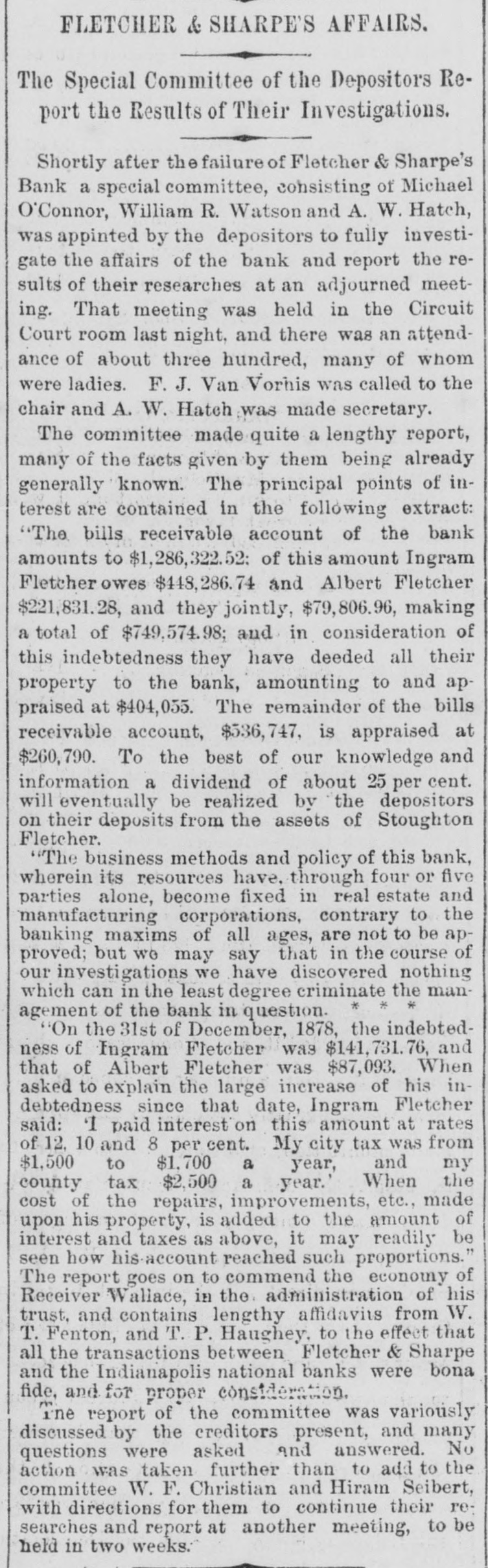 FLETCHER & SHARPE'S AFFAIRS. The Special Committee of the Depositors Report the Results of Their Investigations. Shortly after the failure of Fletcher & Sharpe's Bank a special committee, consisting of Michael O'Connor, William R. Watson and A. W. Hatch, was appinted by the depositors to fully investigate the affairs of the bank and report the results of their researches at an adjourned meeting. That meeting was held in the Circuit Court room last night, and there was an attendance of about three hundred, many of whom were ladies. F. J. Van Vorhis was called to the chair and A. W. Hatch was made secretary. The committee made quite a lengthy report, many of the facts given by them being already generally known. The principal points of interest are contained in the following extract: "The bills receivable account of the bank amounts to $1,286,322.52: of this amount Ingram Fletcher owes $448,286.74 and Albert Fletcher $221,831.28, and they jointly, $79,806.96, making a total of $749,574.98; and in consideration of this indebtedness they have deeded all their property to the bank, amounting to and appraised at $404,055. The remainder of the bills receivable account, $536,747, is appraised at $260,790. To the best of our knowledge and information a dividend of about 25 per cent. will eventually be realized by the depositors on their deposits from the assets of Stoughton Fletcher. "The business methods and policy of this bank, wherein its resources have, through four or five parties alone, become fixed in real estate and manufacturing corporations, contrary to the banking maxims of all ages, are not to be approved; but we may say that in the course of our investigations we have discovered nothing which can in the least degree criminate the management of the bank in question. * * "On the 31st of December, 1878, the indebtedness of Ingram Fletcher was $141,731.76, and that of Albert Fletcher was $87,093. When asked to explain the large increase of his indebtedness since that date, Ingram Fletcher said: 'I paid interest on this amount at rates of 12, 10 and 8 per cent. My city tax was from $1,500 to $1,700 a year, and my county tax $2,500 a year.' When the cost of the repairs, improvements, etc., made upon his property, is added to the amount of interest and taxes as above, it may readily be seen how his-account reached such proportions." The report goes on to commend the economy of Receiver Wallace, in the administration of his trust. and contains lengthy affidavits from W. T. Fenton, and T. P. Haughey. to the effect that all the transactions between Fletcher & Sharpe and the Indianapolis national banks were bona fide, and for proper consideration. The report of the committee was variously discussed by the creditors present, and many questions were asked and answered. No action was taken further than to add to the committee W. F. Christian and Hiram Seibert, with directions for them to continue their re: searches and report at another meeting, to be held in two weeks: