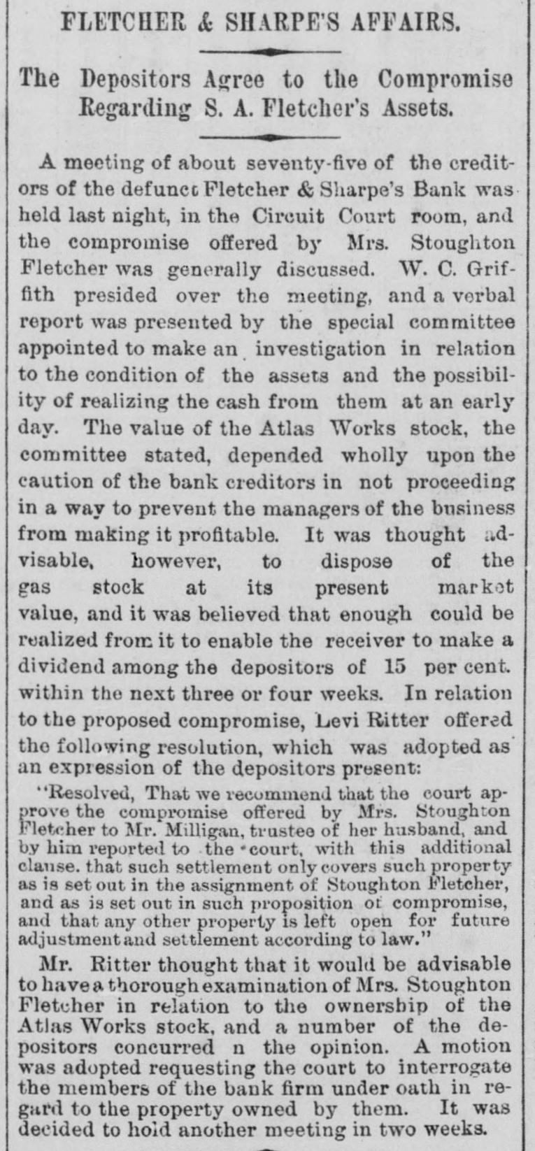 FLETCHER & SHARPE'S AFFAIRS. The Depositors Agree to the Compromise Regarding S. A. Fletcher's Assets. A meeting of about seventy-five of the creditors of the defunct Fletcher & Sharpe's Bank was held last night, in the Circuit Court room, and the compromise offered by Mrs. Stoughton Fletcher was generally discussed. W. C. Griffith presided over the meeting, and a verbal report was presented by the special committee appointed to make an investigation in relation to the condition of the assets and the possibility of realizing the cash from them at an early day. The value of the Atlas Works stock, the committee stated, depended wholly upon the caution of the bank creditors in not proceeding in a way to prevent the managers of the business from making it profitable. It was thought advisable, however, to dispose of the gas stock at its present market value, and it was believed that enough could be realized from it to enable the receiver to make a dividend among the depositors of 15 per cent. within the next three or four weeks. In relation to the proposed compromise, Levi Ritter offered the following resolution, which was adopted as an expression of the depositors present: "Resolved, That we recommend that the court approve the compromise offered by Mrs. Stoughton Fletcher to Mr. Milligan, trustee of her husband, and by him reported to the *court, with this additional clause. that such settlement only covers such property as is set out in the assignment of Stoughton Fletcher, and as is set out in such proposition of compromise, and that any other property is left open for future adjustmentand settlement according to law." Mr. Ritter thought that it would be advisable to havea thorough examination of Mrs. Stoughton Fletcher in relation to the ownership of the Atlas Works stock, and a number of the depositors concurred n the opinion. A motion was adopted requesting the court to interrogate the members of the bank firm under oath in regard to the property owned by them. It was decided to hold another meeting in two weeks.