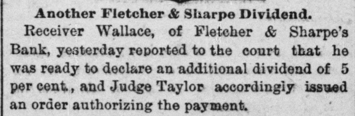 # Another Fletcher & Sharpe Dividend. Receiver Wallace, of Fletcher & Sharpe's Bank, yesterday reported to the court that he was ready to declare an additional dividend of 5 per cent., and Judge Taylor accordingly issued an order authorizing the payment.