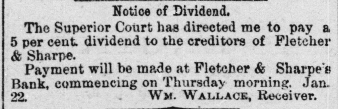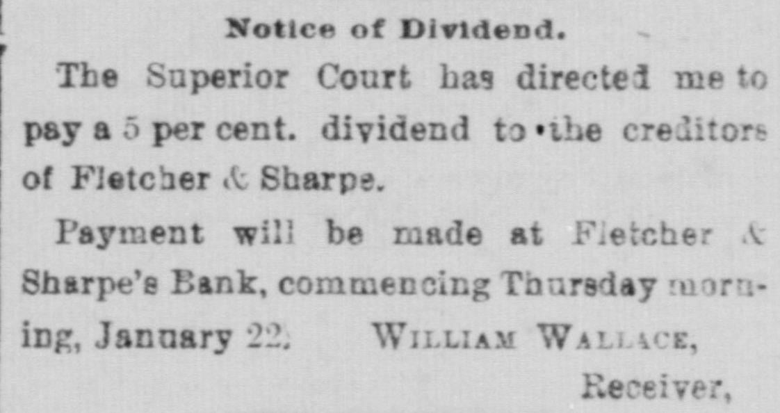 Notice of Dividend. The Superior Court has directed me to pay a 5 per cent. dividend to the creditors of Fletcher & Sharpe. Payment will be made at Fletcher & Sharpe's Bank, commencing Thursday morning, January 22. WILLIAM WALLACE, Receiver,