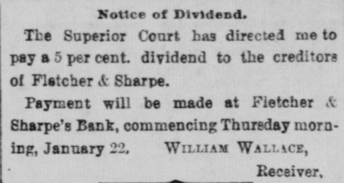 Notice of Dividend. The Superior Court has directed me to pay a 5 per cent. dividend to the creditors of Fletcher & Sharpe. Payment will be made at Fletcher & Sharpe's Bank, commencing Thursday morning, January 22, WILLIAM WALLACE, Receiver,