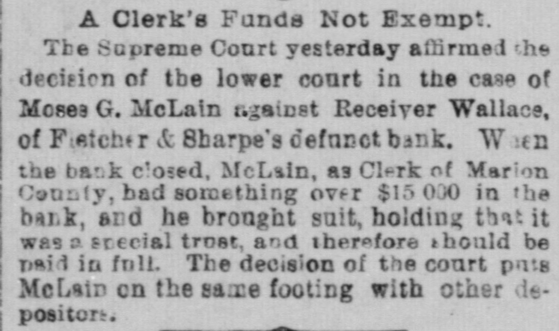 # A Clerk's Funds Not Exempt. The Supreme Court yesterday affirmed the decision of the lower court in the case of Moses G. McLain against Receiver Wallace, of Fletcher & Sharpe's defunct bank. When the bank closed, McLain, as Clerk of Marion County, had something over $15 000 in the bank, and he brought suit, holding that it was a special trust, and therefore should be paid in full. The decision of the court puts McLain on the same footing with other depositors.