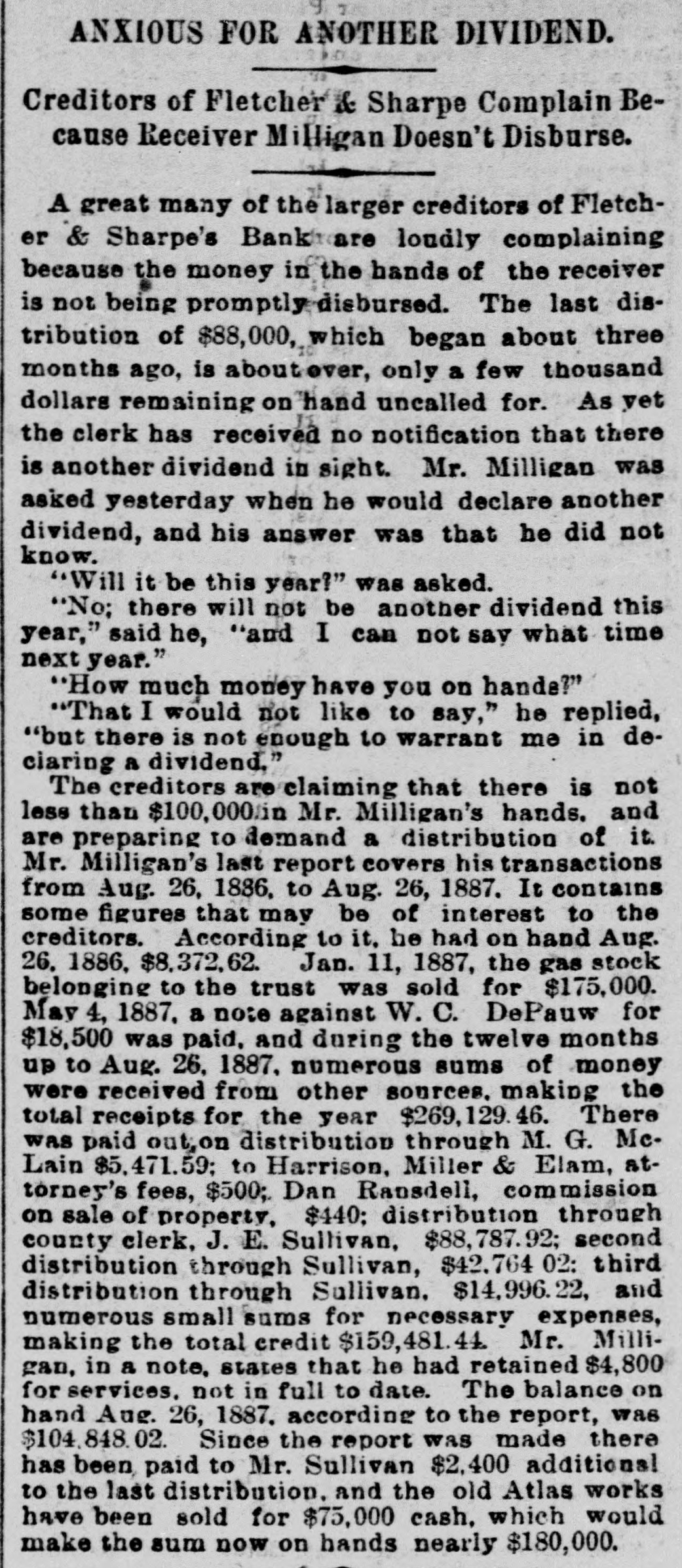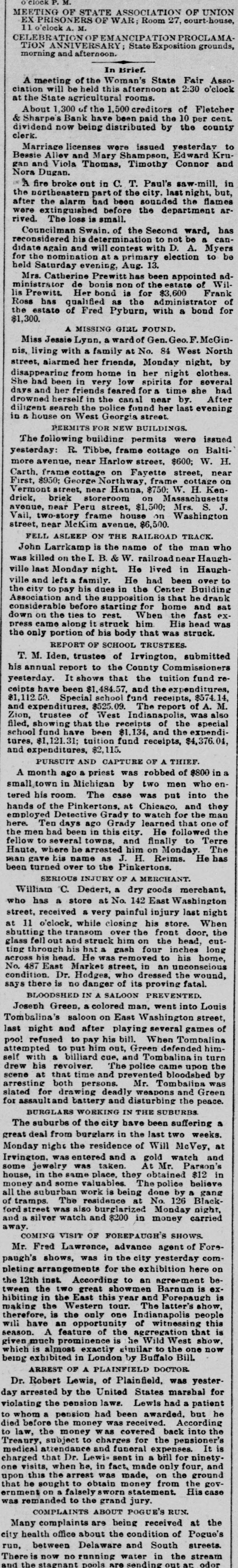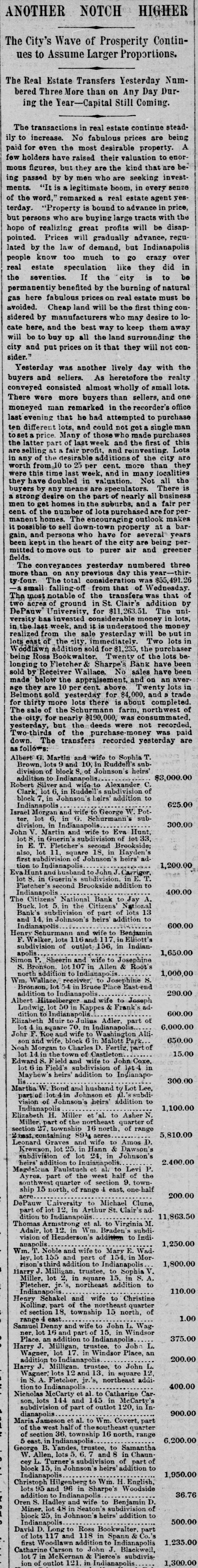 ANOTHER NOTCH HIGHER The City's Wave of Prosperity Continues to Assume Larger Proportions. The Real Estate Transfers Yesterday Numbered Three More than on Any Day During the Year-Capital Still Coming. The transactions in real estate continue steadily to increase. No fabulous prices are being paid for even the most desirable property. A few holders have raised their valuation to enormous figures, but they are the kind that are being passed by by men who are seeking investments. "It is a legitimate boom, in every sense of the word," remarked a real estate agent yesterday. "Property is bound to advance in price, but persons who are buying large tracts with the hope of realizing great profits will be disappointed. Prices will gradually advance, regulated by the law of demand, but Indianapolis people know too much to go crazy over real estate speculation like they did in the seventies. If the 'city is to be permanently benefited by the burning of natural gas here fabulous prices on real estate must be avoided. Cheap land will be the first thing considered by manufacturers who may desire to locate here, and the best way to keep them away will be to buy up all the land surrounding the city and put prices on it that they will not consider." Yesterday was another lively day with the buyers and sellers. As heretofore the realty conveyed consisted almost wholly of small lots. There were more buyers than sellers, and one moneyed man remarked in the recorder's office last evening that he had attempted to purchase ten different lots, and could not get a single man toset price. Many of those who made purchases the latter part of last week and the first of this are selling at fair profit, and vesting. Lots in any of the desirable additions of the city are worth from 10 to 25 per cent. more than they were this time last week, and in many localities they have doubled in valuation. Not all the buyers by any means are speculators. There is a strong desire on the part of nearly all business men to get homes in the suburbs, and a fair per cent. of the number of lots purchased for permanent homes. The encouraging outlook makes it possible to sell down town property at a bargain, and persons who have for several years been kept in the heart of the city are being permitted to move out to purer air and greener fields. The conveyances yesterday numbered three more than on any previous day this year -thirty -four. The total considers was $55,491.26 -a small falling off from that of ednesday The most notable of the transfers was that of two acres of ground in St. Clair's addition by DePauw University, for $11,263.51. The university has invested considerable money in lots, in the last week, and it is understoo the money realized from the sale yesterday will be put in lots east of the city, immediately Two lots in Woodlawn addition sold for $1,235, the purchaser being Ross Bookwalter. Twenty of the lots belonging to Fletcher & Sharpe's Bank have been sold by Receiver Wallace. No sales have been made below the appraisement, and on an average they are 10 per cent. above. Twenty lots in Belmont sold yesterday for $4,000, and trade for thirty more lots there is about completed. The sale of the Schurmann farm, northwest of the city, for nearly $190,000, was consummated, yesterday, but the deeds were not recorded, Two thirds of the purchase- money was paid down. The transfers recorded yesterday are as follows: Albert G. Martin and wife to Sophia T. Brown, lots 9 and 10, in Ruddell's subdivision of block 8. of Johnson's heirs' addition to Indianapolis. $3,000.00 Robert Silver and wife to Alexander C. Clark, lot 6, in Ruddell' subdivision of block 7, in Johnson's heirs' addition to 625.00 Indianapolis Israel Morgan and wife to George W. Potter, lot 6, in G. Schurmann sub300.00 division, in Indianapolis John V. Martin and wife to Eva Hunt, lot 8. in Guerin's subdivision of iot 33, in E. T. Fletcher's second Brookside; also, lot 11, square 18, in Hayden's first subdivision of Johnson's heirs' ad1,200.00 tion to Indianapolis Eva and husband to John Carriger, that lot 8. in Guerin's subdivision, in E. Fletcher' second Brookside addition to 400.00 Indianapolis The Citizens' National Bank to Jay A. Buck. lot 5. in the Citizens' National Bank's subdivision of part of lots 13 and 14, in Johnson' heirs addition to 600.00 Indianapolis Henry Seburmann and wife to Benjamin F. Walker, lots and 117, in Elliott's subdivision of outlet 156, in Indian1,650.00 apolis Simon P. Sheerin and wife to Josephine S. Bronson. lot 107 in Allen & Root's 1,000,00 north addition to Indianapolis Wm. Wallace, receiver, Josephine S. Bronson, lot 54 in Bruce Place East 290.00 addition to Indianapolis. Albert Hitzelberger and wife to Joseph Ludwig, lot 50 in Kappes & Frank adto dition 600.00 Indianapolis. Elizabeth Muir to Julius Adler, part of 6,000.00 lot square 70, in Indianapolis. Johr F. Roe and wife to Washington Alti650.00 son and wife, block 6 in Malott Park. Noah Morgan to Charles D. Fertig, part of 15.00 lot 14 in the town of Castleton. Edward S. Field and wife to John Coxe, lot in Field's subdivision of let in Mayhew's heirs' addition to Indianapo300.00 lis Martha W. Bond and husband ty Lot Lee, partiof loted Johnson et al. subdivision of Johnson's heirs' Addition to 1,100.00 Indianapolis Elizabeth H. Miller et al. to Asher N. Miller part of the northeast quarter of section 27. township 16 north, of range 5,810.00 Zuast, containing 8914 acres Leonard Graves and wife to Amos D. Krewson, lot 25. in Hann & Dawson's subdivision of lot 24, in Johnson's 2.400.00 heirs' addition to Indiana Magdalena Faulstuch et al. to Levi P. Ayres. part of the west half of the southwest quarter of section 9. township 15 north, of range 4 east, one-half 200.00 acre DePauw University to Michael Clune, part of lot 12, in Arthur St. Clair's addition to Indianapolis 11,863.50 Thomas Armstrong et al. to Virginia M. Adair, lot 12. in Wm. Braden's subdivision of Henderson's addit