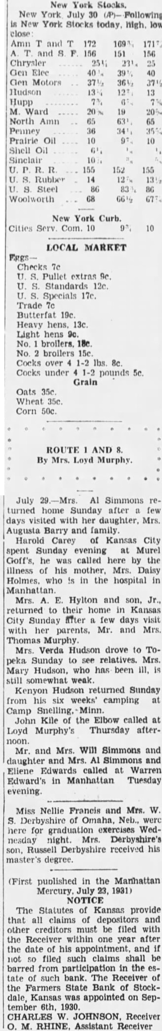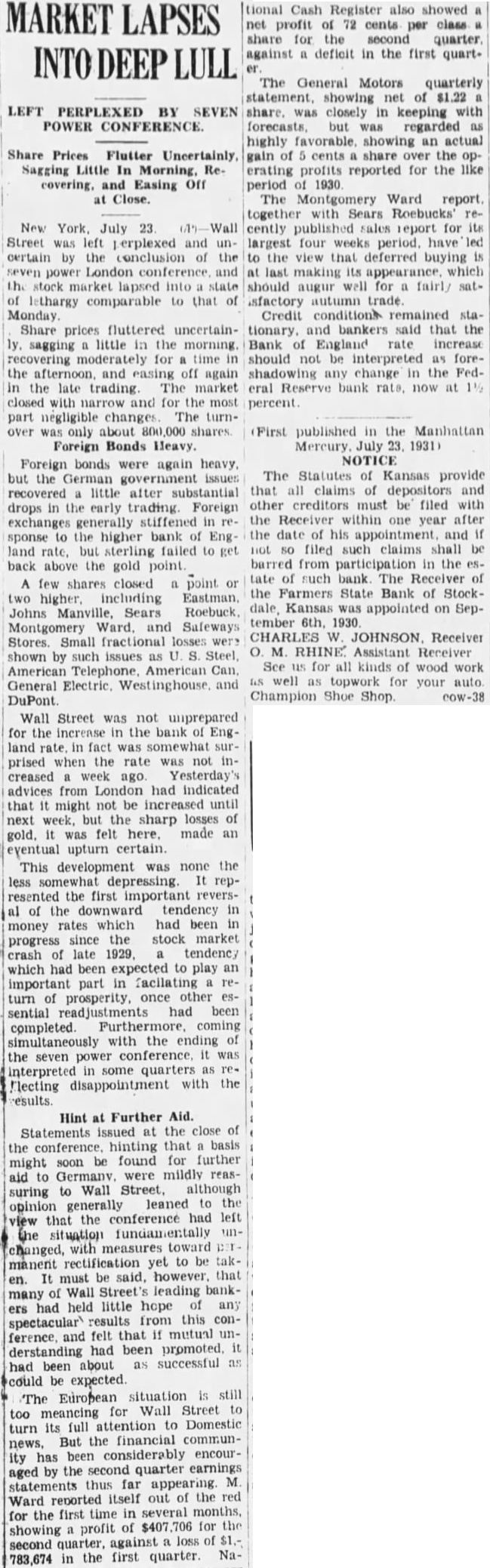 LEFT PERPLEXED BY SEVEN POWER CONFERENCE Share Prices Flutter Sagging Little In Morning, Recovering, and Easing Off Close. New July 23 Street was left perplexed and certain by the conclusion of seven power London conference and the stock market lapsed into lethargy comparable to that of Monday Share prices fluttered uncertainly, sagging little in the morning. recovering moderately for time the and easing off again the late trading. The market closed with narrow and for the most part negligible changes The turnover was only about shares. Foreign Bonds Heavy. Foreign bonds were again heavy. but the German government issues recovered little after substantial drops in the early Foreign generally stiffened in sponse the higher bank of land but sterling failed to back above the gold point A few shares closed point two higher, including Johns Manville, Sears Montgomery Ward. and Safeways Stores. Small fractional losses shown by such issues American Telephone, American Can General Electric. and DuPont Wall Street was not unprepared for the increase in the bank of England rate. in fact was somewhat prised when the rate not increased week ago. Yesterday's advices from London had indicated that might not be increased until next week, but the sharp losses of was felt here. made an eventual upturn certain. This development was none the less somewhat depressing. represented the first important reversof the downward tendency rates which had been money since the stock market progress crash of late tendency which had been expected to play an important part in facilating turn prosperity, once other sential readjustments had been completed Furthermore, coming simultaneously with the ending the seven power conference. it interpreted in some quarters as disappointment with the results. Hint at Further Aid. the close of Statements issued hinting that basis the be found for further might soon were mildly reasaid to to Wall although suring generally leaned to the opinion that the conference left the situation fundamentally with measures toward changed, rectification yet to be manent be said, however, that en. It must leading bankof Wall many held little hope of any ers had spectacular} results from this confelt that mutual understanding had been promoted, about successful had been could European situation still The too meancing for Wall Street to full attention to Domestic turn its But the financial communnews, ity has been considerably encouraged the second quarter earnings far M statements thus Ward reported itself out of the red for the first time in months, of $407,706 for the showing profit second quarter. against loss of first quarter. Na783,674 in the tional Cash Register also showed net profit 72 cents per class share for the second against deficit in the first quart- The General Motors quarterly showing net of share. was closely in keeping with forecasts, but regarded highly favorable. showing an actual gain of cents share over the operating profits reported for the like period 1930 The Montgomery Ward report together with Sears Roebucks cently sales report for its largest four weeks period. have led the view that deferred buying making its appearance which should augur well for fairly autumn Credit conditions remained stationary. and bankers said that the Bank of England rate increase should not be interpreted as foreshadowing any change the Federal Reserve bank now at percent. (First published in the Manhattan Mercury July 1931) NOTICE The Statutes of Kansas provide that all claims depositors and other creditors must be filed with the Receiver within one year after the date of his appointment and so filed such claims shall barred from participation in the tate such bank. The Receiver of the Farmers State Bank of StockKansas was appointed on September 1930 CHARLES Receiver RHINE Assistant Receiver See all kinds wood work well topwork for your auto Champion Shoe Shop
