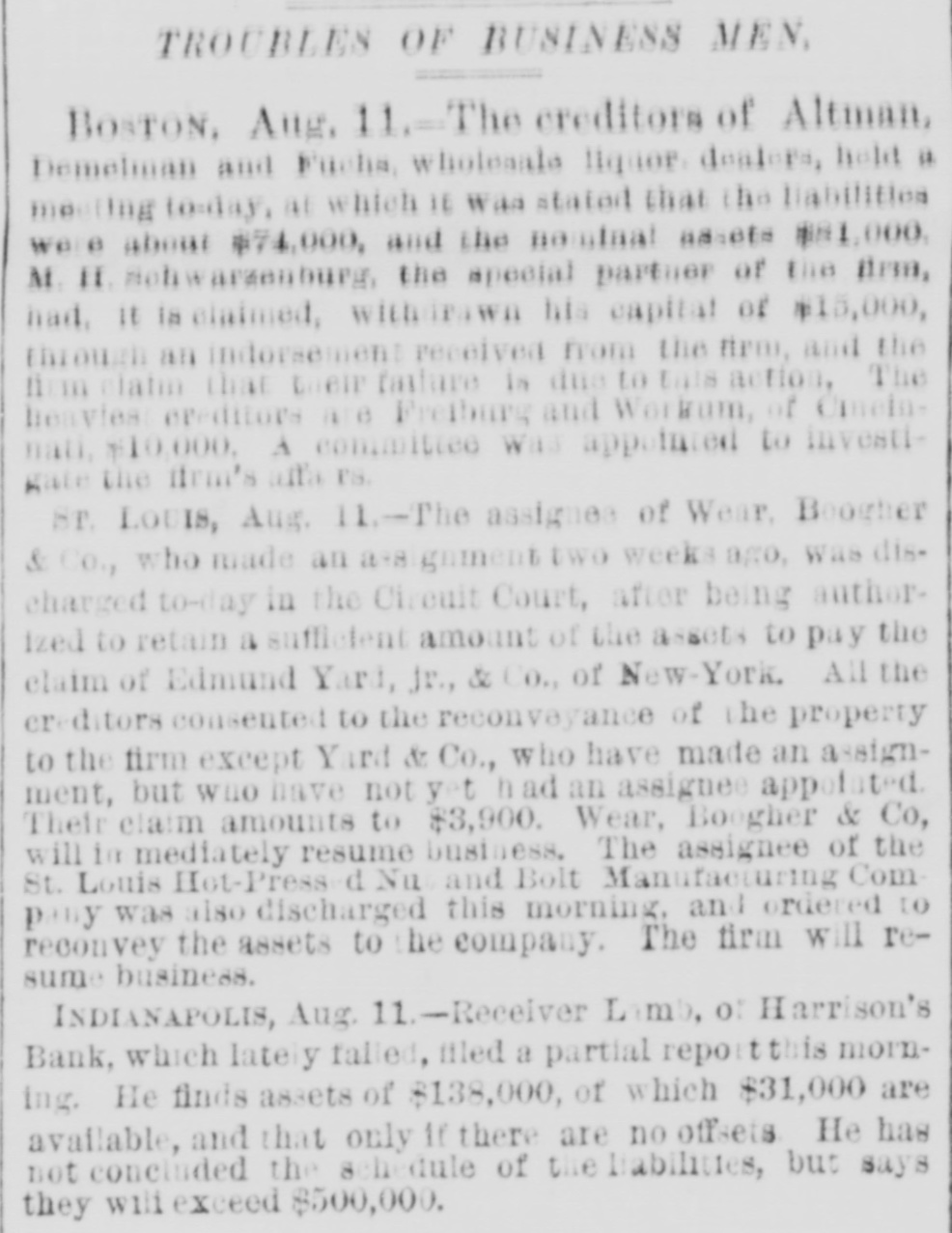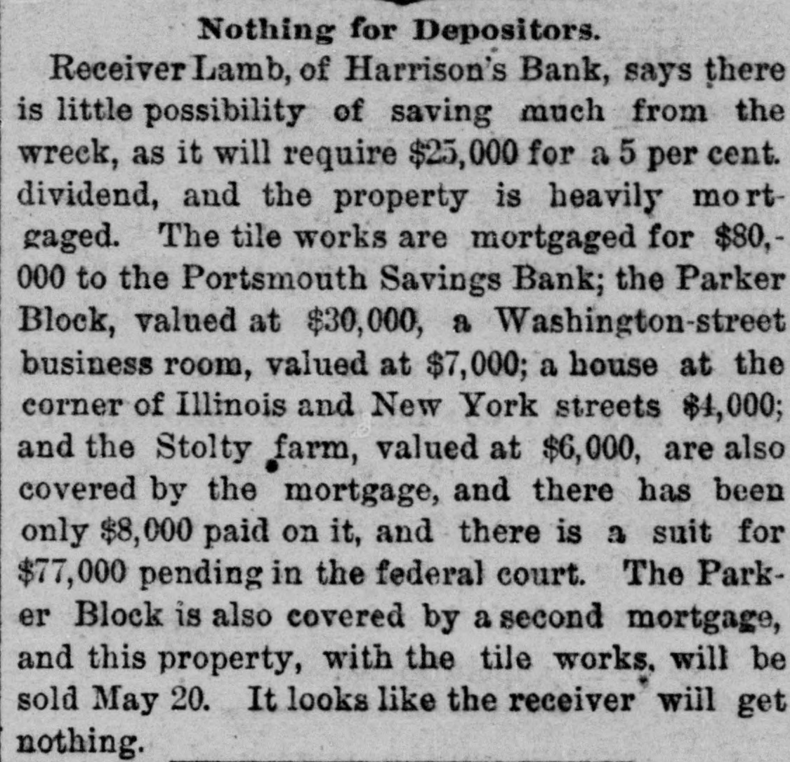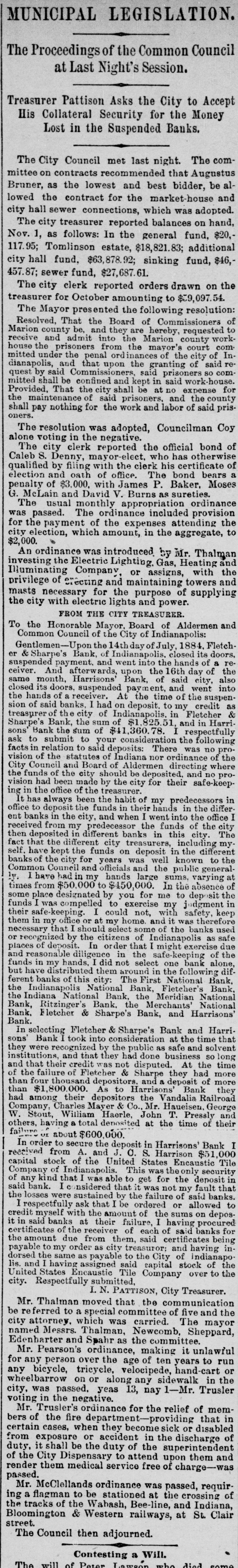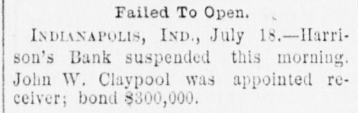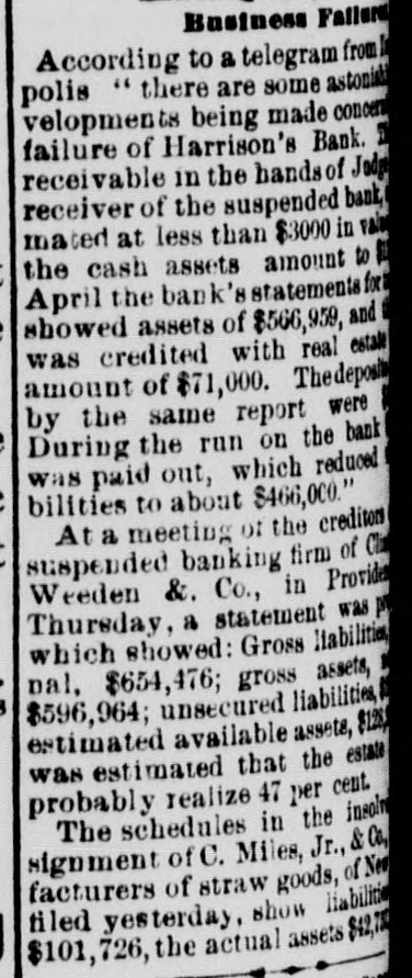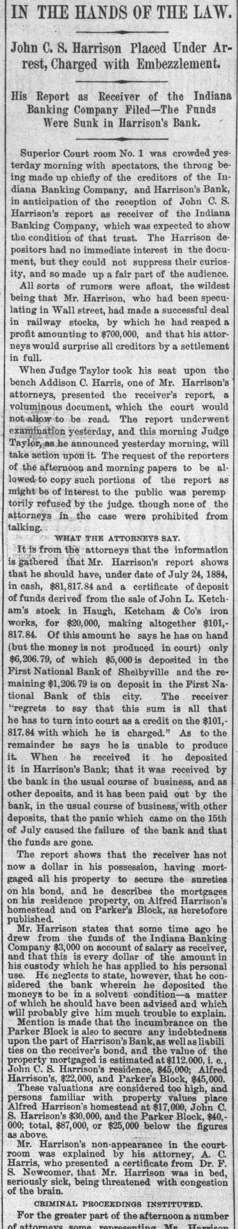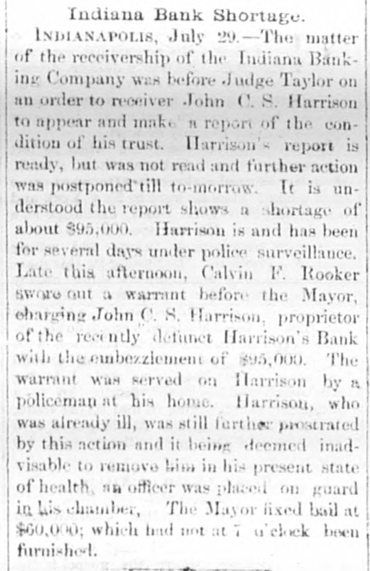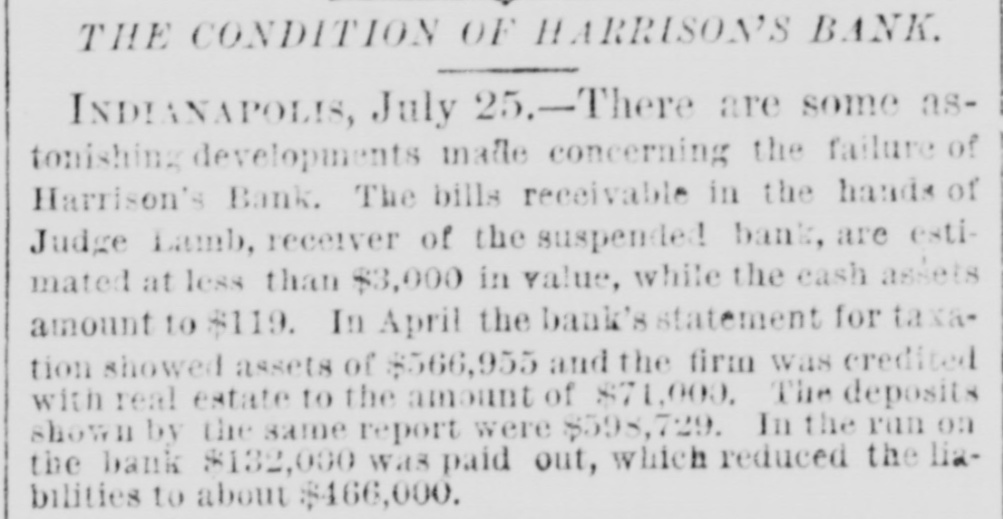 Total $50,818.87 From the above it will be seen that the balances at the clearing-house yesterday were small. Indeed, they were not over one-half the ordinary amount when business is brisk. This indicates that the people are not drawing heavily on the banks, and shows their confidence in them. With the exception of that against Harrison's Bank, the balances were insignificant when compared with what often occurs at the clearing-house in ordinary times. All the banks that were indebted to the Clear ing-house paid their accounts promptly, and the others were paid in turn. When his account was presented by Mr. Woollen, Mr. Harrison said he would not pay it. Some of the checks, he said, he would like to pay, but others he would not, and he asked Mr. Woollen to be allowed to make his selection. This was refused and Mr. Woollen returned the checks on Harrisons' Bank to the various banks whence they came. Mr. Harrison visited several of these and paid off a number of small checks, particularly those that were given on payment of obligations. The clearances of Harrison's bank were there-. fore: cancelled, and it was ruled out of the Clearance-house Association, because it had not met its obligations as required by the rules. After 4 o'clock payment was again demanded on certain certified checks and like obligations, and when it was refused they were protested. Their amount, it is understood, is between $3,000 and $4,000. THE BANK AND ITS DEPOSITORS. The depositors of Harrison's bank are not Bearly so numerous as those of other like institutions. An inquiry of one of the clerks as to the exact number was not productive of the decired information. Among other bankers, howover, it was variously estimated at from 300 to 400, and the total: amount of deposits at from $300,000 to $600,000. There are a great many trust funds among these, deposited by guardians, administrators, etc., on whose official bonds Mr. Harrison is among the securities. Several treasurers of out counties have their funds here and one or two officials from this city, but they claim to be amply protected. In the assessment list made April 1 of this year the assets and liabilities of the bank are given by Mr. Harrison as follows: Amount of money on hand $17,974 Amount in other banks 4,368 Bills receivable 478,459 Bonds and stocks 21,058 Legal tender (exempt from taxation) 45,100 Total $566,959 The deposits by others in the bank is given at $598,729. An examination of the books in the city treasurer's office shows that the banking firm of A. & J. C. S. Harrison own property valued at $71,750. The senior member is credited with property valued at $22,550, and the junior member at $30,800. The above figures may not at all represent the condition of affairs at the present time, but they are given for what they are worth. A complication of the present trouble is the fact that Mr. J. C. S. Harrison is receiver of he Indiana Banking Company, which failed a ear ago, and which has thus far only paid a sin-