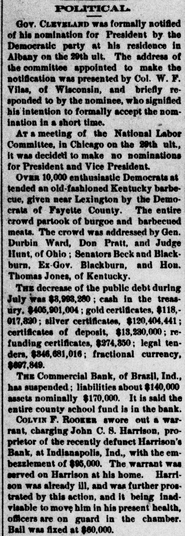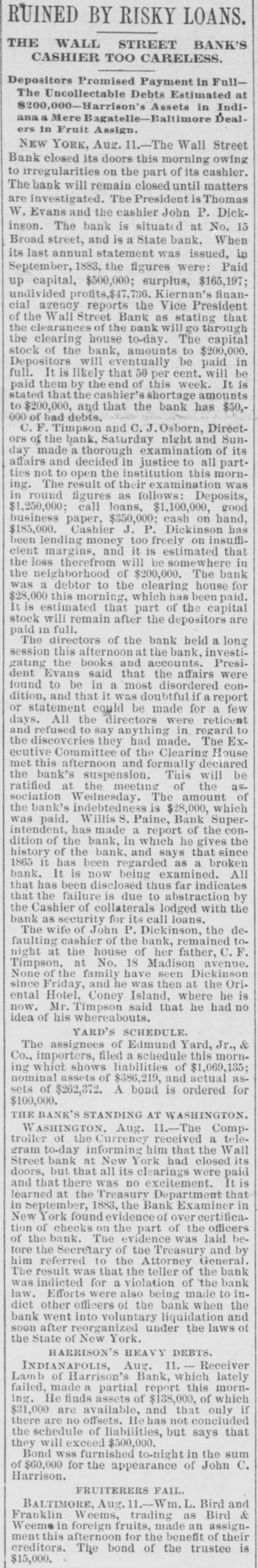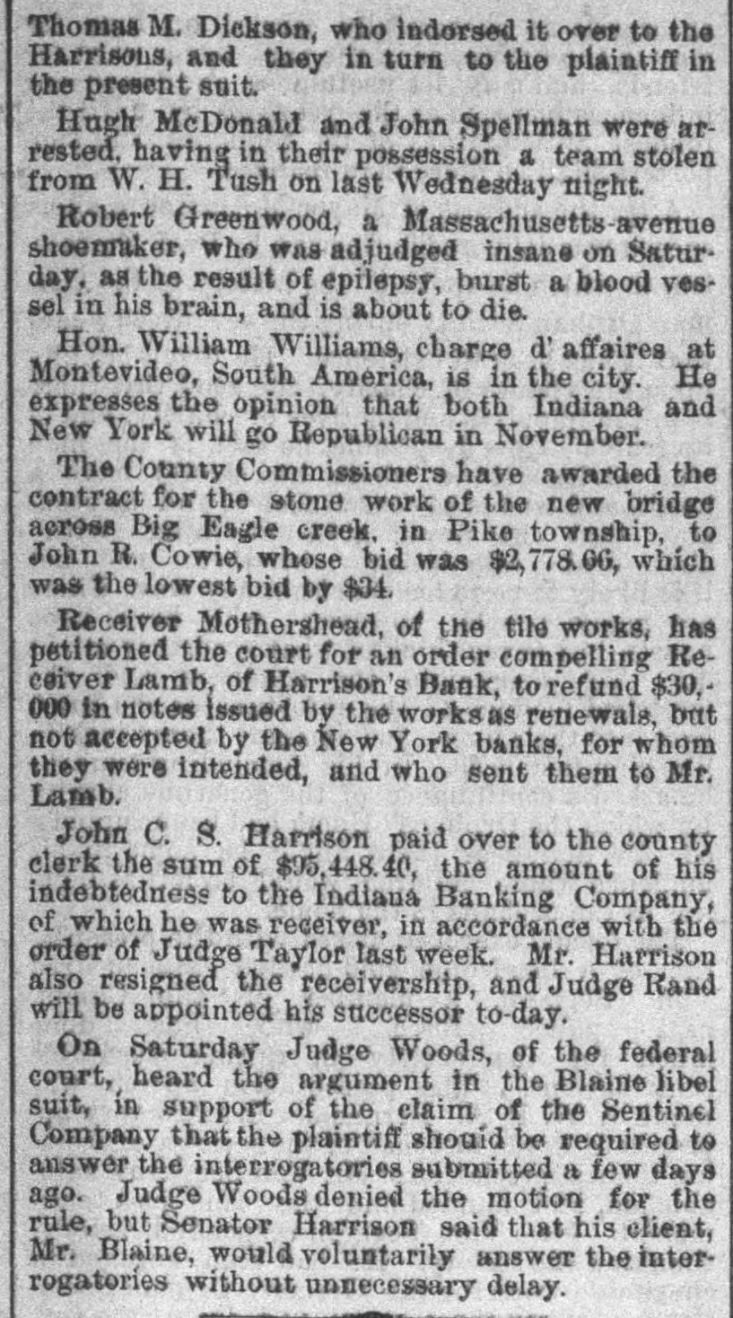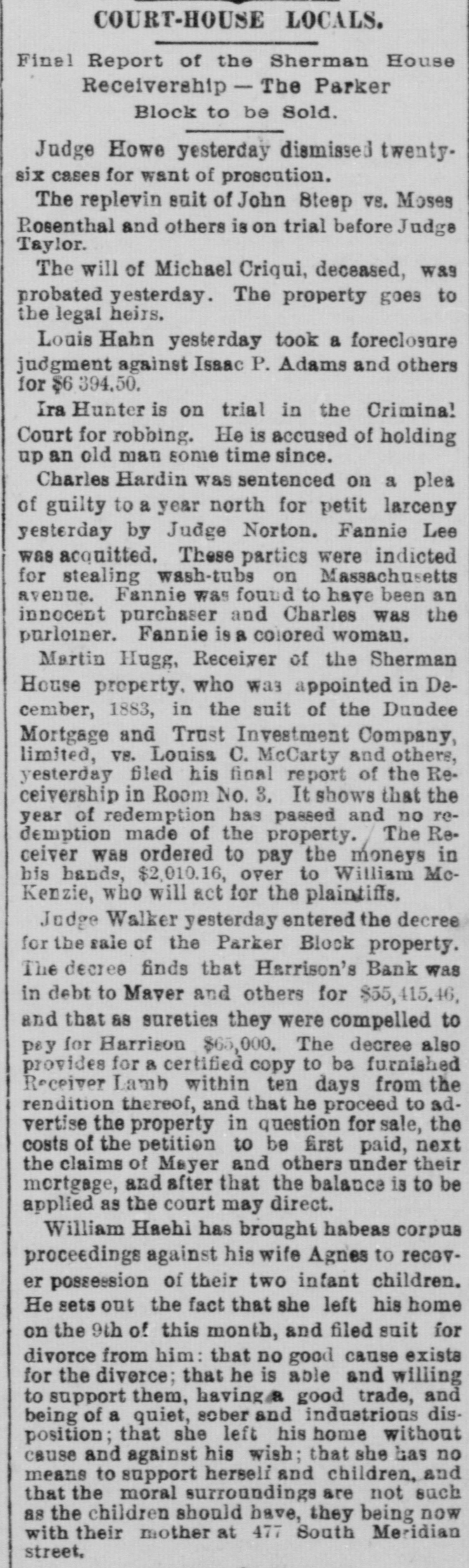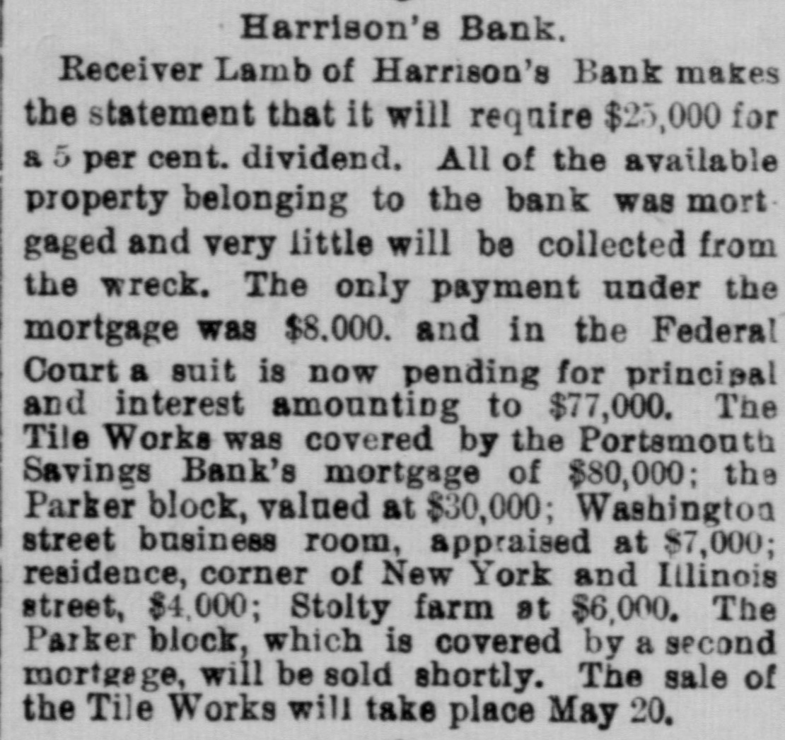 Total $50,818.87 From the above it will be seen that the balances at the clearing-house yesterday were small. Indeed, they were not over one-half the ordinary amount when business is brisk. This indicates that the people are not drawing heavily on the banks, and shows their confidence in them. With the exception of that against Harrison's Bank, the balances were insignificant when compared with what often occurs at the clearing-house in ordinary times. All the banks that were indebted to the Clear ing-house paid their accounts promptly, and the others were paid in turn. When his account was presented by Mr. Woollen, Mr. Harrison said he would not pay it. Some of the checks, he said, he would like to pay, but others he would not, and he asked Mr. Woollen to be allowed to make his selection. This was refused and Mr. Woollen returned the checks on Harrisons' Bank to the various banks whence they came. Mr. Harrison visited several of these and paid off a number of small checks, particularly those that were given on payment of obligations. The clearances of Harrison's bank were there-. fore: cancelled, and it was ruled out of the Clearance-house Association, because it had not met its obligations as required by the rules. After 4 o'clock payment was again demanded on certain certified checks and like obligations, and when it was refused they were protested. Their amount, it is understood, is between $3,000 and $4,000. THE BANK AND ITS DEPOSITORS. The depositors of Harrison's bank are not Bearly so numerous as those of other like institutions. An inquiry of one of the clerks as to the exact number was not productive of the decired information. Among other bankers, howover, it was variously estimated at from 300 to 400, and the total: amount of deposits at from $300,000 to $600,000. There are a great many trust funds among these, deposited by guardians, administrators, etc., on whose official bonds Mr. Harrison is among the securities. Several treasurers of out counties have their funds here and one or two officials from this city, but they claim to be amply protected. In the assessment list made April 1 of this year the assets and liabilities of the bank are given by Mr. Harrison as follows: Amount of money on hand $17,974 Amount in other banks 4,368 Bills receivable 478,459 Bonds and stocks 21,058 Legal tender (exempt from taxation) 45,100 Total $566,959 The deposits by others in the bank is given at $598,729. An examination of the books in the city treasurer's office shows that the banking firm of A. & J. C. S. Harrison own property valued at $71,750. The senior member is credited with property valued at $22,550, and the junior member at $30,800. The above figures may not at all represent the condition of affairs at the present time, but they are given for what they are worth. A complication of the present trouble is the fact that Mr. J. C. S. Harrison is receiver of he Indiana Banking Company, which failed a ear ago, and which has thus far only paid a sin-