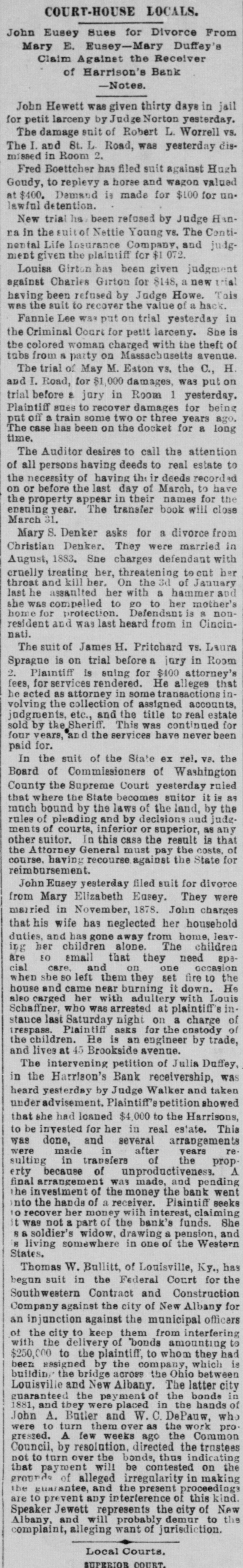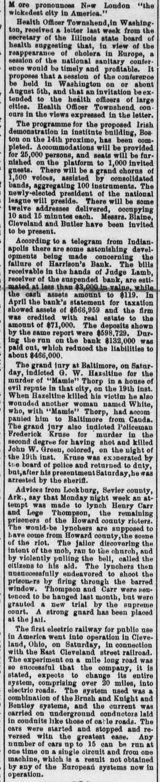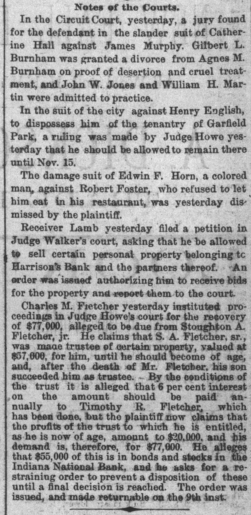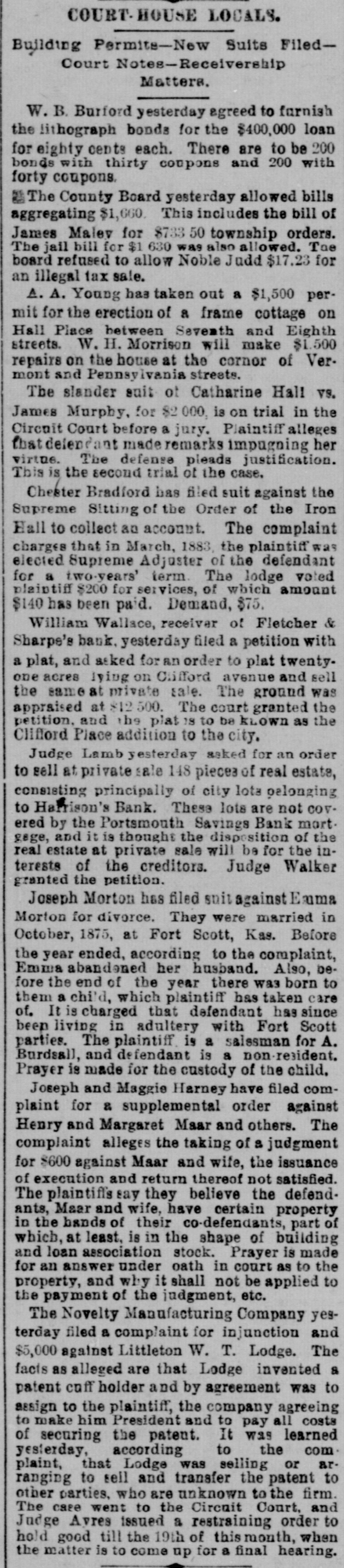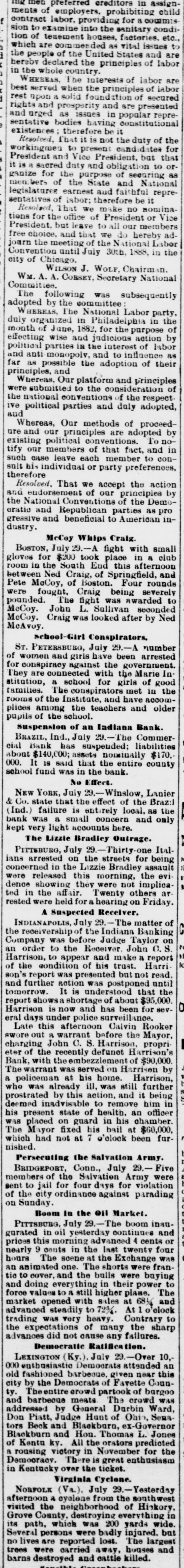 Total $50,818.87 From the above it will be seen that the balances at the clearing-house yesterday were small. Indeed, they were not over one-half the ordinary amount when business is brisk. This indicates that the people are not drawing heavily on the banks, and shows their confidence in them. With the exception of that against Harrison's Bank, the balances were insignificant when compared with what often occurs at the clearing-house in ordinary times. All the banks that were indebted to the Clear ing-house paid their accounts promptly, and the others were paid in turn. When his account was presented by Mr. Woollen, Mr. Harrison said he would not pay it. Some of the checks, he said, he would like to pay, but others he would not, and he asked Mr. Woollen to be allowed to make his selection. This was refused and Mr. Woollen returned the checks on Harrisons' Bank to the various banks whence they came. Mr. Harrison visited several of these and paid off a number of small checks, particularly those that were given on payment of obligations. The clearances of Harrison's bank were there-. fore: cancelled, and it was ruled out of the Clearance-house Association, because it had not met its obligations as required by the rules. After 4 o'clock payment was again demanded on certain certified checks and like obligations, and when it was refused they were protested. Their amount, it is understood, is between $3,000 and $4,000. THE BANK AND ITS DEPOSITORS. The depositors of Harrison's bank are not Bearly so numerous as those of other like institutions. An inquiry of one of the clerks as to the exact number was not productive of the decired information. Among other bankers, howover, it was variously estimated at from 300 to 400, and the total: amount of deposits at from $300,000 to $600,000. There are a great many trust funds among these, deposited by guardians, administrators, etc., on whose official bonds Mr. Harrison is among the securities. Several treasurers of out counties have their funds here and one or two officials from this city, but they claim to be amply protected. In the assessment list made April 1 of this year the assets and liabilities of the bank are given by Mr. Harrison as follows: Amount of money on hand $17,974 Amount in other banks 4,368 Bills receivable 478,459 Bonds and stocks 21,058 Legal tender (exempt from taxation) 45,100 Total $566,959 The deposits by others in the bank is given at $598,729. An examination of the books in the city treasurer's office shows that the banking firm of A. & J. C. S. Harrison own property valued at $71,750. The senior member is credited with property valued at $22,550, and the junior member at $30,800. The above figures may not at all represent the condition of affairs at the present time, but they are given for what they are worth. A complication of the present trouble is the fact that Mr. J. C. S. Harrison is receiver of he Indiana Banking Company, which failed a ear ago, and which has thus far only paid a sin-
