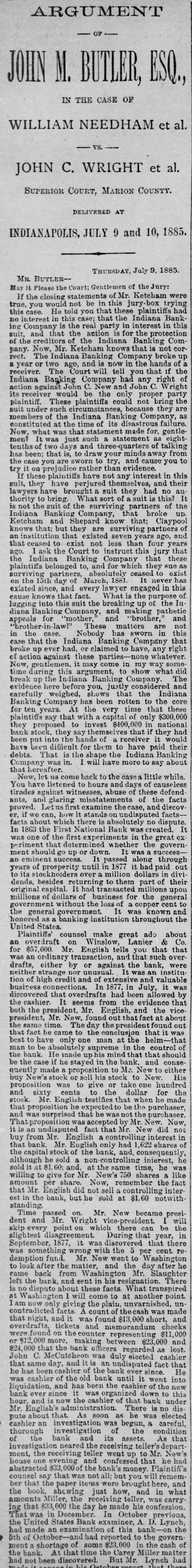 JOHN M. BUTLER, ESQ., IN THE CASE OF WILLIAM NEEDHAM et al. VS. JOHN C. WRIGHT et al. SUPERIOR COURT, MARION COUNTY. DELIVERED AT INDIANAPOLIS, JULY 9 and 10, 1885. THURSDAY, July 9, 1885. MR. BUTLER-May it Please the Court; Gentlemen of the Jury: If the closing statements of Mr. Ketcham were true, you would not be in this jury-box trying this case. He told you that these plaintiffs had no interest in this case; that the Indiana Banking Company is the real party in interest in this suit, and that the action is for the protection of the creditors of the Indiana Banking Company. Now, Mr. Ketcham knows that is not correct. The Indiana Banking Company broke up a year or two ago, and is now in the hands of a receiver. The Court will tell you that if the Indiana Banking Company had any right of action against John C. New and John C. Wright its receiver would be the only proper party plaintiff. These plaintiffs could not bring the suit under such circumstances, because they are members of the Indiana Banking Company, as constituted at the time of its disastrous failure. Now, what was that statement made for, gentlemen? It was just such a statement as eighttenths of two days and three-quarters of talking has been; that is, to draw your minds away from the case you are sworn to try, and cause you to try it on prejudice rather than evidence. If these plaintiffs have not any interest in this suit, they have perjured themselves, and their lawyers have brought a suit they had no au thority to bring. What sort of suit is this? It is not the suit of the surviving partners of the Indiana Banking Company, that broke up. Ketcham and Shepard know that: Claypool knows that: but they are surviving partners of an institution that existed seven years ago, and that ceased to exist not less than four years ago. ask the Court to instruct this jury that the Indiana Banking Company that these plaintiffs belonged to, and for which they sue as surviving partners, absolutely ceased to exist on the 15th day of March, 1881. It never has existed since, and every lawyer engaged in this cause knows that fact. What is the purpose of lugging into this suit the breaking up of the In diana Banking Company, and making pathetic appeals for 'mother, and brother, and "brother- in law?" These matters are not in the case. Nobody has sworn in this case that the Indiana Banking Company that broke up ever had, or claimed to have, any right of action against these parties-none whatever Now, gentlemen, it may come in my way sometime during this argument, to show what did break up the Indiana Banking Company. The evidence here before you, justly considered and carefully weighed, shows that the Indiana Banking Company has been rotten to the core for ten years. At the very time that these plaintiffs say that with a capital of only $300,000 they proposed to invest $400,000 in national bank stock, they say themselves that if they had been put into the hands of a receiver it would have been difficult for them to have paid their debts. That is the shape the Indiana Banking Company was in. I will have more to say about that hereafter. Now, let us come back to the cases little while. You have listened to hours and days of causeless tirades against witnesses, abuse of these defend ants, and glaring misstatements of the facts proved. us first examine the case, and discov er. if we can, how it stands on undisputed facts-facts about which there is absolutely no dispute. In 1863 the First National Bank was created. It was one of the first experiments in the great ex periment that determined whether the government should go up or down. It was a successan eminent success. It passed along through years of prosperity until in 1877 it had paid out to its stockholders over a million dollars in divi dends, besides returning to them part of their original capital. It had transacted millions upon millions of dollars of business for the general government without the loss of a copper cent to the general government It was known and honored as a banking institution throughout the United States. Plaintiffs' counsel make great ado about an overdraft on Winslow, Lanier & Co. for $57,000 Mr. English tells you that that was an ordinary transaction, and that such overdrafts, either by or against the bank, were neither strange nor unusual. It was an institution of high credit and of extensive and valuable business connections. In 1877, in July, it was discovered that overdrafts had been allowed by the cashier. It seems from the evidence that both the president, Mr. English, and the vicepresident, Mr. New, found out that fact at about the same time. The day the president found out that fact he came to the conclusion that it was best to have only one man at the helm-that man to be absolutely supreme in the control of the bank. He made up his mind that that should be the case if he stayed in the bank. and consequently made a proposition to M. New to either buy New's stock or sell his stock to New. His proposition was to give or take one hundred and sixty cents to the dollar for the stock. Mr. English testifies that when he made that proposition he expected to be the purchaser, and was surprised that he was not the purchaser. That proposition was accepted by Mr. New. Now, it is an undisputed fact that Mr. New did not buy from Mr. English a controlling interest in that bank. Mr. English only had 1,622 shares of the capital stock of the bank, and, consequently, although he sold a non controlling inierest, he sold it at $1 60: and, at the same time, he was willing to give for Mr. New's 750 shares a like amount per share. Now, remember the fact that Mr. English did not sell a controlling interest in the bank, but he sold at $1.60 notwith standing. Time passed on. Mr. New became president and Mr. Wright vice president. I will skip every point on which there can be the slightest disagreement. During that year, in September, 1877, it was discovered that there was something wrong w
