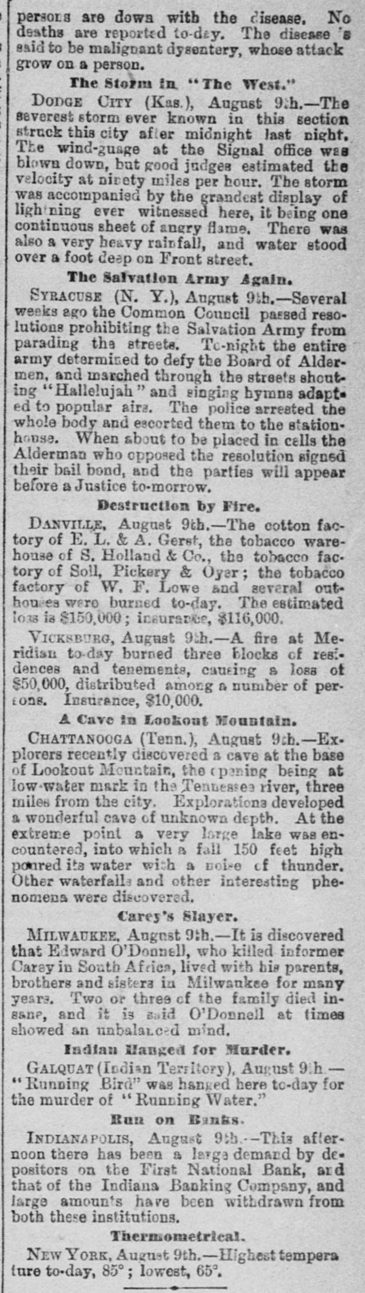 persons are down with the disease, No deaths are reported to-day. The disease 's said to be malignant dysentery, whose attack grow on a person. The Storm in "The West." DODGE CITY (Kas.), August 9th.-The severest storm ever known in this section struck this city after midnight last night, The wind-guage at the Signal office was blown down, but good judges estimated the velocity at nicety miles per hour. The storm was accompanied by the grandest display of lightning ever witnessed here, it being one continuous sheet of angry flame, There was also a very heavy rainfall, and water stood over a foot deep on Front street. The Salvation Army Again. SYRACUSE (N. Y.), August 9th.-Several weeks ago the Common Council passed resolutions prohibiting the Salvation Army from parading the streets. To-night the entire army determised to defy the Board of Aldermen, and marched through the streets shouting "Hallelujah" and singing hymns adapt ed to popular airs. The police arreated the whole body and escorted them to the stationhouse. When about to be placed in cells the Alderman who opposed the resolution signed their bail bond, and the parties will appear before a Justice to-morrow. Destruction by Fire. DANVILLE, August 9th.-The cotton factory of E. L. & A. Gerst, the tobacco warehouse of S. Holland & Co., the tobacco factory of Soll, Pickery & Oyer; the tobacco factory of W. F. Lowe and several outhouses were burned to-day. The estimated loss is $150,000; insurance, $116,000. VICKSBURG, August 9th.-A fire at Meridian to-day burned three blocks of residences and tenements, causing S loss of $50,000, distributed among a number of perLODS. Insurance, $10,000. A Cave in Lookout Mountain. CHATTANOOGA (Tenn.), August 9th.-Explorers recently discovered a cave at the base of Lookout Mountain, the opening being at low water mark in the Tennesses river, three miles from the city, Explorationa developed a wonderful cave of unknown depth. At the extreme point a very large lake was encountered, into which a fall 150 feet high poured its water with a noise of thunder. Other waterfalls and other interesting phenomens were discovered. Carey's Slayer. MILWAUKEE, August 9th.-It is discovered that Edward O'Donnell, who killed informer Carey in South Africa, lived with his parents, brothers and sisters in Milwaukee for many years. Two or three of the family died insane, and it is said O'Donnell at times showed an unbalanced mind. Indian Hanged for Murder. GALQUAT (Indian Territory), August 9.h.Running Bird" was hanged here to-day for the murder of Running Water." Run on Banks. INDIANAPOLIS, August 9th -This afternoon there has been & larga demand by depositors on the First National Bank, and that of the Indiana Banking Company, and large amounts have been withdrawn from both these institutions. Thermometrical. NEW York, August 9th.-Highest tempera ture to-day, 85° ; lowest, 65°.