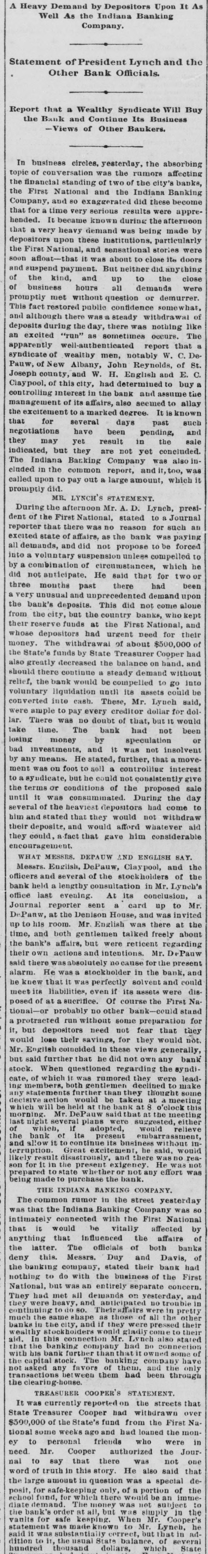 As It As Well Demand by Depositors Banking Upon A Heavy the Indiana Company. the Statement of President Lynch and Other Bank Officials. Buy the Report that a Wealthy Continue Syndicate Its Business Will Bank -Views and of Other Bankers. In business circles, yesterday, the rumors the absorbing affecting topic of conversation was of two of the city's Banking banks, and the financial standing and the Indiana become the First National 80 exaggerated did these were appreCompany, a time very serious during results the afternoon that for became known made by a very heavy institutions. hended. It demand was being particularly it depositors that upon these sensational stories were afloat-that the First National, and was about to close its doors neither did anything soon suspend payment. But to the close hours of and the kind, and all up demands were demurrer. of business met without question or somewhat, promptly restored public confidence withdrawal of This fact was steady like as "run" and although there there was nothing The deposits during the day, sometimes occurs. that a an excited weil-authenticated notably report W. C. Deapparently wealthy men, Reynolds, of St. Pauw, syndicate of of New Albany, W. John H. English and buy E. C. a Joseph county, this city, and had determined assume to the Clay pool, of in the bank and allay the controlling interest its affairs, also seemed It is to known management excitement of to marked days degree. past such and that for several have been pending, the sale negotiations yet result in concluded. they may but they are not yet was also called upon indicated, Indiana Backing Company report, and too, was it cluded The in the to pay common out a large amount, which promptly did. LYNCH'S STATEMENT. presiDuring the MR. afternoon Mr. stated A.D. Lynch, to a Journal dent of the First there National, was no reason for was such paying an excited reporter state that of affairs, not as the propose bank to be forced all demands, and enspension did unless compelled which he to did not into a voluntary of circumstances, for two or there by a combination anticipate. He said that had been three months past unprecedented demand alone upon unusual and did not come a very bank's deposits. This banks, who kept from the the city, but the country the First National, their and their reserve depositors funds had at urgent about need $500,000 for of whose The withdrawal of Cooper had money. funds by State Treasurer on hand. and a also the State's greatly decreased the steady balance demand without into voluntary should there bank continue would be compelled assets to could go be into cash. These, relief, the liquidation until ite Mr. Lynch said, for doldollar creditor converted ample to pay every of that, but it would been were There was no doubt had not or lar. time. The bank speculation any means. losing take money and by it was not insolvent movea sell controlling bad investments. He stated, further, that interest a give ment by was on foot to he could not consistently sale a syndicate but of the proposed the day to terms or conditions During to the was consummated. had come until it of the heaviest depositors would not withdraw several and stated that they afford whatever aid they could, their him deposite, fact and that would gave him considerable encouragement. DEPAUY AND ENGLISH and SAY the of Messrs. WHAT MESSRS. English, DePauw, the stockholders Claypool, Lynch's of the At officers held and a several lengthy consultation its conclusion, in Mr. Mr. bank office last reporter evening. sent a card and up was to invited Mr. Journal DePanw, at the Denison English House, was there at about the up to his room. both gentlemen talked reticent freely regarding time, and but were Mr. DePauw the bank's affairs, and intentions. the present their own actions no cause for and said there as absolutely stockholder in the bank, and could alarm. He that was it was perfectly solvent assets were dismeetits knew liabilities, even Of course its the First stand Na tional-or some posed of at probably subrifice. no other preparation k-could for they protracted run without need not fear would that not. a but depositors savings, for they generally, would it. lose their in these views bank Mr. English coincided that he did not own any the syndibut said further questioned regarding were leadstock. When rumored they to make of which both gentlemen thought 80 cate, ing statements members, further would was be than taken they declined at a t a meeting o'clock some this decisive any action be held at the said bank that the meeting either morning. several plans adopted, which will Mr. DePauw were suggested, would relieve sement, inlast night which, present without of bank of continue its its business he said. would and the allow it Great excitement and there He was reafor it in the whether terruption. likely custrously present exigency. not any effort was son state the bank. being prepared made to purchase BANKING COMPANY. INDIANA street yesterday common THE rumor Banking in the Company was was The that the Indiana with the First affected National by intimately connected he vitally affairs of that it would influenced the banks anything that The officials of and both Davis, of the latter. this. Messrs. stated Duy their bank First had nothing deny banking company, the business of the aD had the to do with entirely separate concern. and vesterday, continuing National, but met was all dewands anticipated on no trouble in pretty in shape They they were heavy, and Their rifairs as those were all pressed the other their much the in the city, same and if would they gladly were come also stated their banks shoiders connection Mr. Lynch no connection of wealthy In this company that had it owned some aid. the banking than company have that his bank further The banking and the only transactions not asked any tween them with the capita stock. favore of them, had been through that the the clearing-honee COOPER'S STATEMENT.