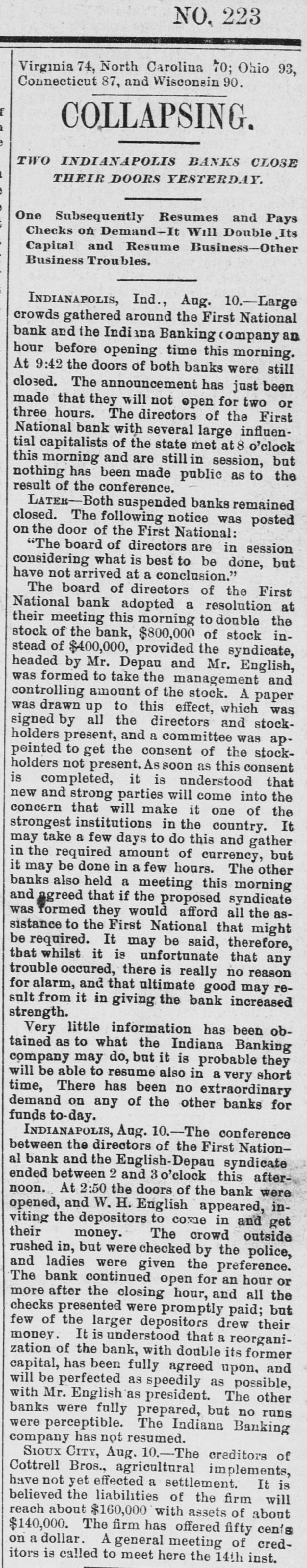 NO, 223 Virginia ? North Carolina 70; Ohio 93, Connecticut 87, and Wisconsin 90. f COLLAPSING. h $ TWO INDIANAPOLIS BANKS CLOSE 1 THEIR DOORS YESTERDAY. One Subsequently Resumes and Pays Checks on Demand-It Will Double,Its Capital and Resume Business-Other Business Troubles. INDIANAPOLIS, Ind., Aug. 10.-Large crowds gathered around the First National bank and the Indiana Banking company an hour before opening time this morning. At 9:42 the doors of both banks were still closed. The announcement has just been made that they will not open for two or three hours. The directors of the First National bank with several large influential capitalists of the state met at 8 o'clock this morning and are still in session, but nothing has been made public as to the result of the conference. LATER-Both suspended banks remained closed. The following notice was posted on the door of the First National: "The board of directors are in session considering what is best to be done, but have not arrived at a conclusion." The board of directors of the First National bank adopted a resolution at their meeting this morning to double the stock of the bank, $800,000 of stock instead of $400,000, provided the syndicate, headed by Mr. Depau and Mr. English, was formed to take the management and controlling amount of the stock. A paper was drawn up to this effect, which was signed by all the directors and stockholders present, and a committee was appointed to get the consent of the stockholders not present. Assoon as this consent is completed, it is understood that new and strong parties will come into the concern that will make it one of the strongest institutions in the country. It may take a few days to do this and gather in the required amount of currency, but it may be done in a few hours. The other banks also held a meeting this morning and agreed that if the proposed syndicate was formed they would afford all the assistance to the First National that might be required. It may be said, therefore, that whilst it is unfortunate that any trouble occured, there is really no reason for alarm, and that ultimate good may result from it in giving the bank increased strength. Very little information has been obtained as Indiana to what the Banking company may do, but it is probable they will be able to resume also in a very short time, There has been no extraordinary demand on any of the other banks for funds to-day. INDIANAPOLIS, Aug. 10.-The conference between the directors of the First National bank and the English-Depau syndicate ended between 2 and 3 o'clock this afternoon. At 2:50 the doors of the bank were opened, and W. English appeared, inviting the depositors to come in and get their money. The crowd outside rushed in, but were checked by the police, and ladies were given the preference. The bank continued open for an hour or more after the closing hour, and all the checks presented were promptly paid; but few of the larger depositors drew their money. It is understood that a reorganization of the bank, with double its former capital, has been fully agreed upon, and will be perfected as speedily as possible, with Mr. English as president. The other banks were fully prepared, but no runs were perceptible. The Indiana Banking company has not resumed. SIOUX CITY, Aug. 10.-The creditors of Cottrell Bros., agricultural implements, have not yet effected a settlement. It is believed the liabilities of the firm will reach about $160,000 with assets of about $140,000. The firm has offered fifty cents on a dollar. A general meeting of creditors is called to meet here the 14th inst.