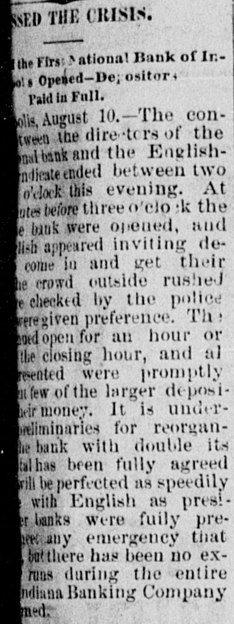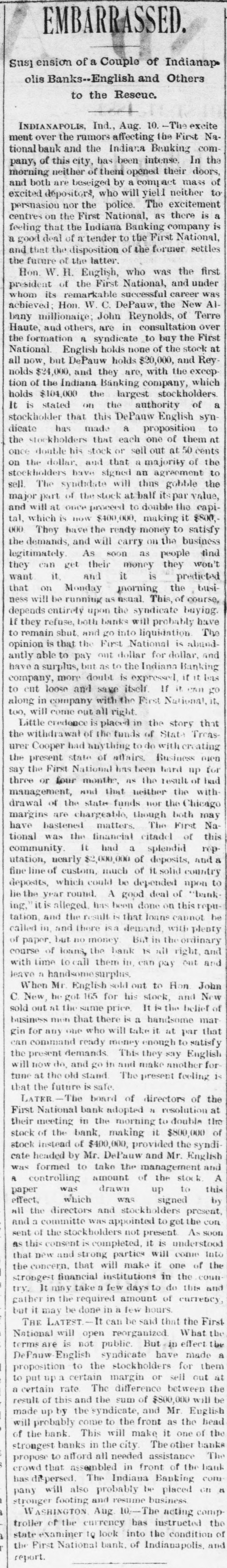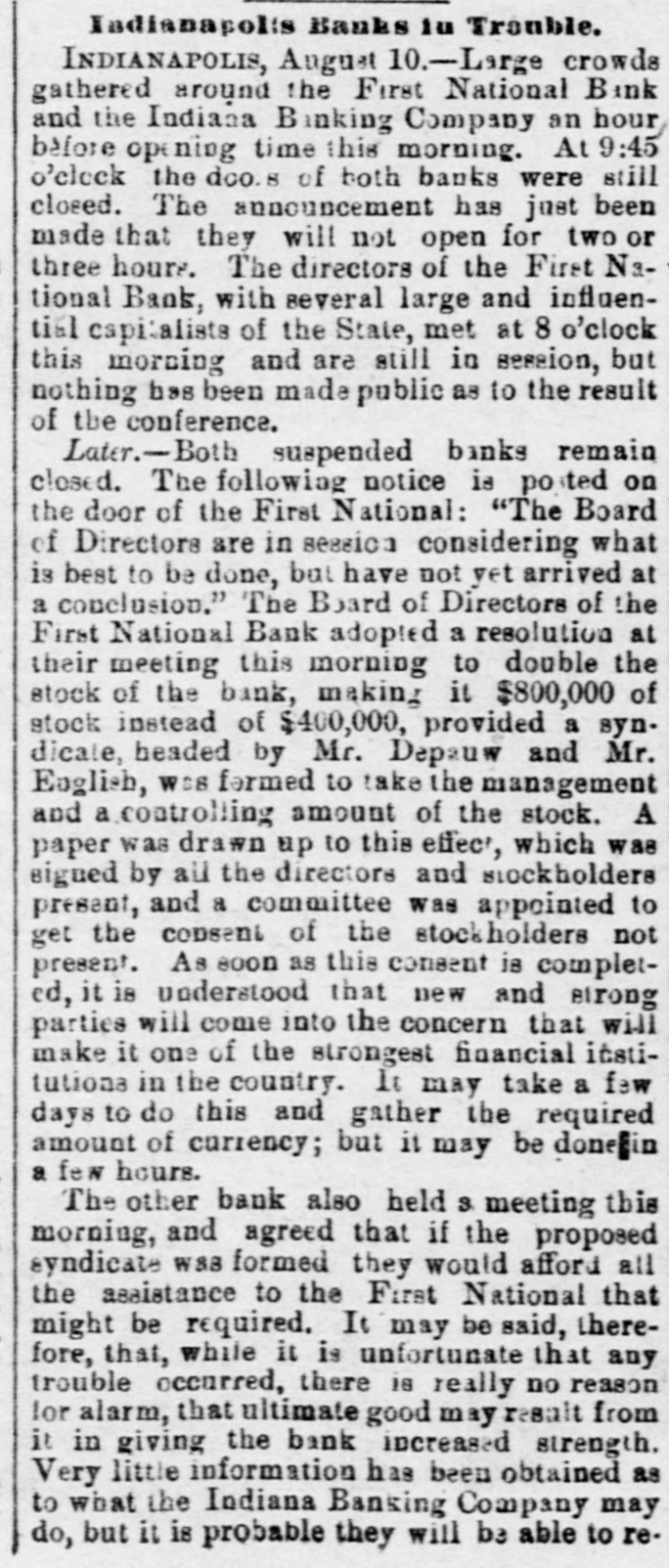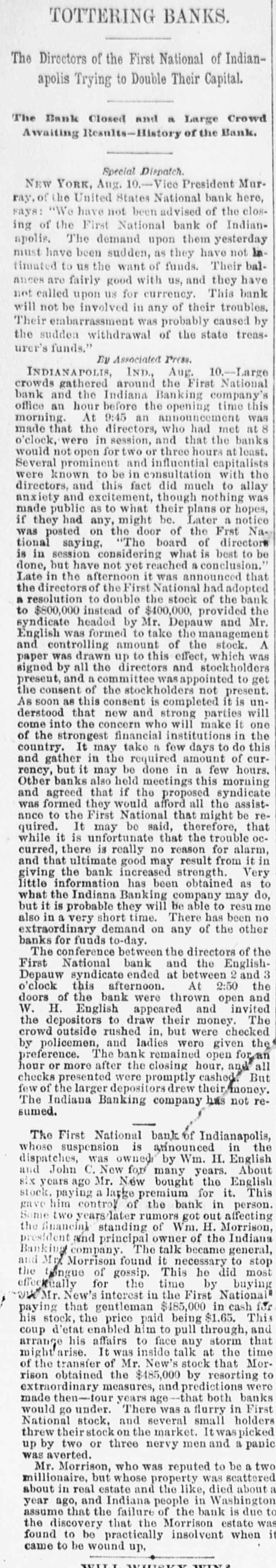 TOTTERING BANKS. The Directors of the First National of Indianapolis Trying to Double Their Capital. The Bank Closed and a Large Crowd Awaiting Results-History of the Bank. Special Dispatch. NEW YORK, Aug. Vice President Murray, of the United States National bank here, says: "We have not been advised of the closing of the First National bank of Indianapolis. The demand upon them yesterday must have been sudden, as they have not in. timated to us the want of funds. Their balances are fairly good with us, and they have not called upon us for currency. This bank will not be involved in of their was caused by Their embarrassment any probably troubles. the sudden withdrawal of the state treasurer's funds." By Associated Press. IND., crowds around the First INDIANAPOLIS, gathered Aug. 10.-Large National bank and the Indiana Banking company's office an hour before the opening time this morning. At 9:45 an announcement was made that the directors, who had met at 8 o'clock, were in session, and that the banks would not open for two or three hours at least. Several prominent and influential capitalists were known to be in consultation with the directors, and this fact did much to allay anxiety and excitement, though nothing was made public as to what their plans or hopes, if they had any, might be. Later a notice was posted on the door of the Frst National saying, "The board of director# is in session considering what is best to be done, but have not yet reached a conclusion.' Late in the afternoon it was announced that the directors of the First National had adopted a resolution to double the stock of the bank to $800,000 instead of $400,000, provided the and was to take the syndicate English headed formed by Mr. Depauw management Mr. and controlling amount of the stock. A paper was drawn up to this effect, which was signed by all the directors and stockholders present, and a committee was appointed to get the consent of the stockholders not present. As soon as this consent is completed it is understood that new and strong parties will come into the concern who will make it one of the strongest financial institutions in the country. It may take a few days to do this and gather in the required amount of currency, but it may be done in a few hours. Other banks also held meetings this morning and agreed that if the proposed syndicate was formed they would afford all the assistance to the First National that might be required. It may be said, therefore, that while it is unfortunate that the trouble occurred, there is really no reason for alarm, and that ultimate good may result from it in giving the bank increased strength. Very little information has been obtained as to what the Indiana Banking company may do, but is probable they will be able to resume also in a very short time. There has been no extraordinary demand on any of the other banks for funds to-day. The conference between the directors of the First National bank and the EnglishDepauw syndicate ended at between 2 and o'clock this afternoon. At 2:50 the doors of the bank were thrown open and W. H. English appeared and invited the depositors to draw their money. The crowd outside rushed in, but were checked by policemen, and ladies were given the remained for an or more the all were checks few hour preference. of the presented The after bank promptly closing hour. cashed. open and depositors drew The Indiana larger Banking company their money. has not But resumed. The First National bank of Indianapolis, whose suspension is arinounced was owned Wm. and New for dispatches, John C. many by years. H. in English About the six years ago Mr. New bought the English stock. paying a larie premium for it. This gave him control of the bank in person. Some two years/later rumors got out affecting the financial standing of Wm. H. Morrison. president and principal owner of the Indiana Banking company. The talk became general, and Mr Morrison found it necessary to stop the tangue of gossip. This he did most effectivally for the time by buying Mr. New's interest in the First National paying that gentleman $185,000 in cash for his stock, the price paid being $1.65. This coup d'etat enabled him to pull through, and arrange his affairs to face any storm that might arise. It was inside talk at the time of transfer of Mr. New's stock that Morrison obtained the $485,000 by resorting to extraordinary measures, and predictions were made years age-that both banks would go under. There was flurry in First National stock, and several small holders threw their stock on the market. spicked up by two or three nervy men and a panic was averted. Mr. Morrison, who was reputed to be a two millionaire, but whose property was scattered about in real estate and the like, died about a year ago, and Indiana people in Washington assume that the failure of the bank is due to the discovery that the Morrison estate was found to be practically insolvent when it came to be wound up, WITT WING