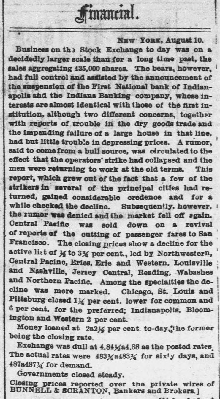 financial. NEW YORK, August 10. Businees on the Stock Exchange to day was on a decidedly larger scale than for a long time paet, the sales aggregating 435,000 shares. The bears, however, had full control and assisted by the announcement of the suspension of the First National bank of Indianspolis and the Indiana Banking company, whose interests are almost identical with those of the first institution, although two different concerns, together with reports of trouble in the dry goods trade and the impanding failure of a large house in that line, had but little trouble in depressing prices. A rumor, said to comefrom a bull source, was circulated to the effect that the operators' strike had collarsed and the men were returning to work at the old terms. This report, which grew out of the fact that a few of the strikers in several of the principal cities had returned, gained considerable credence and for a 1 while checked the decline. Subsequently, however, the rumor was denied and the market fell off again. Central Pacific was sold down on a revival of reports of the cutting of passenger fares to San Francisco. The closing prices show a decline for the active list of 1/5 to 33/4 per cent., led by Northwestern, Central Pacine, Eries, Erie and Western, Louisville and Nashville, Jersey Central, Reading, Wabashes and Northern Pacific. Among the specialties the decline was more marked. Chicago, St. Louis and Pittsburg closed 11/4 per cent. lower for common and 6 per cent. for the preferred; Indianapolis, Bloomington and Western 2 per cent. Money loaned at 2a21/6 per cent. to-day "ihe former being the closing rate. Exchange was dull at as the posted rates The actual rates were 48344833 for sixty days, and 487a48714 for demand. Governments closed steady. Closing prices reported over the private wires of BUNNELL & SCRANTON, Bankers and Brokers.]