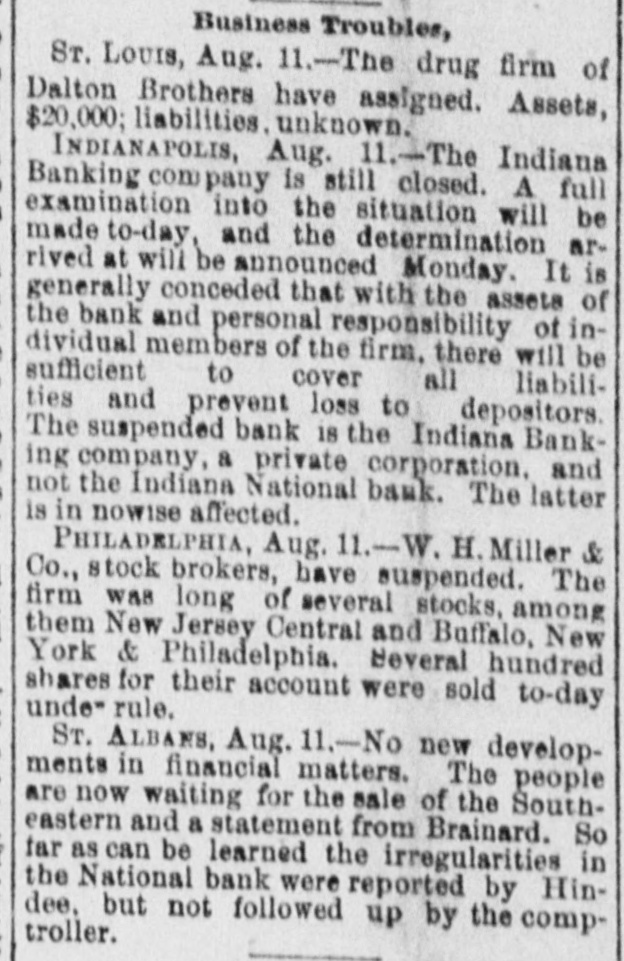 Business Troubles, Sr. LOUIS, Aug. 11.-The drug firm of Dalton Brothers have assigned. Assets, $20,000; liabilities. unknown. INDIANAPOLIS, Aug. 11.-The Indiana Banking company is still closed. A full examination into the situation will be made to-day, and the determination arrived at will be announced Monday. It is generally conceded that with the assets of the bank and personal responsibility of individual members of the firm. there will be sufficient to cover all liabilities and prevent loss to depositors. The suspended bank 18 the Indiana Banking company, a private corporation. and not the Indiana National bank. The latter is in nowise affected. PHILADELPHIA, Aug. 11.-W. H. Miller & Co., stock brokers, have suspended. The firm was long of several stocks, among them New Jersey Central and Buffalo, New York & Philadelphia. Several hundred shares for their account were sold to-day unde= rule. ST. ALBANS, Aug. 11.-No new developments in financial matters. The people are now waiting for the sale of the Southeastern and a statement from Brainard. So far as can be learned the irregularities in the National bank were reported by Hindee, but not followed up by the comptroller.