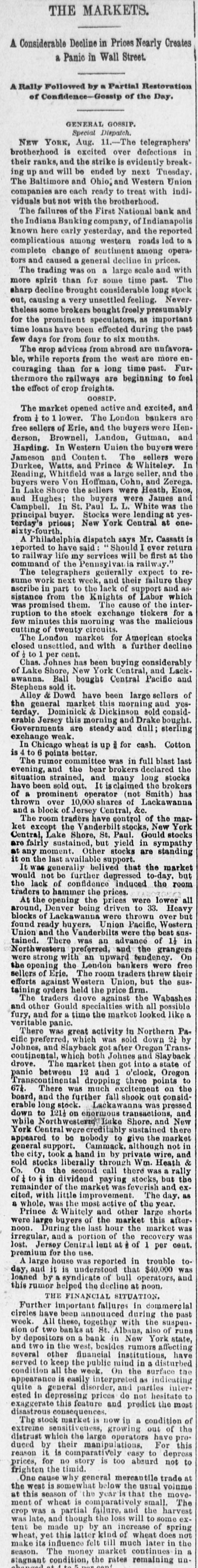 # THE MARKETS. A Considerable Decline in Prices Nearly Creates a Panic in Wall Street. A Rally Followed by a Partial Restoration of Confidence-Gossip of the Day. GENERAL GOSSIP. Special Dispatch. NEW YORK, Aug. 11. The telegraphers' brotherhood is excited over defections in their ranks, and the strike is evidently break- ing up and will be ended by next Tuesday. The Baltimore and Ohio, and Western Union companies are each ready to treat with indi- viduals but not with the brotherhood. The failures of the First National bank and the Indiana Banking company, of Indianapolis known here early yesterday, and the reported complications among western roads led to a complete change of sentiment among opera- tors and caused a general decline in prices. The trading was on a large scale and with more spirit than for some time past. The sharp decline brought considerable long stock out, causing a very unsettled feeling. Never- theless some brokers bought freely presumably for the prominent speculators, as important time loans have been effected during the past few days for from four to six months. The crop advices from abroad are unfavora- ble, while reports from the west are more en- couraging than for a long time past. Fur- thermore the railways are beginning to feel the effect of crop freights. GOSSIP. The market opened active and excited, and from to 1 lower. The London bankers are free sellers of Erie, and the buyers were Hen- derson, Brownell, Landon, Gutman, and Harding. In Western Union the buyers were Jameson and Content. The sellers were Durkee, Watts, and Prince & Whiteley. In Reading, Whitfield was a large seller, and the buyers were Von Hoffman, Cohn, and Zerega. In Lake Shore the sellers were Heath, Enos, and Hughes; the buyers were James and Campbell. In St. Paul L. L. White was the principal buyer. Stocks were lending at yes- terday's prices; New York Central at one- sixty-fourth, A Philadelphia dispatch says Mr. Cassatt is reported to have said: "Should I ever return to railway life my services will be first at the command of the Pennsylvania railway." The telegraphers generally expect to re- sume work next week, and their failure they ascribe in part to the lack of support and as- sistance from the Knights of Labor which was promised them. The cause of the inter- ruption to the stock exchange tickers for a few minutes this morning was the malicious cutting of twenty circuits. The London market for American stocks closed unsettled, and with a further decline of to 1 per cent. Chas. Johnes has been buying considerably of Lake Shore, New York Central, and Lack- awanna. Ball bought Central Pacific and Stephens sold it. Alley & Dowd have been large sellers of the general market this morning and yes- terday. Dominick & Dickinson sold consid- erable Jersey this morning and Drake bought. Governments are steady and dull; sterling exchange weak. In Chicago wheat is up for cash. Cotton is 4 to 6 points better. The rumor committee was in full blast last evening, and the bear brokers declared the situation strained, and many long stocks have been sold out. It is claimed the brokers of a prominent operator (not Smith) has thrown over 10,000 shares of Lackawanna and a block of Jersey Central, &c. The room traders have control of the mar- ket excopt the Vanderbilt stocks, New York Central, Lake Shore, St. Paul. Gould stocks are fairly sustained, but yield in sympathy at any moment. Other stocks are standing it on the last available support. It was generally belived that the market would not be further depressed to-day, but the lack of confidence induced the room traders to hammer the prices. At the opening the prices were lower all around, Denver being driven to 33. Heavy blocks of Lackawanna were thrown over but found ready buyers, Union Pacific, Western Union and the Vanderbilts were the best sus- tained. There was an advance of 1 in Northwestern preferred, and the grangers were strong with an upward tendency. On the opening the London bankers were free sellers of Erie. The room traders threw their efforts against Western Union, but the sus- taining orders held the price firm. The traders drove against the Wabashes and other Gould specialties with all possible fury, and for a time the market looked like a veritable panic. There was great activity in Northern Pa- cific preferred, which was sold down 2 by Johnes, and Slayback got after Oregon Trans- continental, which both Johnes and Slayback drove. The market then got into a state of panic between 12 and 1 o'clock, Oregon Transcontinental dropping three points to 674. There was much excitement on the board, and the further fall shook out consid- erable long stock. Lackawanna was pressed down to 1214 on enormous transactions, and while Northwestern Lake Shore, and New York Central were creditably sustained there appeared to be nobody to give the market general support. Cammack, although not in the city, took a hand in by private wire, and sold stocks liberally through Wm. Heath & Co. On the second call there was a rally of to in dividend paying stocks, but the remainder of the market was feverish and ex- cited, with little improvement. The day, as a whole, was the most active of the year. Prince & Whitely and other large shorts were large buyers of the market this after- noon. During the last hour the market was irregular, and a portion of the recovery was lost. Jersey Central lent at of 1 per cent. premium for the use. A large house was reported in trouble to- day, and it is understood that $40,000 was loaned by a syndicate of bull operators, and this rumor helped the decline at noon. # THE FINANCIAL SITUATION. Further important failures in commercial circles have been announced during the past week. All these, together with the suspen- sion of two banks at St. Albans, also of runs by depositors on a bank in New York state, and two in the west, besides rumors affecting several other financial institutions, have served to keep the public mind in a