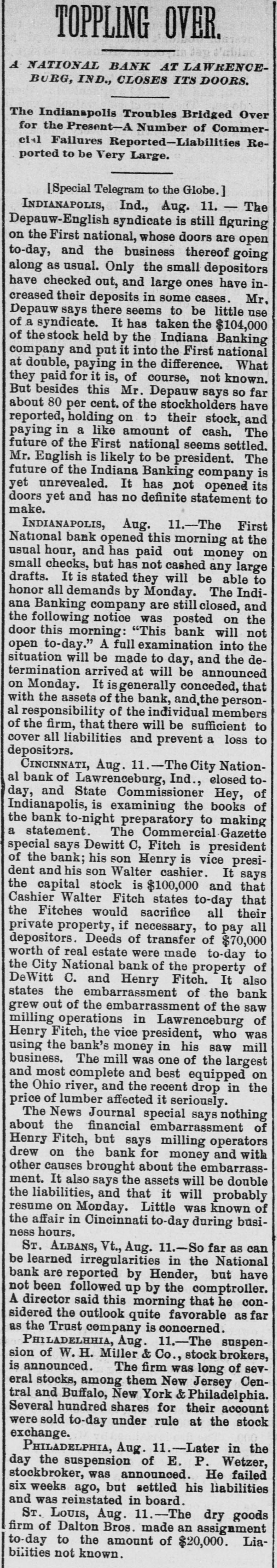 TOPPLING OVER. A NATIONAL BANK AT LAWRENCEBURG, IND., CLOSES ITS DOORS. The Indianapolis Troubles Bridged Over for the Present-A Number of Commerci+ Failures Reported-Liabilities Reported to be Very Large. [Special Telegram to the Globe.] INDIANAPOLIS, Ind., Aug. 11. - The Depauw-English syndicate is still figuring on the First national, whose doors are open to-day, and the business thereof going along as usual. Only the small depositors have checked out, and large ones have increased their deposits in some cases. Mr. Depauw says there seems to be little use of a syndicate. It has taken the $104,000 of the stock held company and put by it the into Indiana the difference. First Banking national What at double, paying in the they paid for it is, of course, not known. But besides this Mr. Depauw says so far about 80 cent. on and reported, per holding of the to stockholders their stock, have in a The future the First seems paying of like amount national of cash. settled. Mr. English is likely to be president. The future of the Indiana Banking company is yet unrevealed. It has not opened its doors yet and has no definite statement to make. INDIANAPOLIS, Aug. 11.-The First National bank opened this morning at the usual hour, and has paid out money on small checks, but has not cashed any large drafts. It is stated they will be able to honor all demands by Monday. The Indiana Banking company are still closed, and the following notice was posted on the door this morning: "This bank will not open to-day." A full examination into the situation will be made to day, and the determination arrived at will be announced on Monday. It generally conceded, that with the assets of the bank, and, the personal responsibility of the individual members of the firm, that there will be sufficient to cover all liabilities and prevent a loss to depositors. CINCINNATI, Aug. 11.-The City National bank of Lawrenceburg, Ind., closed today, and State Commissioner Hey, of Indianapolis, is examining the books of the bank to-night preparatory to making a statement. The Commercial Gazette special says Dewitt C, Fitch is president of the bank; his son Henry is vice president and his son Walter cashier. It says the capital stock is $100,000 and that Cashier Walter Fitch states to-day that the Fitches would sacrifice all their private property, if necessary, to pay all depositors. Deeds of transfer of $70,000 worth of real estate were made to-day to the of DeWitt C. and also City National bank Henry of the Fitch. property It states the embarrassment of the bank grew out of the embarrassment of the saw milling operations in Lawrenceburg of Henry Fitch, the vice president, who was using the bank's money in his saw mill business. The mill was one of the largest and most complete and best equipped on the Ohio river, and the recent drop in the price of lumber affected it seriously. The News Journal special says nothing about the financial embarrassment of Henry Fitch, but says milling operators drew on the bank for money and with other causes brought about the embarrassment. It also says the assets will be double the liabilities, and that it will probably resume on Monday. Little was known of the affair in Cincinnati to-day during business hours. ST. ALBANS, Vt., Aug. 11.-So far as can be learned irregularities in the National bank are reported by Hender, but have not been followed up by the comptroller. A director said this morning that he considered the outlook quite favorable as far as the Trust company is concerned. PHILADELHHIA, Aug. 11.-The suspension of W. H. Miller & Co., stock brokers, is announced. The firm was long of several stocks, among them New Jersey Central and Buffalo, New York & Philadelphia. Several hundred shares for their account were sold to-day under rule at the stock exchange. PHILADELPHIA, Aug. 11.-Later in the day the suspension of E. P. Wetzer, stockbroker, was announced. He failed six weeks ago, but settled his liabilities and was reinstated in board. ST. LOUIS, Aug. 11.-The dry goods firm of Dalton Bros. made an assignment to-day to the amount of $20,000. Liabilities not known.