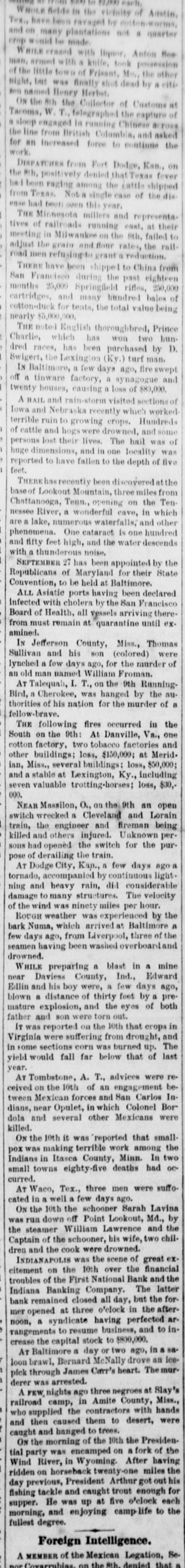 W fields in the viciolity of Arestin, Texa have been ravaged by cotton-worms, and on many plantations not . quarter crop would be made WHILE CRASED with Hquor, Anton Ree man, armed with a knife, took possession of the little town of Frisant, Me the other fright, but was finally shot dead by a citi tennamed Henry Herbet. ON the 8th the Collector of Customs Tacoma, W. T. telographed the capture sloop engaged in running Chinese across the line from British Columbia, and asked for an Increased force to continte the work DISPATCHER from Fort Dodge, Kan., on the 8th, positively denied that Texas fever lind been raging among the lattle shipped from Texas. Not a single case of the dis ease had been geen this year. THE Minnesota millers and representatives of railroads running east. at their meeting in Milwaukee on the 8th, failed adjust the grain and flour rates, the rail. road men refusing grant reduction. THERE have been shipped to China from San Francisco during the past eighteen months 25,000 Springfield rifles, 250,000 cartridges, and many hundred bales of cotton-duck for tents, the total value being nearly $5,000,000. THE noted English thoroughbred, Prince Charlie, which has won two bundred races, has been purchased by D. Swigert, the Lexington (Ky.) turf man. IN Baltimore, a few days ago, fire swept off a tinware factory, a synagogue and twenty houses, causing a loss of $80,000. HAIL and rain-storm visited sections Iowa and Nebraska recently which worked terrible ruin to growing crops. Hundreds of cattle and hogs were drowned, and some persons lost their lives. The hail was huge dimensions, and in one locality reported to have fallon to the depth of five feet. THERE has recently been discovered the base of Lookout Mountain, three miles from Chattanooga, Tenn., opening on the Tennessee River, a wonderful cave, in which are lake, numerous waterfalls; and other phenomena. One cataract is one hundred and fifty feet high, and the water descends with a thunderous noise. SEPTEMBER 27 has been appointed by the State Republicans of Maryland for their Convention, to be held at Baltimore. ALL Asiatic ports having been declared infected with cholera by the San Francisco Board of Health, all vessels arriving therefrom must remain at quarantine until examined. IN Jefferson County, Miss., Thomas Sullivan and his son (colored) were of lynched a fow days ago, for the murder an old man named William Froman. AT Talequah, I. T., on the 9th RanningBird, a Cherokee, was hanged by the aua thorities of his nation for the murder of fellow-brave. THE following fires occurred in the South on the 9th: At Danville, Va., one cotton factory, two tobacco factories and other buildings; loss, $150,000; at Merid. ian, Miss., several buildings: loss, $50,000; and stable at Lexington, Ky., including seven valuable trotting-horses; loss, $30,000. NEAR Massilon, O., on the 9th an open switch wrecked a Cleveland and Lorain train, the engineer and fireman being killed and others injured. Unknown persons had opened the switch for the purpose derailing the train. AT Dodge City, Kap., a few days ago a tornado, accompanied by continuous light. and heavy rain, did considerable damage ning to many structures. The velocity of the wind was ninety miles per hour. ROUGH weather was experienced by the bark Numa, which arrived at Baltimore few days ago, from Liverpool, three of the seamen having been washed overboard and drowned. WHILE preparing a blast in a Edward mine near Daviess County, Ind., Edlin and his boy were, a few days ago, blown a distance of thirty feet by a premature explosion, and the eyes of both father and son were torn out. IT was reported on the 10th that crops Virginia were suffering from drought, The and in some sections corn was burned up. last yield would fall far below that of year. AT Tombstone, A. T., advices were be- received on the 10th of an engagement tween Mexican forces and San Carlos Indians, near Opulet, in which Colonel Bor dola and several other Mexicans were killed. ON the 10th it was reported that small- the making terrible work among pox was Indians in Itasca County, Minn. In two ocsmall towns eighty-five deaths had curred. AT Waco, Tex., three men were suffoeated in a well a few days ago. ON the 10th the schooner Sarah Lavina by down off Point Lookout, Md., the was the steamer William Lawrence and chilCaptain of the schooner, his wife, two drea and the cook were drowned. INDIANAPOLIS was the scene of great exon the 10th over the financial the eitement of the First National Bank and latter troubles Indiana Banking Company. The the forremained closed all day, but afterbank at three o'clock in the mer opened a syndicate having perfected and to ar- innoon, to resume business, rangements the capital stock to $800,000. in crease Baltimore a day or two ago, a ice- saAT brawl, Bernard McNally drove The mur- an pick loon through James Carr's heart. derer was arrested. Slay's ago three negroes at A FEW,nights camp, in Amite County, Miss., railroad supplied the contractors with hands were and who then caused them to desert, and banged to trees. caught morning of the 10th the PresidenON the was encamped on a fork having of the tial party River, in Wyoming. After miles the Wind on horseback twenty-one ridden previous, President Arthur day tackle and caught trout enough each fishing He was up at five o'clock the morning, supper. and enjoying camp-life to fullest degree. Foreign Intelligence. MEMBER of the Mexican Legation, Se. A on the 8th denied that