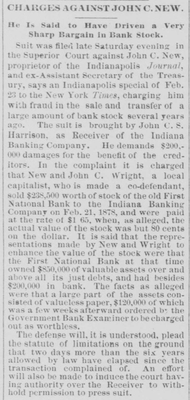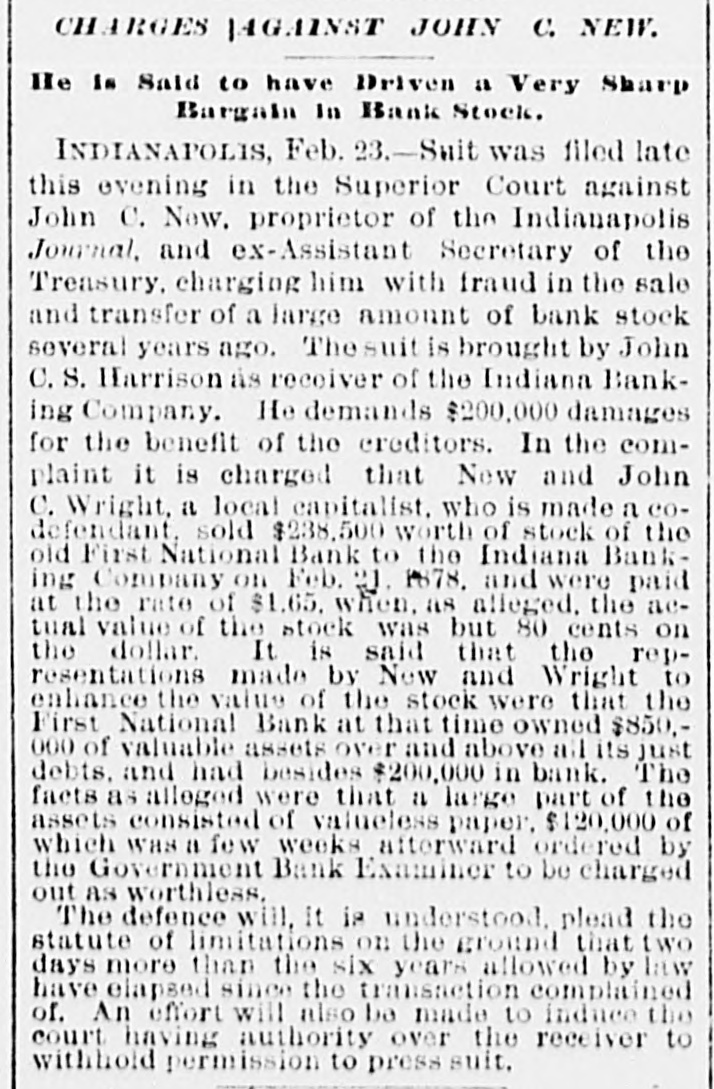 CHARGES AGAINST JOHN C. NEW. He Is Said to Have Driven a Very Sharp Bargain in Bank Stock. Suit was filed late Saturday evening in the Superior Court against John C. New, proprietor of the Indianapolis Journal, and ex-Assistant Secretary of the Treasury, says an Indianapolis special of Feb. 23 to the New York Times, charging him with fraud in the sale and transfer of a large amount of bank stock several years ago. The suit is brought by John C.S. Harrison, as Receiver of the Indiana Banking Company. He demands $200,000 damages for the benefit of the creditors. In the complaint it is charged that New and John C. Wright, a local capitalist, who is made a co-defendant, sold $238,500 worth of stock of the old First National Bank to the Indiana Banking Company on Feb. 21. 1878, and were paid at the rate of $1 65, when, as alleged, the actual value of the stock was but 80 cents on the dollar. It is said that the representations made by New and Wright to enhance the value of the stock were that the First National Bank at that time owned $850,000 of valuable assets over and above all its just debts, and had besides $200,000 in bank. The facts as alleged were that a large part of the assets consisted of valueless paper, $120,000 of which was a few weeks afterward ordered by the Government Bank Examiner to be charged out as worthless. The defense will, it is understood, plead the statute of limitations on the ground that two days more than the six years allowed by law have elapsed since the transaction complained of. An effort will also be made to induce the court having authority over the Receiver to withhold permission to press suit.