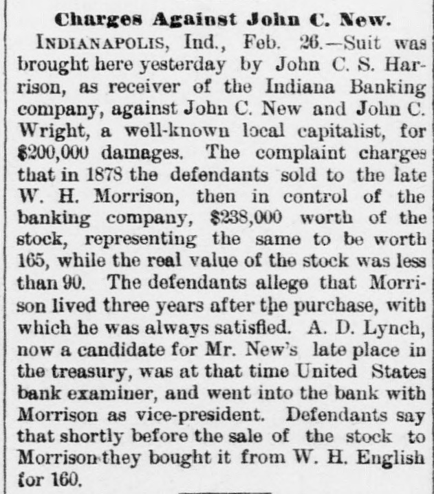 Charges Against John C. New. INDIANAPOLIS, Ind., Feb. 26.-Suit was brought here yesterday by John C. S. Harrison, as receiver of the Indiana Banking company, against John C. New and John C. Wright, a well-known local capitalist, for $200,000 damages. The complaint charges that in 1878 the defendants sold to the late W. H. Morrison, then in control of the banking company, $238,000 worth of the stock, representing the same to be worth 165, while the real value of the stock was less than 90. The defendants allege that Morrison lived three years after the purchase, with which he was always satisfied. A. D. Lynch, now a candidate for Mr. New's late place in the treasury, was at that time United States bank examiner, and went into the bank with Morrison as vice-president. Defendants say that shortly before the sale of the stock to Morrison-they bought it from W. H. English for 160.
