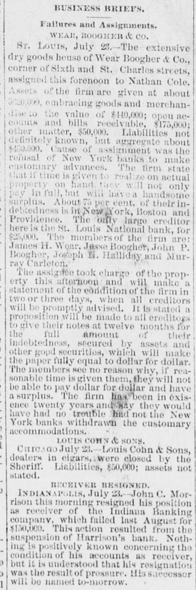 BUSINESS BRIEFS. Failures and Assignments. WEAR, BOOGHER & CO. Sr. LOUIS, July 23.-The extensive dry goods house of Wear Boogher & Co., corner of Sixth and St. Charles streets, assigned this forenoon to Nathan Cole. Assets of the firm are given at about $020,000, embracing goods and merchandise to the value of $440,000; open accounts and bills receivable, $175,000; other matter, $50,000. Liabilities not definitely known, but aggregate about $450,000. Cause of assignment was the refusal of New York banks to make customary advances. The firm state that if time is given to realize on actual property on hand. they will not only pay in full, but will havea handsome surplus. About 75 per cent. of their indebtedness is in New ork, Boston and Providence. The only large creditor here is the St. Louis National bank, for $25,000. The members of the firm are: James H. Wear, Jesse Boogher, John P. Boogher, Joseph H. Halliday and Murray Carleton. The assignee took charge of the property this afternoon and will make a statement of the condition of the firm in two or three days, when all creditors will be promptly advised. It is stated a proposition will be made to all creditors to give their notes at twelve months for the full amount of their indebtedness, secured by assets and other good securities, which will make the paper fully equal to dollar for dollar. The members see no reason why, if reasonable time is given them, they will not be able to pay dollar for dollar and have a surplus. The firm has been in éxisence twenty years and say they would have had no trouble had not the New York banks withdrawn the customary accommodations. LOUIS COHN & SONS. CHICAGO July 23.-Louis Cohn & Sons, dealers in cigars, were closed by the Sheriff. Liabilities, $50,000; assets not stated. RECEIVER RESIGNED. INDIANAPOLIS, July 23.-John C. Morrison this morning resigned his position as receiver of the Indiana Banking company, which failed last August for $150,000. This action resulted from the suspension of Harrison's bank. Nothing is positively known concerning the condition of his accounts as receiver, but it is understood that his resignation was the result of pressure. His successor will be named to-morrow.