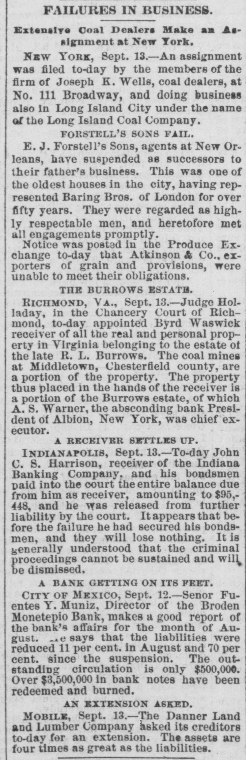 FAILURES IN BUSINESS. Extensive Coal Dealers Make an Assignment at New York. NEW YORK, Sept. 13.-An assignment was filed to-day by the members of the firm of Joseph K. Wells, coal dealers, at No. 111 Broadway, and doing business also in Long Island City under the name of the Long Island Coal Company. FORSTELL'S SONS FAIL. E. J. Forstell's Sons, agents at New Orleans, have suspended as successors to their father's business. This was one of the oldest houses in the city, having represented Baring Bros. of London for over fifty years. They were regarded as highly respectable men, and heretofore met all engagements promptly. Notice was posted in the Produce Exchange to-day that Atkinson & Co., exporters of grain and provisions, were unable to meet their obligations. THE BURROWS ESTATE. RICHMOND, VA., Sept. 13.-Judge Holladay, in the Chancery Court of Richmond, to-day appointed Byrd Waswick receiver of all the real and personal property in Virginia belonging to the estate of the late R. L. Burrows. The coal mines at Middletown, Chesterfield county, are a portion of the property. The property thus placed in the hands of the receiver is a portion of the Burrows estate, of which A. S. Warner, the absconding bank President of Albion, New York, was chief executor. A RECEIVER SETTLES UP. INDIANAPOLIS, Sept. 13.-To-day John C. S. Harrison, receiver of the Indiana Banking Company. and his bondsmen paid into the court the entire balance due from him as receiver, amounting to $95,448, and he was released from further liability by the court. Itappears that before the failure he had secured his bondsmen, and they will lose nothing. It is generally understood that the criminal proceedings cannot be sustained and will be dismissed. A BANK GETTING ON ITS FEET. CITY OF MEXICO, Sept. 12.-Senor Fuentes Y. Muniz, Director of the Broden Monetepio Bank, makes a good report of the bank's affairs for the month of August. at says that the liabilities were reduced 11 per cent. in August and 70 per cent. since the suspension. The outstanding circulation is only $500,000. Over $3,500,000 in bank notes have been redeemed and burned. AN EXTENSION ASKED. MOBILE, Sept. 13.-The Danner Land and Lumber Company asked its creditors to-day for an extension. The assets are four times as great as the liabilities.