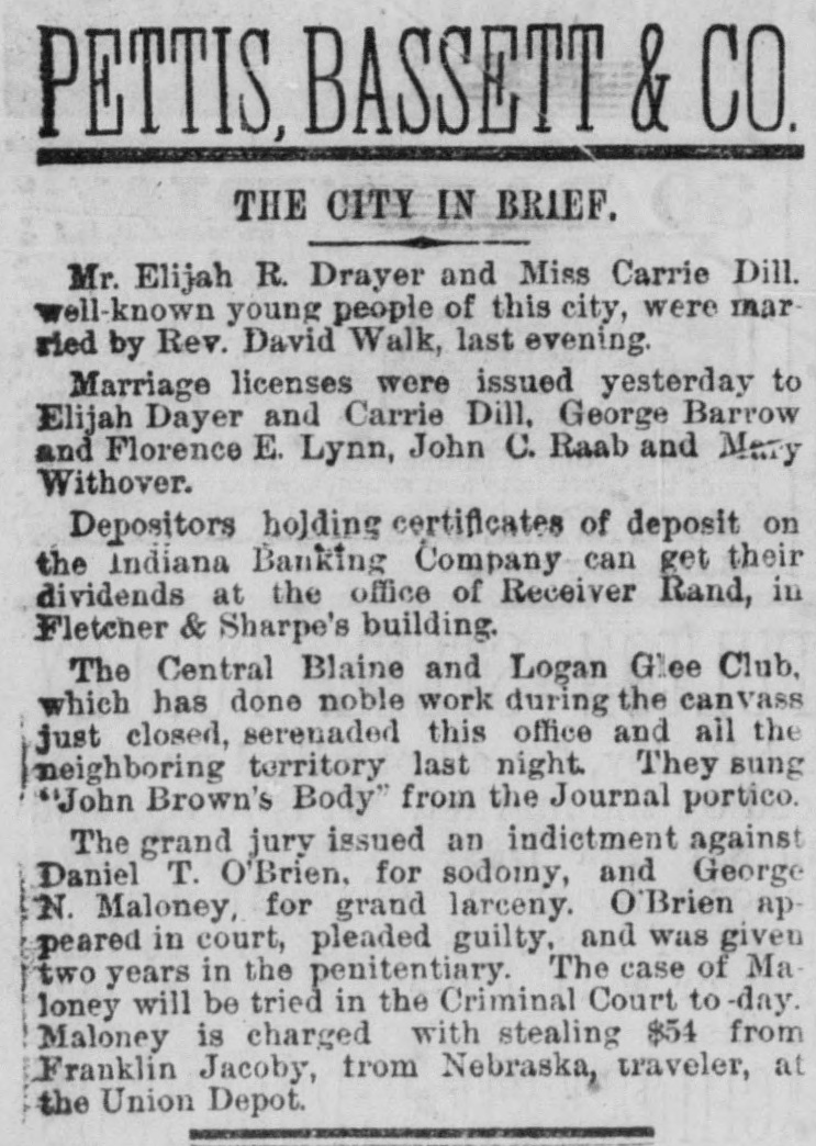 PETTIS, BASSETT & CO. THE CITY IN BRIEF. Mr. Elijah R. Drayer and Miss Carrie Dill, well-known young people of this city, were married by Rev. David Walk, last evening. Marriage licenses were issued yesterday to Elijah Dayer and Carrie Dill, George Barrow and Florence E. Lynn, John C. Raab and Mary Withover. Depositors holding certificates of deposit on the Indiana Banking Company can get their dividends at the office of Receiver Rand, in Fletcher & Sharpe's building. The Central Blaine and Logan Glee Club, which has done noble work during the canvass just closed, serenaded this office and all the neighboring territory last night. They sung "John Brown's Body" from the Journal portico. The grand jury issued an indictment against Daniel T. O'Brien, for sodomy, and George N. Maloney, for grand larceny. O'Brien appeared in court, pleaded guilty, and was given two years in the penitentiary. The case of Maloney will be tried in the Criminal Court to-day. Maloney is charged with stealing $54 from Franklin Jacoby, from Nebraska, traveler, at the Union Depot.