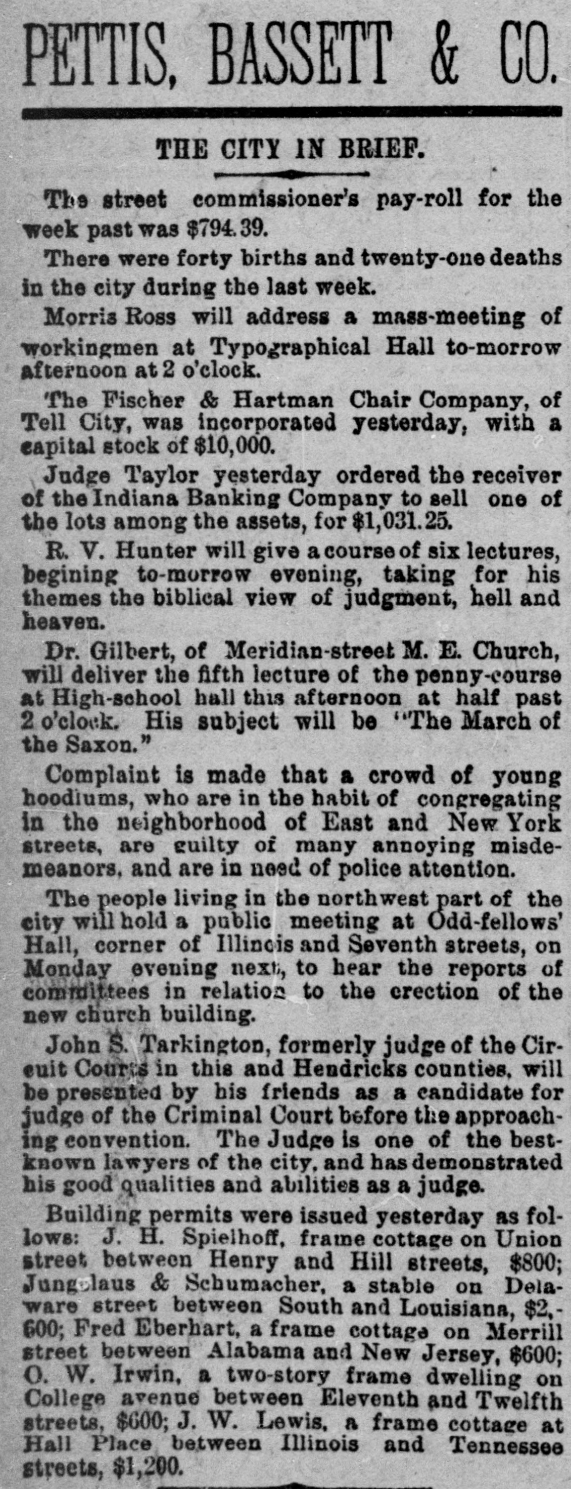 # THE CITY IN BRIEF. The street commissioner's pay-roll for the week past was $794.39. There were forty births and twenty-one deaths in the city during the last week. Morris Ross will address a mass-meeting of workingmen at Typographical Hall to-morrow afternoon at 2 o'clock. The Fischer & Hartman Chair Company, of Tell City, was incorporated yesterday, with a capital stock of $10,000. Judge Taylor yesterday ordered the receiver of the Indiana Banking Company to sell one of the lots among the assets, for $1,031.25. R. V. Hunter will give a course of six lectures, begining to-morrow evening, taking for his themes the biblical view of judgment, hell and heaven. Dr. Gilbert, of Meridian-street M. E. Church, will deliver the fifth lecture of the penny-course at High-school hall this afternoon at half past 2 o'clock. His subject will be "The March of the Saxon." Complaint is made that a crowd of young hoodiums, who are in the habit of congregating in the neighborhood of East and New York streets, are guilty of many annoying misdemeanors, and are in need of police attention. The people living in the northwest part of the city will hold a public meeting at Odd-fellows' Hall, corner of Illinois and Seventh streets, on Monday evening next, to hear the reports of committees in relation to the crection of the new church building. John S. Tarkington, formerly judge of the Circuit Courts in this and Hendricks counties, will be presented by his friends as a candidate for judge of the Criminal Court before the approaching convention. The Judge is one of the best-known lawyers of the city, and has demonstrated his good qualities and abilities as a judge. Building permits were issued yesterday as follows: J. H. Spielhoff, frame cottage on Union street between Henry and Hill streets, $800; Jungelaus & Schumacher, a stable on Delaware street between South and Louisiana, $2,600; Fred Eberhart, a frame cottage on Merrill street between Alabama and New Jersey, $600; O. W. Irwin, a two-story frame dwelling on College avenue between Eleventh and Twelfth streets, $600; J. W. Lewis, a frame cottage at Hall Place between Illinois and Tennessee streets, $1,200.
