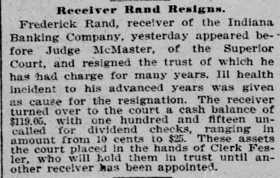 # Receiver Rand Resigns. Frederick Rand, receiver of the Indiana Banking Company, yesterday appeared before Judge McMaster, of the Superior Court, and resigned the trust of which he has had charge for many years. Ill health incident to his advanced years was given as cause for the resignation. The receiver turned over to the court a cash balance of $119.05, with one hundred and fifteen uncalled for dividend checks, ranging in amount from 10 cents to $25. These assets the court placed in the hands of Clerk Fesler, who will hold them in trust until another receiver has been appointed.