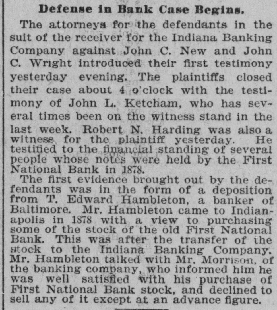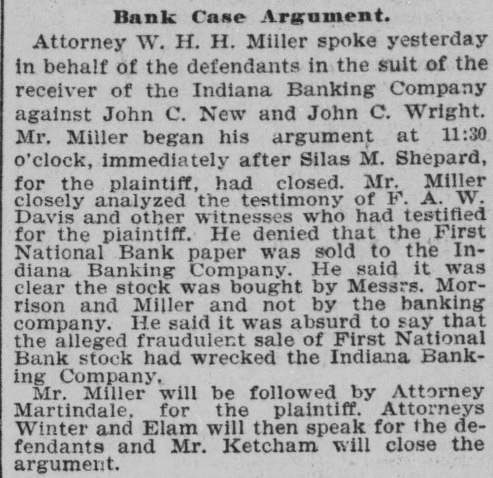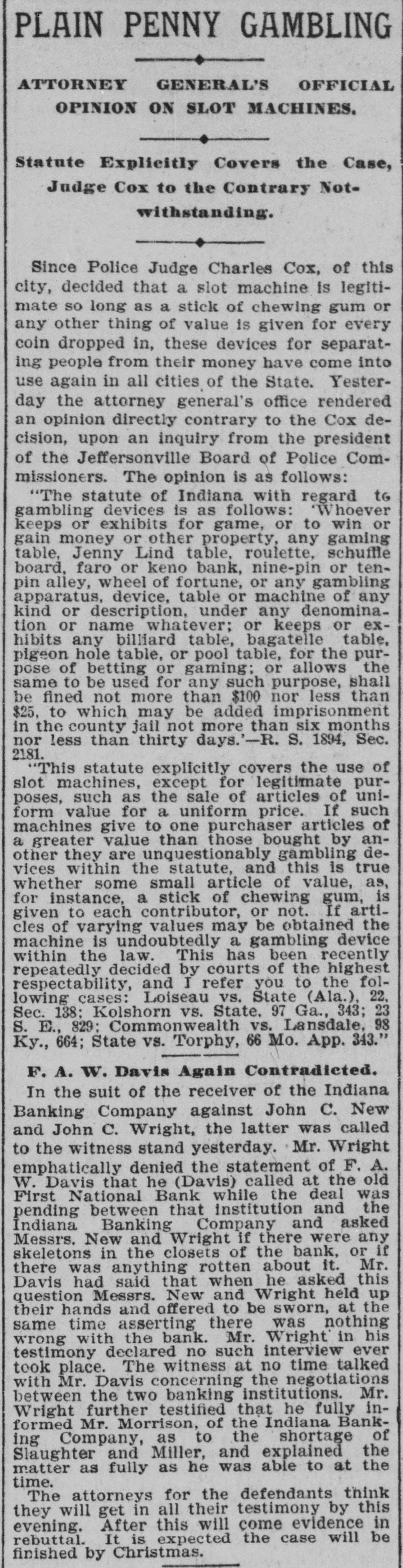 PLAIN PENNY GAMBLING ATTORNEY GENERAL'S OFFICIAL OPINION ON SLOT MACHINES. Statute Explicitly Covers the Case, Judge Cox to the Contrary Notwithstanding. Since Police Judge Charles Cox, of this city, decided that a slot machine is legitimate so long as a stick of chewing gum or any other thing of value is given for every coin dropped in, these devices for separating people from their money have come into use again in all cities of the State. Yesterday the attorney general's office rendered an opinion directly contrary to the Cox decision, upon an inquiry from the president of the Jeffersonville Board of Police Commissioners. The opinion is as follows: "The statute of Indiana with regard to gambling devices is as follows: 'Whoever keeps or exhibits for game, or to win or gain money or other property, any gaming table, Jenny Lind table, roulette, schuffle board, faro or keno bank, nine-pin or tenpin alley, wheel of fortune, or any gambling apparatus, device, table or machine of any kind or description, under any denomination or name whatever; or keeps or exhibits any billiard table, bagatelle table, pigeon hole table, or pool table, for the purpose of betting or gaming; or allows the same to be used for any such purpose, shall be fined not more than $100 nor less than $25, to which may be added imprisonment in the county jail not more than six months nor less than thirty days.'-R. S. 1894, Sec. 2181. "This statute explicitly covers the use of slot machines, except for legitimate purposes, such as the sale of articles of uniform value for a uniform price. If such machines give to one purchaser articles of a greater value than those bought by another they are unquestionably gambling devices within the statute, and this is true whether some small article of value, as, for instance, a stick of chewing gum, is given to each contributor, or not. If articles of varying values may be obtained the machine is undoubtedly a gambling device within the law. This has been recently repeatedly decided by courts of the highest respectability, and I refer you to the following cases: Loiseau vs. State (Ala.), 22, Sec. 138; Kolshorn vs. State. 97 Ga., 343; 23 S. E., 829: Commonwealth vs. Lansdale. 98 Ky., 664; State vs. Torphy, 66 Mo. App. 343." F. A. W. Davis Again Contradicted. In the suit of the receiver of the Indiana Banking Company against John C. New and John C. Wright, the latter was called to the witness stand yesterday. Mr. Wright emphatically denied the statement of F. A. W. Davis that he (Davis) called at the old First National Bank while the deal was pending between that institution and the Indiana Banking Company and asked Messrs. New and Wright if there were any skeletons in the closets of the bank, or if there was anything rotten about it. Mr. Davis had said that when he asked this question Messrs. New and Wright held up their hands and offered to be sworn, at the same time asserting there was nothing wrong with the bank. Mr. Wright in his testimony declared no such interview ever took place. The witness at no time talked with Mr. Davis concerning the negotiations between the two banking institutions. Mr. Wright further testified that he fully informed Mr. Morrison, of the Indiana Banking Company, as to the shortage of Slaughter and Miller, and explained the matter as fully as he was able to at the time. The attorneys for the defendants think they will get in all their testimony by this evening. After this will come evidence in rebuttal. It is expected the case will be finished by Christmas.