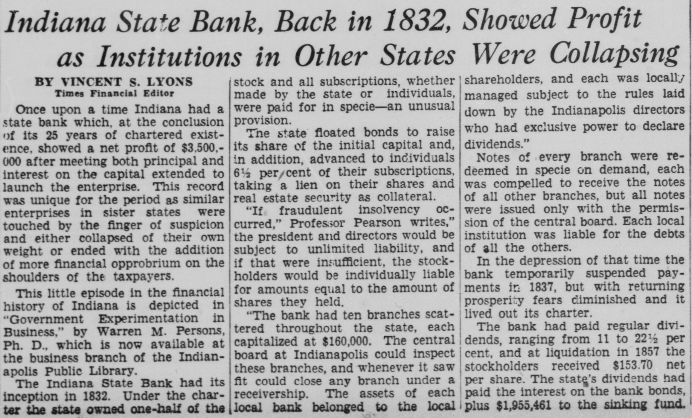 Indiana State Bank, Back in 1832, Showed Profit as Institutions in Other States Were Collapsing shareholders, and each was locally BY VINCENT S. LYONS stock and all subscriptions, whether Times Financial Editor made by the state or individuals, managed subject to the rules laid were paid for in specie-an unusual Once upon a time Indiana had a down by the Indianapolis directors provision. state bank which, at the conclusion who had exclusive power to declare The state floated bonds to raise of its 25 years of chartered existdividends." its share of the initial capital and, ence, showed a net profit of $3,500,Notes of every branch were rein addition, advanced to individuals 000 after meeting both principal and deemed in specie on demand, each 6½ per/cent of their subscriptions, interest on the capital extended to was compelled to receive the notes taking a lien on their shares and launch the enterprise. This record of all other branches, but all notes real estate security as collateral. was unique for the period as similar were issued only with the permis"If fraudulent insolvency OCenterprises in sister states were sion of the central board. Each local curred," Professor Pearson writes," touched by the finger of suspicion institution was liable for the debts the president and directors would be and either collapsed of their own of all the others. subject to unlimited liability, and weight or ended with the addition In the depression of that time the if that were insufficient, the stockof more financial opprobrium on the bank temporarily suspended payholders would be individually liable shoulders of the taxpayers. ments in 1837, but with returning for amounts equal to the amount of This little episode in the financial prosperity fears diminished and it shares they held. history of Indiana is depicted in lived out its charter. "The bank had ten branches scat"Government Experimentation in The bank had paid regular divitered throughout the state, each Business," by Warren M. Persons, dends, ranging from 11 to 22½ per capitalized at $160,000. The central Ph. D., which is now available at cent, and at liquidation in 1857 the board at Indianapolis could inspect the business branch of the Indianstockholders received $153.70 net these branches, and whenever it saw apolis Public Library. per share. The state's dividends had fit could close any branch under a The Indiana State Bank had its paid the interest on the bank bonds, receivership. The assets of each inception in 1832. Under the charplus $1,955,461 to the sinking fund. local bank belonged to the local ter the state owned one-half of the