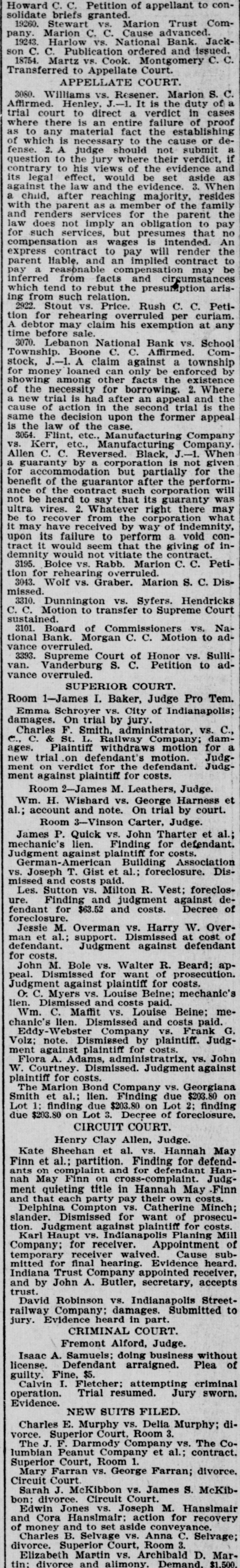 Howard C. C. Petition of appellant to consolidate briefs granted. 19260. Stewart vs. Marion Trust Company. Marion C. C. Cause advanced. 19243. Harlow VS. National Bank. Jackson C. C. Publication ordered and issued. 18754. Martz vs. Cook. Montgomery C. C. Transferred to Appellate Court. APPELLATE COURT. 3080. Williams vs. Resener. Marion S. C. Affirmed. Henley, J.-1. It is the duty of a trial court to direct a verdict in cases where there is an entire failure of proof as to any material fact the establishing of which is necessary to the cause or defense. 2. A judge should not submit a question to the jury where their verdict, if contrary to his views of the evidence and its legal effect, would be set aside as against the law and the evidence. 3. When a child, after reaching majority, resides with the parent as a member of the family and renders services for the parent the law does not imply an obligation to pay for such services, but presumes that no compensation as wages is intended. An express contract to pay will render the parent liable, and an implied contract to pay a reasonable compensation may be inferred from facts and circumstances which tend to rebut the presumption arising from such relation. 2922. Stout VS. Price. Rush C. C. Petition for rehearing overruled per curiam. A debtor may claim his exemption at any time before sale. 3070. Lebanon National Bank vs. School Township. Boone C. C. Affirmed. Comstock, J.-1. A claim against a township for money loaned can only be enforced by showing among other facts the existence of the necessity for borrowing. 2. Where a new trial is had after an appeal and the cause of action in the second trial is the same the decision upon the former appeal is the law of the case. 3054. Flint, etc., Manufacturing Company vs. Kerr, etc., Manufacturing Company. Allen C. C. Reversed. Black, J.-1. When a guaranty by a corporation is not given for accommodation but partially for the benefit of the guarantor after the performance of the contract such corporation will not be heard to say that its guaranty was ultra vires. 2. Whatever right there may be to recover from the corporation what it may have received by way of indemnity, upon its failure to perform a void contract it would seem that the giving of indemnity would not vitiate the contract. 3195. Boice vs. Rabb. Marion C. C. Petition for rehearing overruled. 3043. Wolf vs. Graber. Marion S. C. Dismissed. 3310. Dunnington vs. Syfers. Hendricks C. C. Motion to transfer to Supreme Court sustained. 3101. Board of Commissioners vs. National Bank. Morgan C. C. Motion to advance overruled. 3393. Supreme Court of Honor vs. Sullivan. Vanderburg S. C. Petition to advance overruled. SUPERIOR COURT. Room 1-James I. Baker, Judge Pro Tem. Emma Schroyer vs. City of Indianapolis; damages. On trial by jury. Charles F. Smith, administrator, VS. C., C., C. & St. L. Railway Company; damages. Plaintiff withdraws motion for a new trial on defendant's motion. Judgment on verdict for the defendant. Judgment against plaintiff for costs. Room 2-James M. Leathers, Judge. Wm. H. Wishard VS. George Harness et al.; account and note. On trial by court. Room 3-Vinson Carter, Judge. James P. Quick vs. John Tharter et al.; mechanic's lien. Finding for defendant. Judgment against plaintiff for costs. German-American Building Association vs. Joseph T. Gist et al.; foreclosure. Dismissed and costs paid. Les. Sutton vs. Milton R. Vest; foreclosure. Finding and judgment against defendant for $63.52 and costs. Decree of foreclosure. Jessie M. Overman VS. Harry W. Overman et al.; support. Dismissed at cost of defendant. Judgment against defendant for costs. John M. Bole vs. Walter R. Beard; appeal. Dismissed for want of prosecution. Judgment against plaintiff for costs. O: C. Myers vs. Louise Beine; mechanic's lien. Dismissed and costs paid. Wm. C. Maffit vs. Louise Beine: mechanic's lien. Dismissed and costs paid. Eddy-Webster Company vs. Frank G. Volz; note. Dismissed by plaintiff. Judgment against plaintiff for costs. Flora A. Adams, administratrix, vs. John W. Courtney. Dismissed. Judgment against plaintiff for costs. The Marion Bond Company vs. Georgiana Smith et al.; lien. Finding due $203.80 on Lot 1: finding due $203.80 on Lot 2; finding due $203.80 on Lot 3. Decree of foreclosure. CIRCUIT COURT. Henry Clay Allen, Judge. Kate Sheehan et al. vs. Hannah May Finn et al.; partition. Finding for defendants on complaint and for defendant Hannah May Finn on cross-complaint. Judgment quieting title in Hannah May Finn and that each party pay their own costs. Delphina Compton vs. Catherine Minch; slander. Dismissed for want of prosecution. Judgment against plaintiff for costs. Karl Haupt vs. Indianapolis Planing Mill Company; for receiver. Appointment of temporary receiver waived. Cause submitted for final hearing. Evidence heard. Indiana Trust Company appointed receiver, and by John A. Butler, secretary, accepts trust. David Robinson vs. Indianapolis Streetrailway Company; damages. Submitted to jury. Evidence heard in part. CRIMINAL COURT. Fremont Alford, Judge. Isaac A. Samuels; doing business without license. Defendant arraigned. Plea of guilty. Fine, $5. Calvin I. Fletcher; attempting criminal operation. Trial resumed. Jury sworn. Evidence. NEW SUITS FILED. Charles E. Murphy VS. Delia Murphy; divorce. Superior Court, Room 3. The J. F. Darmody Company vs. The Columbian Peanut Company et al.; contract. Superior Court, Room 1. Mary Farran vs. George Farran; divorce. Circuit Court. Sarah J. McKibbon vs. James S. McKibbon; divorce. Circuit Court. Edwin Jones vs. Joseph M. Hanslmair and Cora Hanslmair: action for recovery of money and to set aside conveyance. Charles B. Selvage vs. Anna C. Selvage; divorce. Superior Court, Room 3. Elizabeth Martin vs. Archibald D. Martin: divorce and alimony. Demand. $1,500.