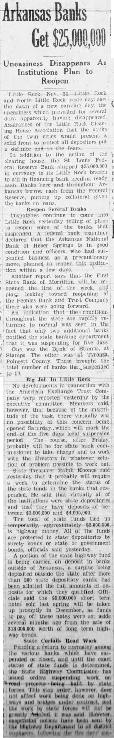 Uneasiness Disappears As Institutions Plan to Reopen Nov Rock Little North Little Rock yesterday banking the the dawn which prevailed for several uneasiness days apparently having disappeared. of the Little Rock ClearAssurances House Association that the banks ing twin cities would present solid front protect all depositors definite end addition the action of the In the St. Louis Fedclearing house, Reserve Bank shipped its Little Rock branch in currency to aid in bank needing ready cash. Banks here and Arkansas borrow cash from the Federal putting up collateral given the banks on Reopen Several Banks Dispatches continue to come into Little Rock yesterday telling of plans some the banks that reopen suspended. federal bank examiner declared that the Arkansas National Bank of Heber Springs in good condition and officers, who had suspended business as precautionary move, planned to reopen this instituwithin Another report that the First State Bank be opened the first the week. and looking toward the Peoples Bank and Trust Company there also were going forward. An indication that the conditions throughout state are rapidly turning to normal seen in the fact that only additional banks notified the state banking department that was suspending five days. One the Bank of Stamps, Stamps. The Tyronza, Poinsett County These brought the total number of banks that. suspended Big Job Little Rock No in connection with the American Exchange Trust Comreported yesterday by the pany were executive committee. Members said, however, that because of the magnitude the task, there virtually was possibility of this concern being opened Saturday. will mark the the five days legal suspension period The Friday, probably will be for state bank missioner to take charge and to work with the in solution of problem to work out. State Ralph Koonce yesterday that it probably will require week determine the status the state funds in the banks that susHe said that virtually all of the institutions were state depositories and that they have deposits of between and The total state funds tied temporarily, approximately highway All of the funds are protected in state depositories by surety bonds or state government officials said portion of the state highway fund A being carried on deposit in banks outside Arkansas, surplus being deposited outside the state after more than 200 state depository banks had been allotted the full amounts of posits for which they Officials said the short term notes sold last spring will be taken up promptly in funds to off these notes were set aside pay several ago from the sale worth of long term highway bonds. State Curtails Road Work Pending return normaley among the various banks which have pended or closed, and until the exact status state funds the State Highway has issued orders suspending work on by state This stop does not affect work being done on and bridges under and work state forces will greatly was said However, suspension have been sent the Highway Department to district