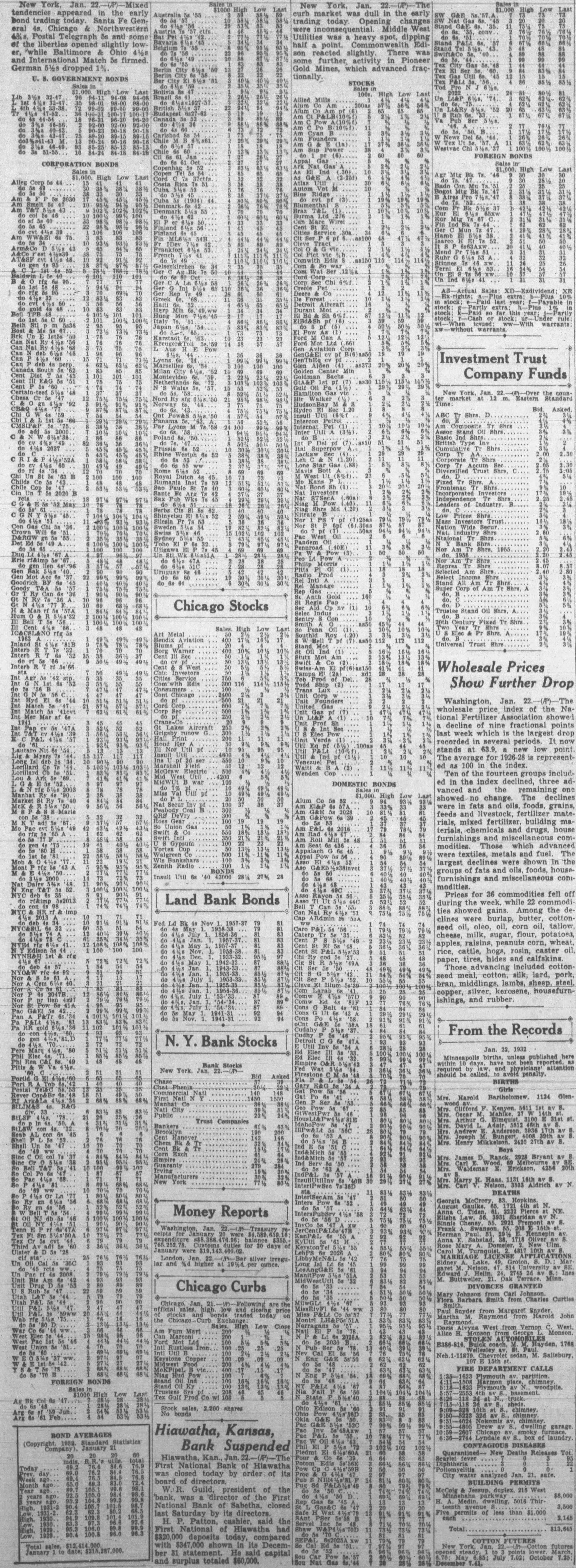 Land Bank Bonds Money Reports New York, Jan. The curb market was dull in the early trading today. Opening changes were Middle West Utilities was heavy spot, dipping half point. Commonwealth Edireacted There activity in Pioneer Gold Mines, which advanced fraç- tionally. Last STOCKS Last warrants. Investment Trust Company Funds Trust Chicago Stocks Century Fixed Wholesale Prices Show Further Drop Washington, Jan. 22. wholesale price index of the National Fertilizer Association showed decline of nine fractional points last week which is the largest recorded in several periods. It now stands at low point The average for is representas 100 in the index. of the fourteen groups includin the index declined, three adDOMESTIC vanced and the remaining one showed no change. The declines in fats and oils, foods, grains, feeds and livestock, fertilizer materials, mixed fertilizer. building materials, chemicals and drugs, house furnishings and miscellaneous commodities. Those which advanced textiles, metals and fuel. The largest declines were shown in the groups of fats and oils, foods, house. furnishings and miscellaneous conimodities. Prices for 36 commodities fell off during the week, while 22 showed gains. Among the declines were burlap, butter, cottonseed oil, oleo, oil, corn oil, tallow, cheese, milk, sugar, flour, potatoes, apples, raisins, peanuts corn, wheat, rice, cattle, hogs, rosin, caster oil, paper, tires, hides and calfskins. Those advancing included cottonseed meal, cotton, silk, lard, pork, bran, middlings. lambs, sheep, steel, copper, silver, kerosene, housefurnishings, and rubber. From the Records N.Y. Bank Stocks Jan. 22, 1932 births, published here been Stocks attention should be penalty. BIRTHS Girls Bartholomew, Companies Andrew Chicago Curbs Johnson Johnson. 816, FIRE CALLS BONDS basement. shares Hiawatha, Kansas, BOND Bank Suspended CONTAGIOUS Kan. Jan. fever Bank of by order its board of PERMITS Guild, president the was the National Bank of closed Saturday its directors. H. First deposits COTTON FUTURES $347,000 31 totaled