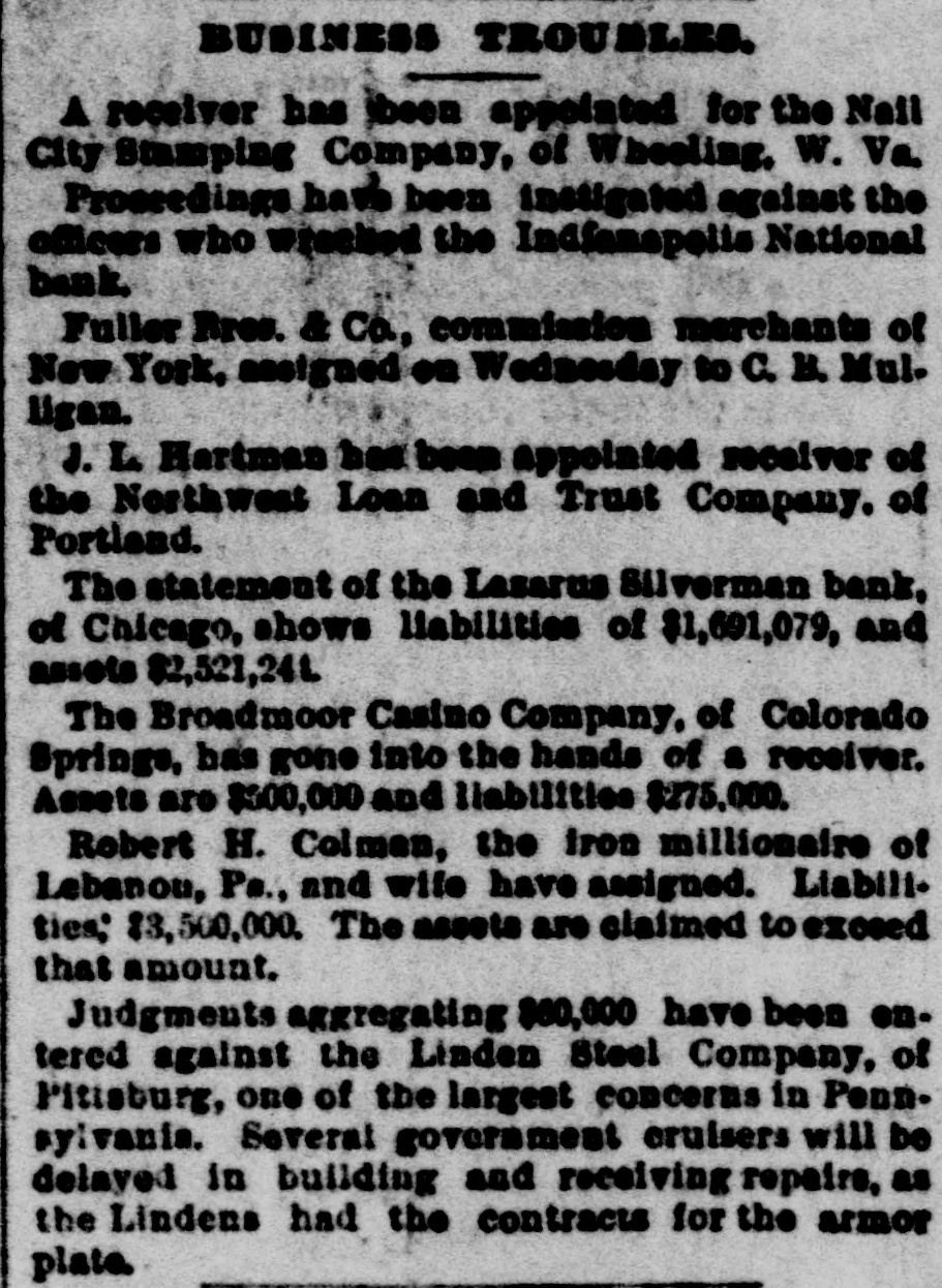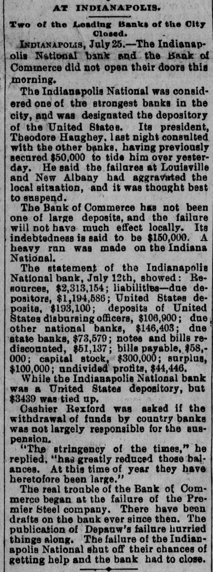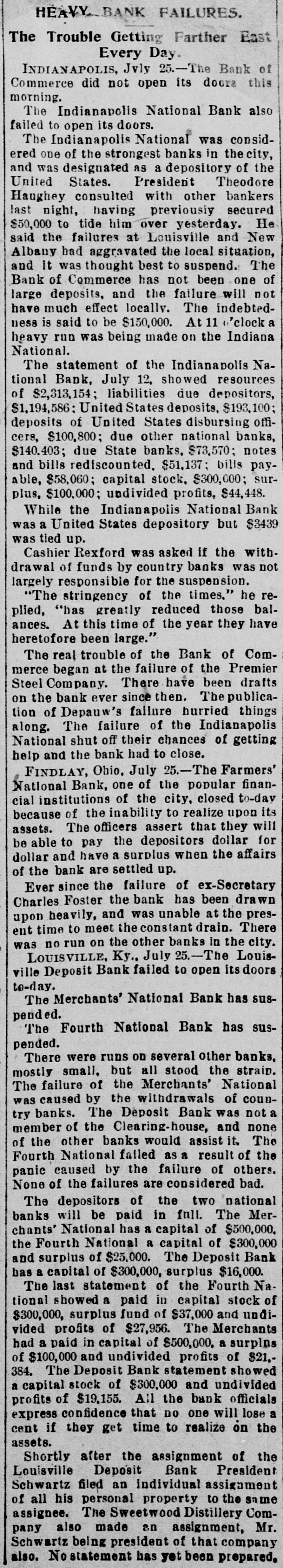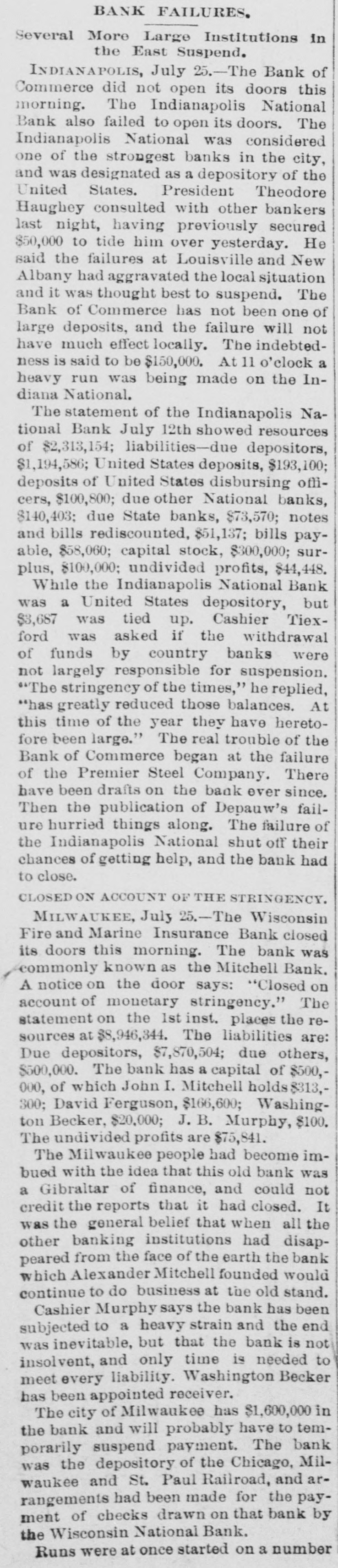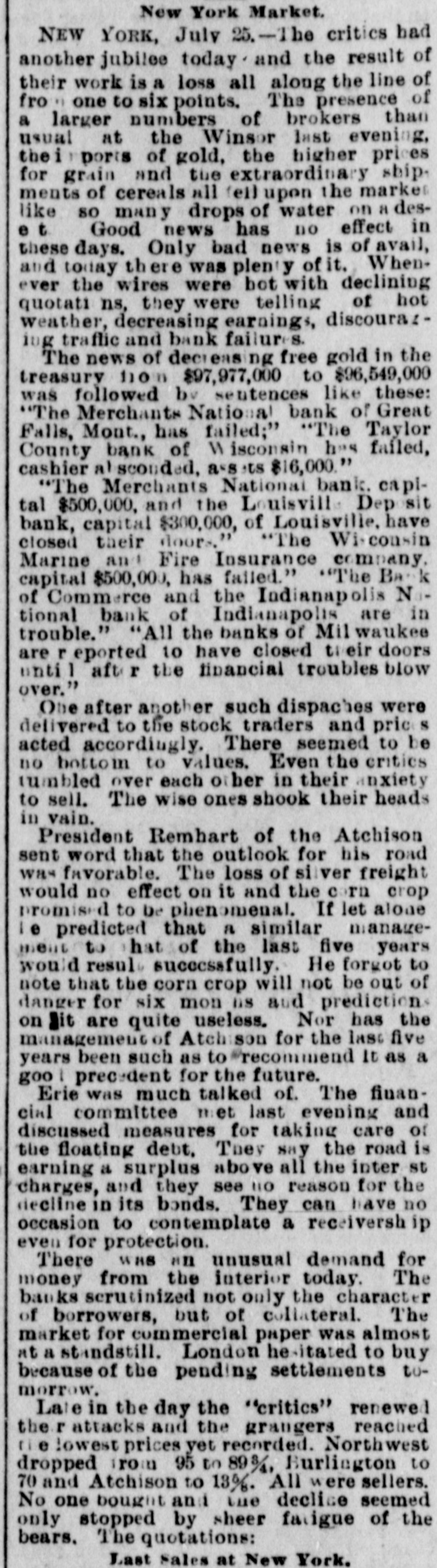New York Market. NEW YORK, July 25.-The critics had another jubilee today and the result of their work is a loss all along the line of fro one to six points. The presence of a larger numbers of brokers than usual at the Winsor last evening, thei ports of gold, the higher prices for grain and the extraordinary shipments of cereals all (ell upon the market like so many drops of water on a deset Good news has no effect in these days. Only bad news is of avail, and today there was plenty of it. Whenever the wires were bot with declining quotati ns, they were telling of hot weather, decreasing earnings, discouraziug traffic and bank failures. The news of decreasir free gold in the treasury non $97,977,000 to $96,549,000 was followed bv sentences like these: "The Merchants National bank of Great Falls, Mont., has failed;" "The Taylor County bank of isconsin has failed, cashier sconded, assets $16,000." "The Merchants National bank. capital $500,000, and the Louisville Dep sit bank, capital $300,000, of Louisville, have closed their doors." "The Wi-consin Marine and Fire Insurance company. capital $500,000, has failed." "The Bank of Commerce and the Indianapolis Notional bank of Indianapolis are in trouble." "All the banks of Mil waukee are r eported to have closed tweir doors until aft. r the financial troubles blow over." One after another such dispaches were delivered to the stock traders and price S acted accordingly. There seemed to be no bottom to values. Even the critics tumbled over each other in their anxiety to sell. The wise ones shook their heads in vain. President Rembart of the Atchison sent word that the outlook for his road was favorable. The loss of silver freight would no effect on it and the corn crop promised to be phenomenal. If let alone le predicted that a similar management to shat of the last five years would resule successfully. He forgot to note that the corn crop will not be out of danger for six mon ns and predictions on Bit are quite useless. Nor has the management of Atchison for the last five years been such as to Precommend It as a goo I precedent for the future. Erie was much talked of. The financial committee met last evening and discussed measures for taking care of the floating debt. They say the road is earning a surplus above all the inter st charges, and they see no reason for the decline in its bonds. They can have no occasion to contemplate a receiversh ip even for protection. There WHS an unusual demand for money from the interior today. The banks scrutinized not only the character of borrowers, but of collateral. The market for commercial paper was almost at a standstill. London he-itated to buy because of the pending settlements tomorrow. Late in the day the "critics" renewed the r attacks and the grangers reached rie lowest prices yet recorded. Northwest dropped from 95 to 89 3/4, Burlington to 70 and Atchison to 13%. All were sellers. No one bought and tue declise seemed only stopped by sheer fatigue of the bears. The quotations: Last Sales at New York.